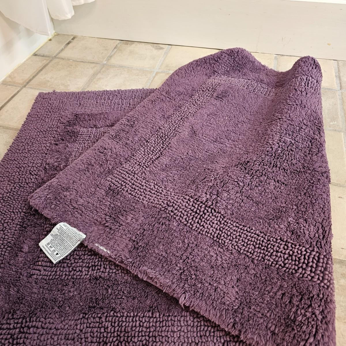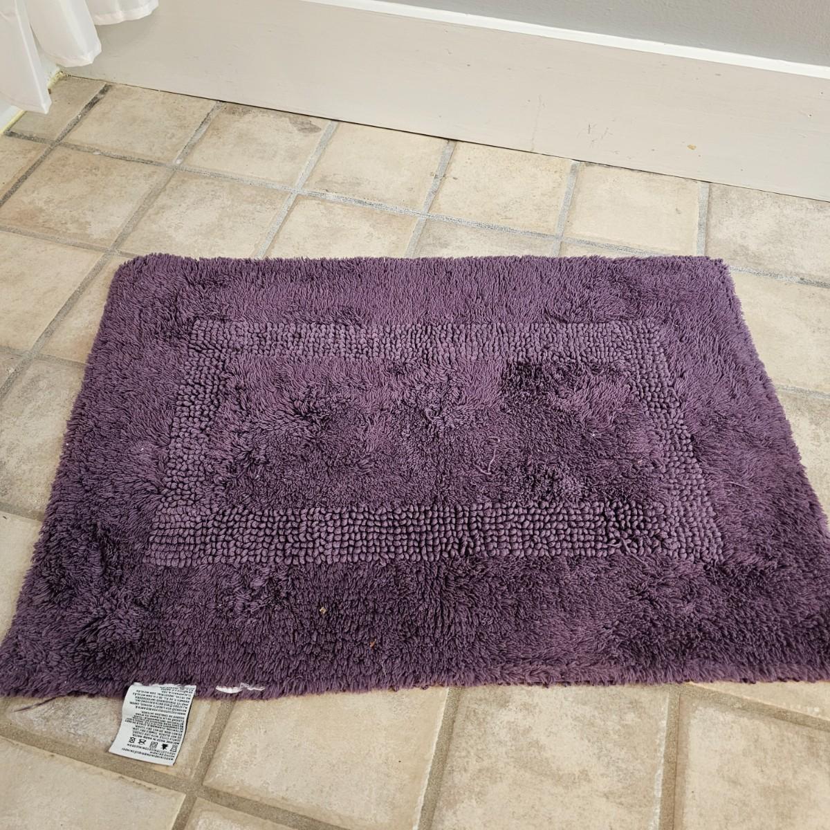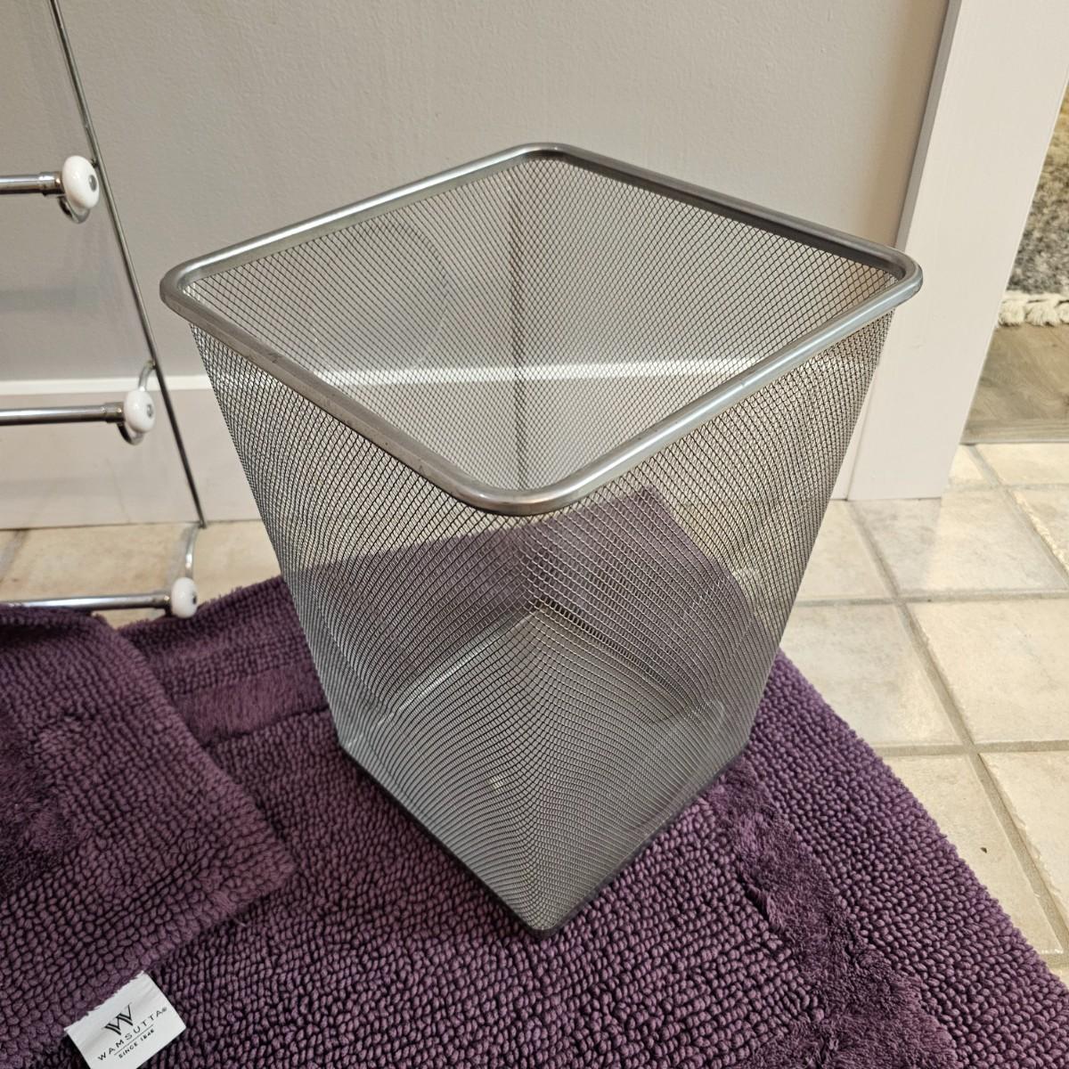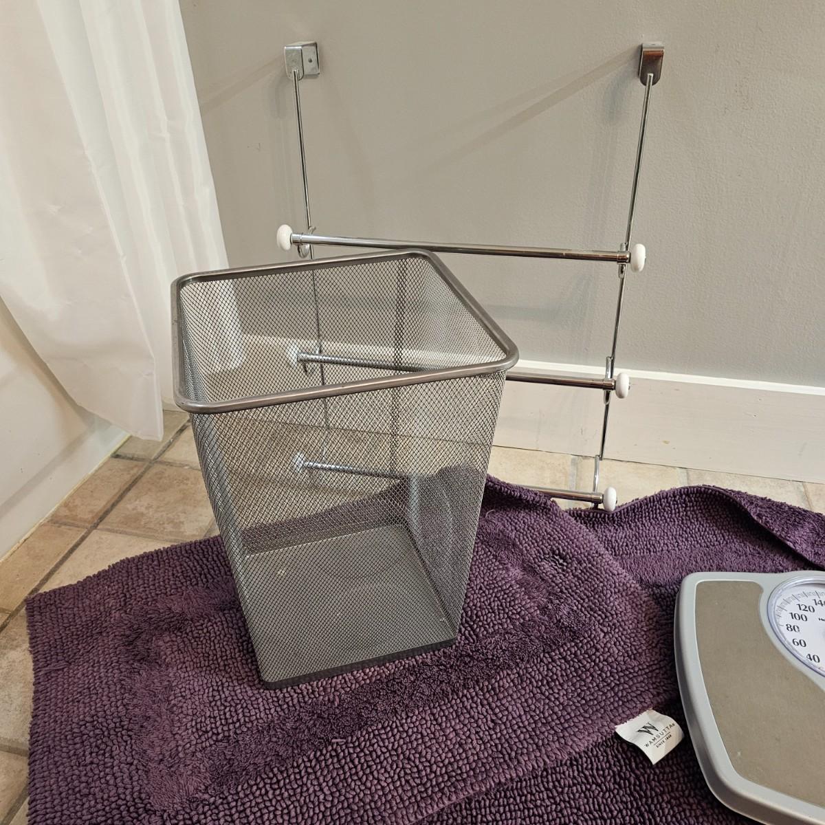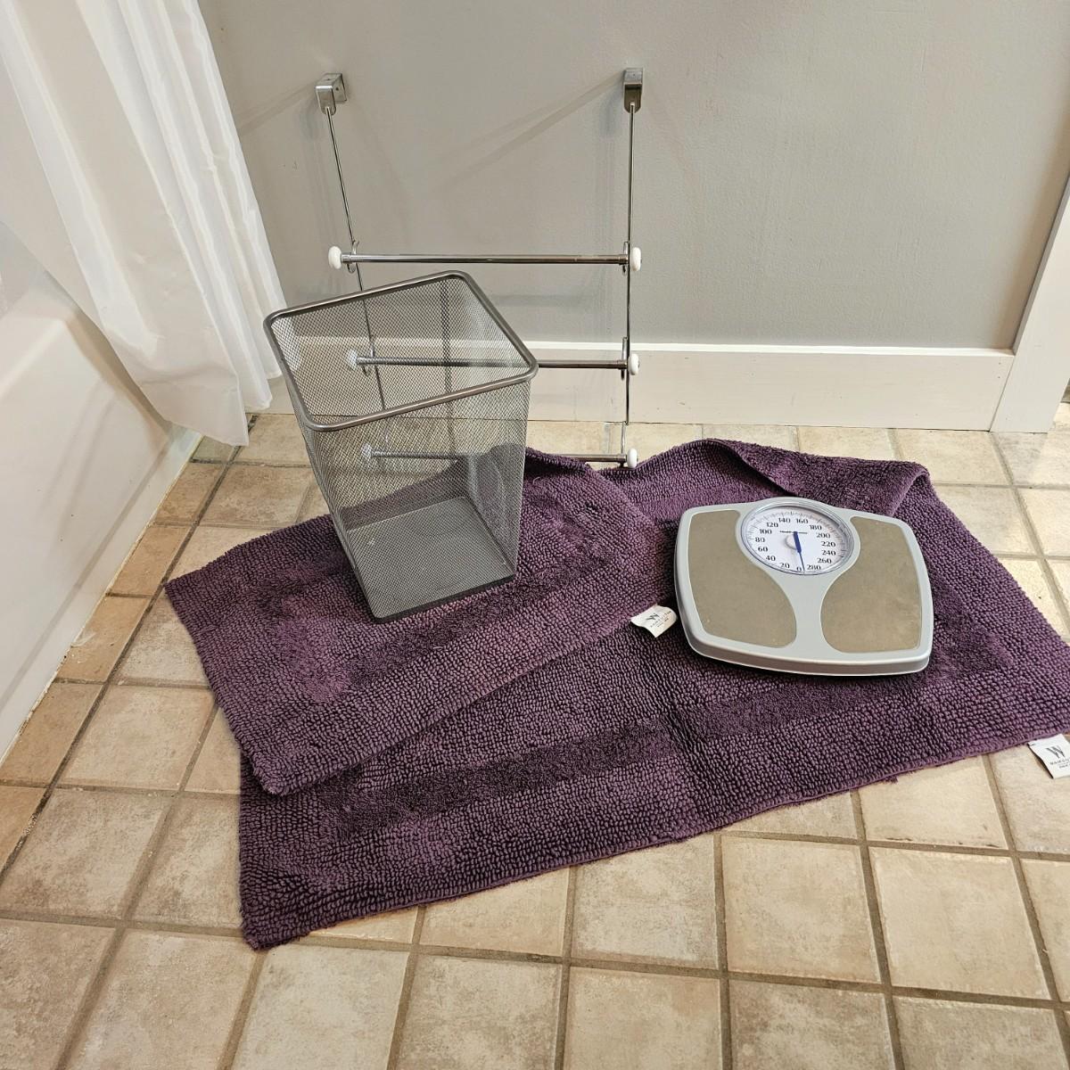 A collection of bath items. A Healthometer scale, Ikea stainless trashcan, hanging towel rack, and two Wamsutta rugs. Rack is 17" x 5" x 22"H, bath mat is 25" x 17", and larger rug is 40" x 24". See photos for details. Shipping available.
