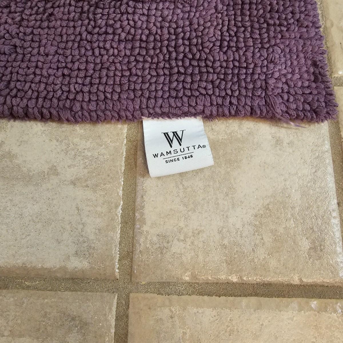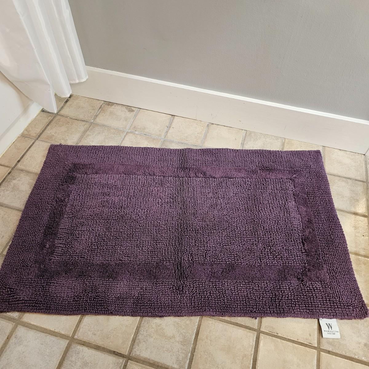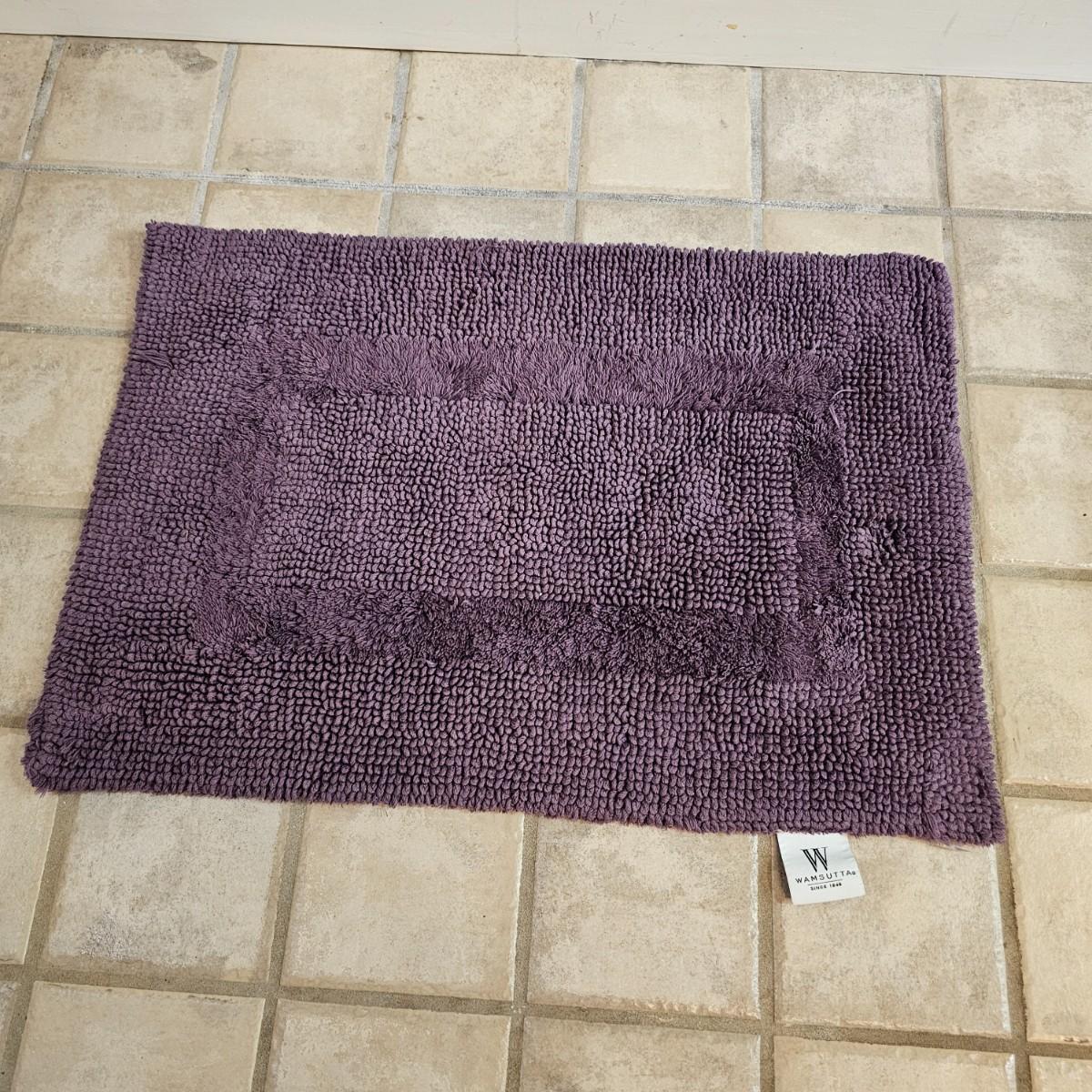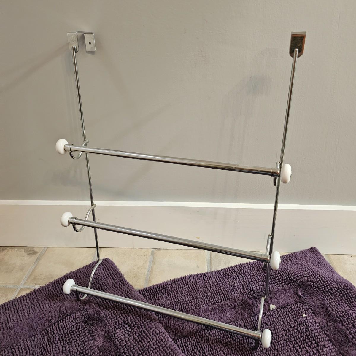 A collection of bath items. A Healthometer scale, Ikea stainless trashcan, hanging towel rack, and two Wamsutta rugs. Rack is 17" x 5" x 22"H, bath mat is 25" x 17", and larger rug is 40" x 24". See photos for details. Shipping available.