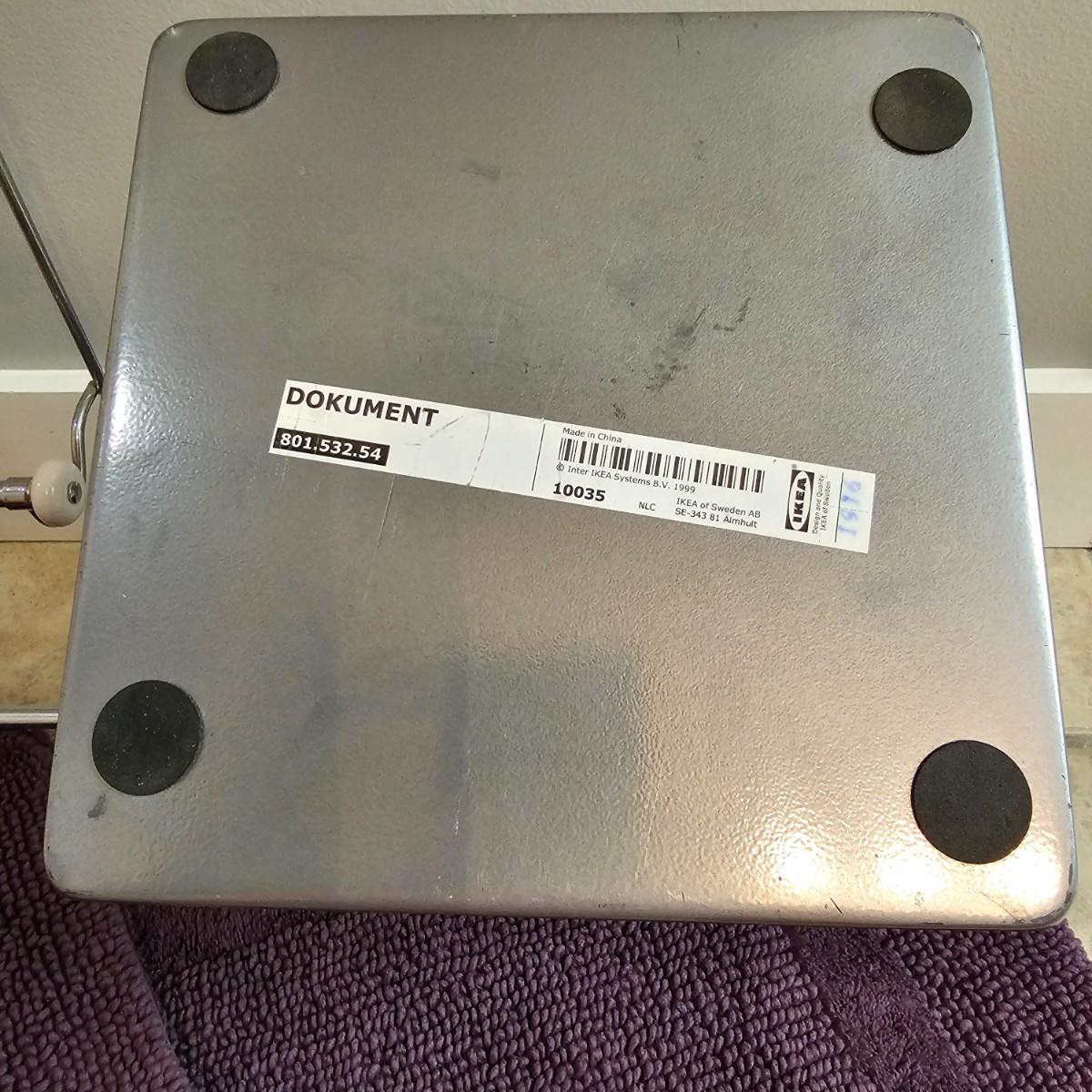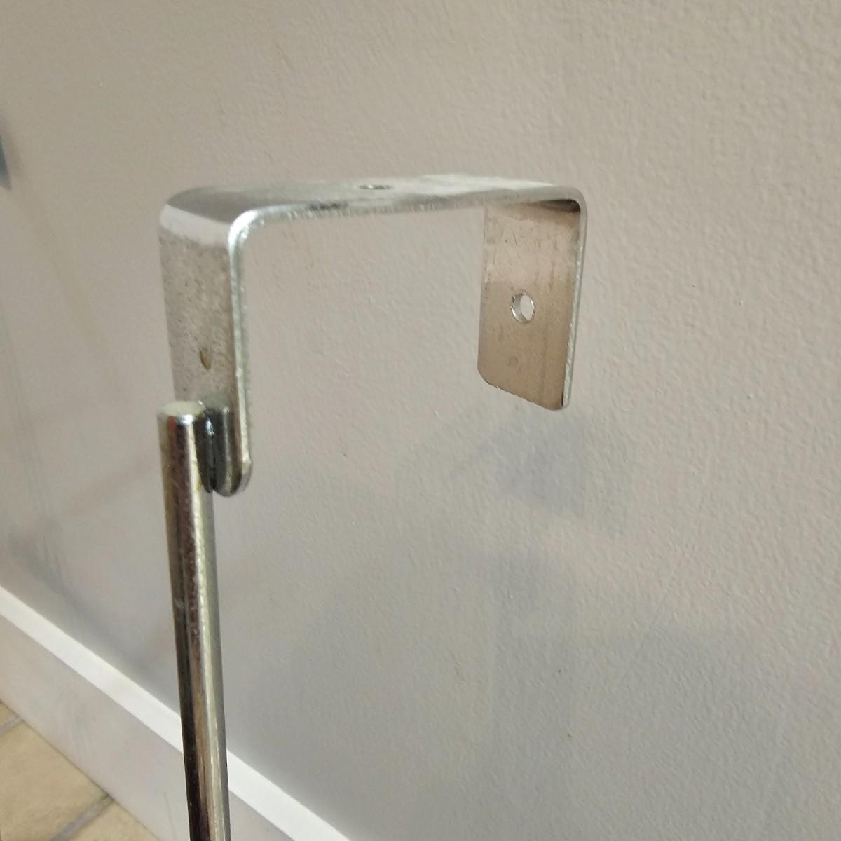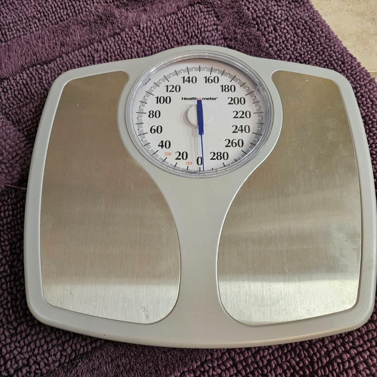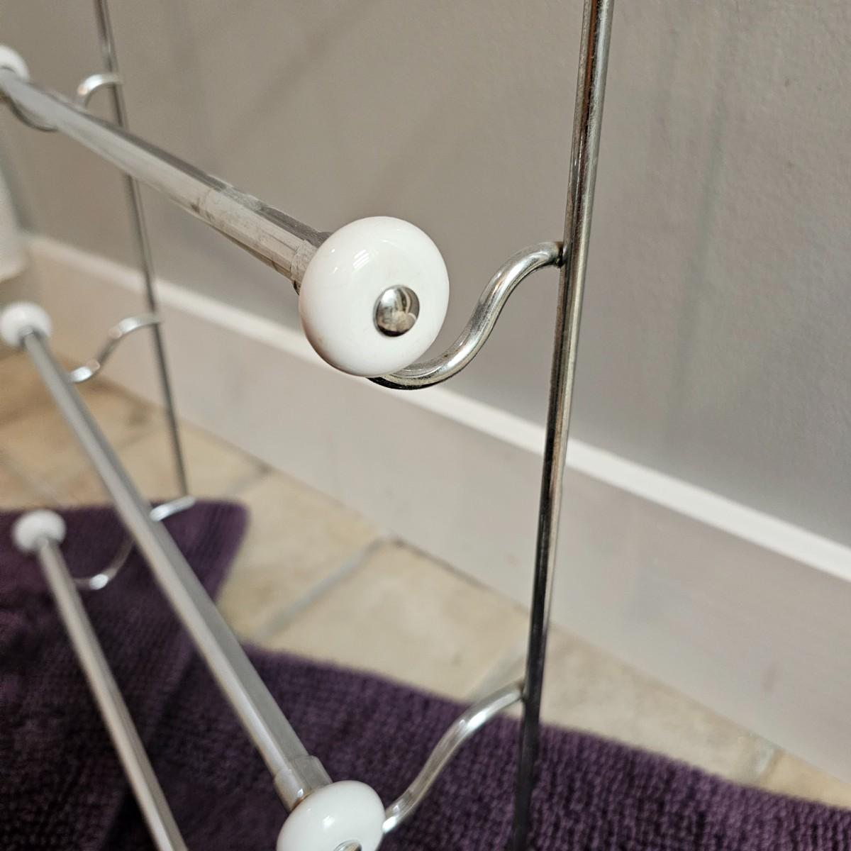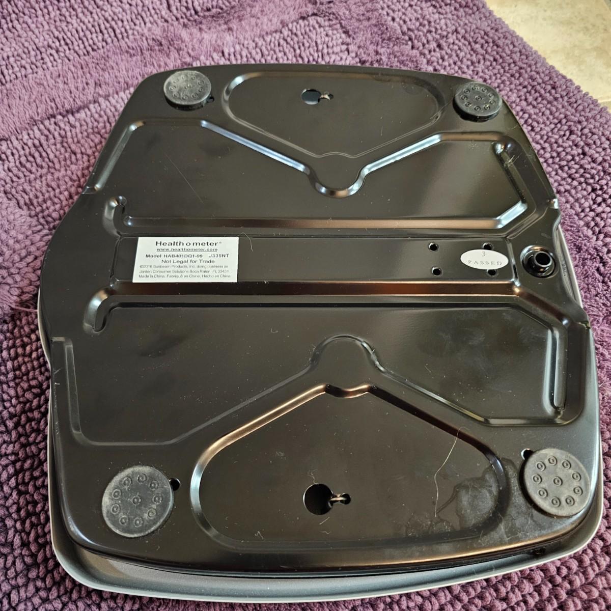 A collection of bath items. A Healthometer scale, Ikea stainless trashcan, hanging towel rack, and two Wamsutta rugs. Rack is 17" x 5" x 22"H, bath mat is 25" x 17", and larger rug is 40" x 24". See photos for details. Shipping available.