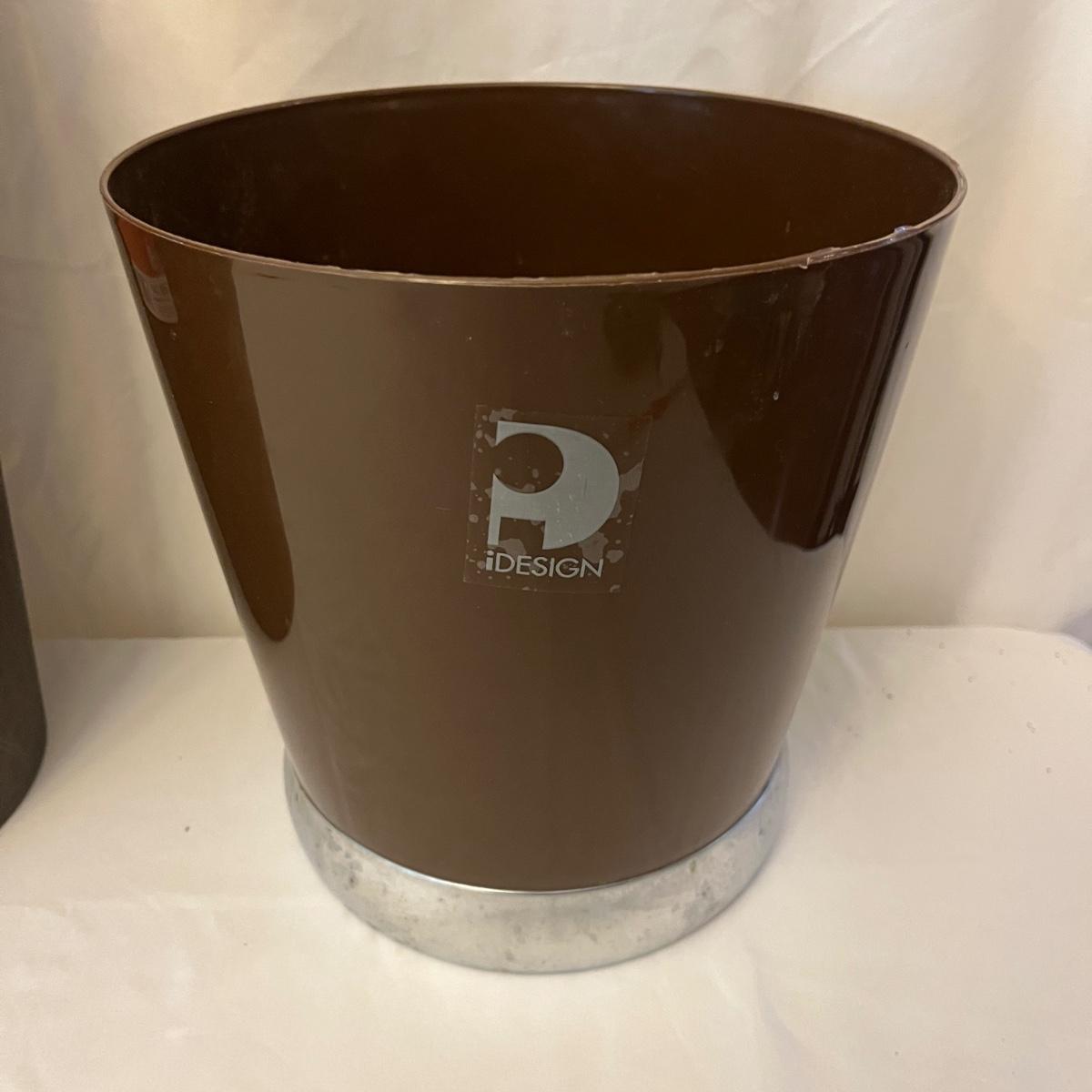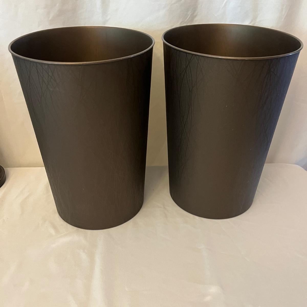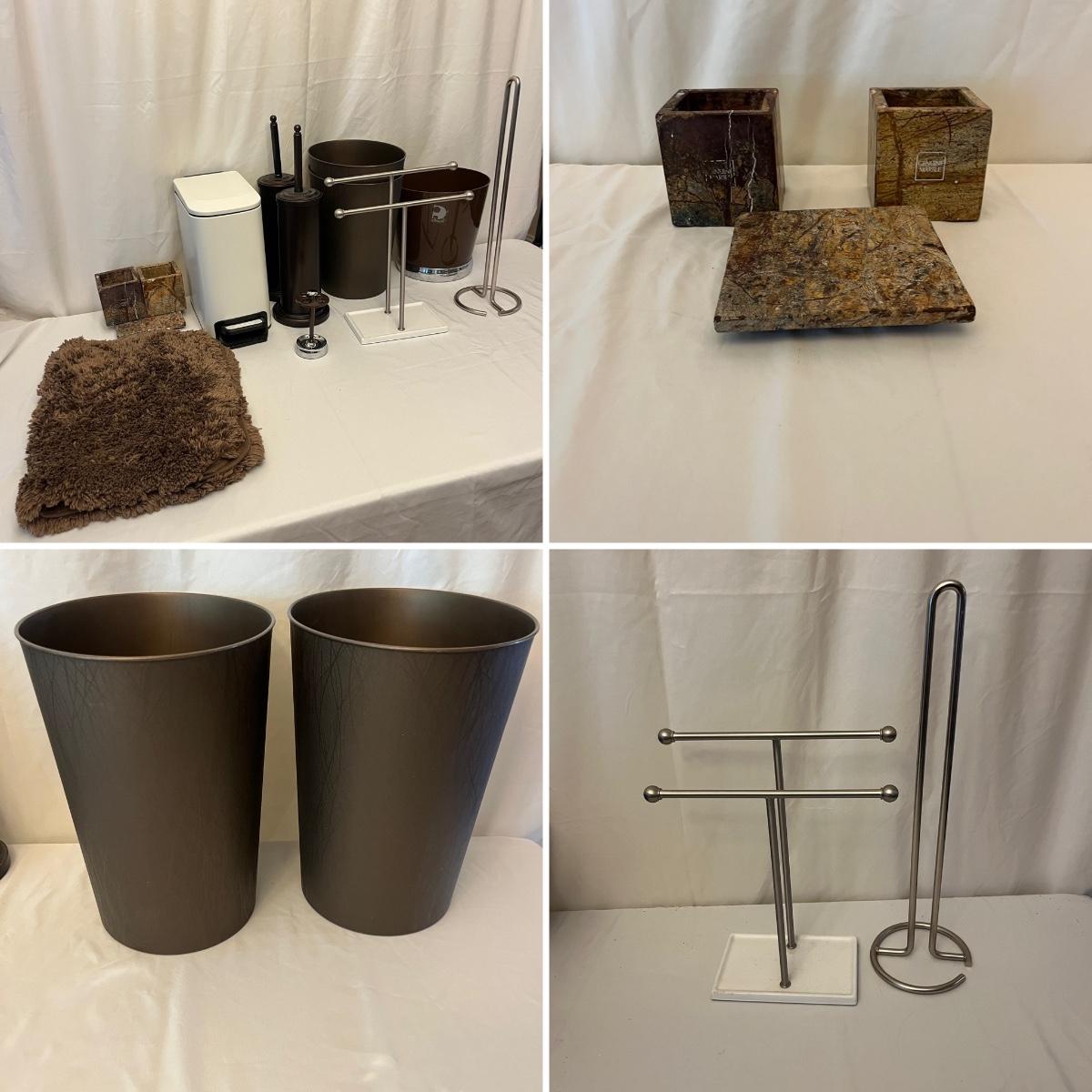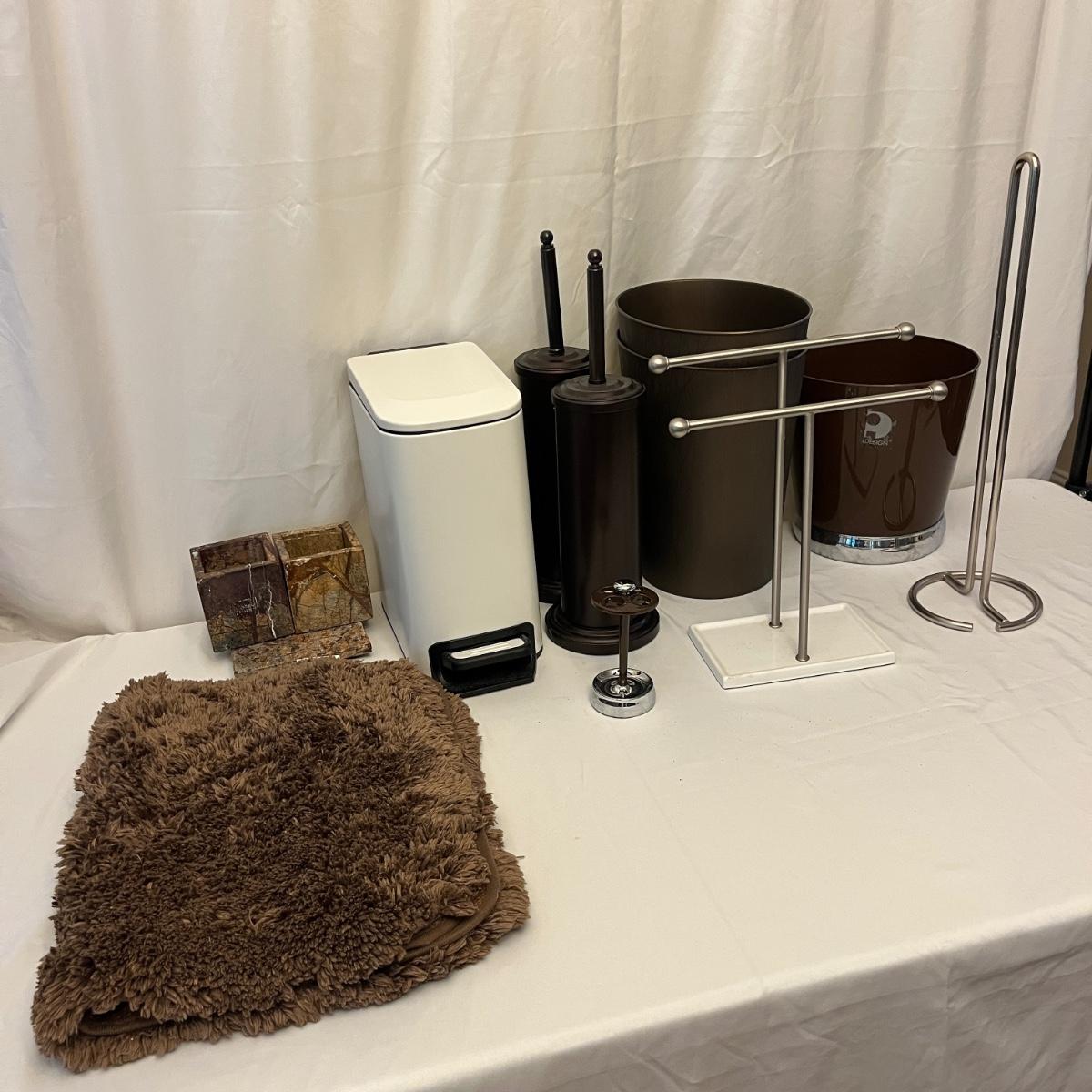 Lot contains an assortment of bathroom accessories that includes three plastic wastebaskets, metal hand towel holder,