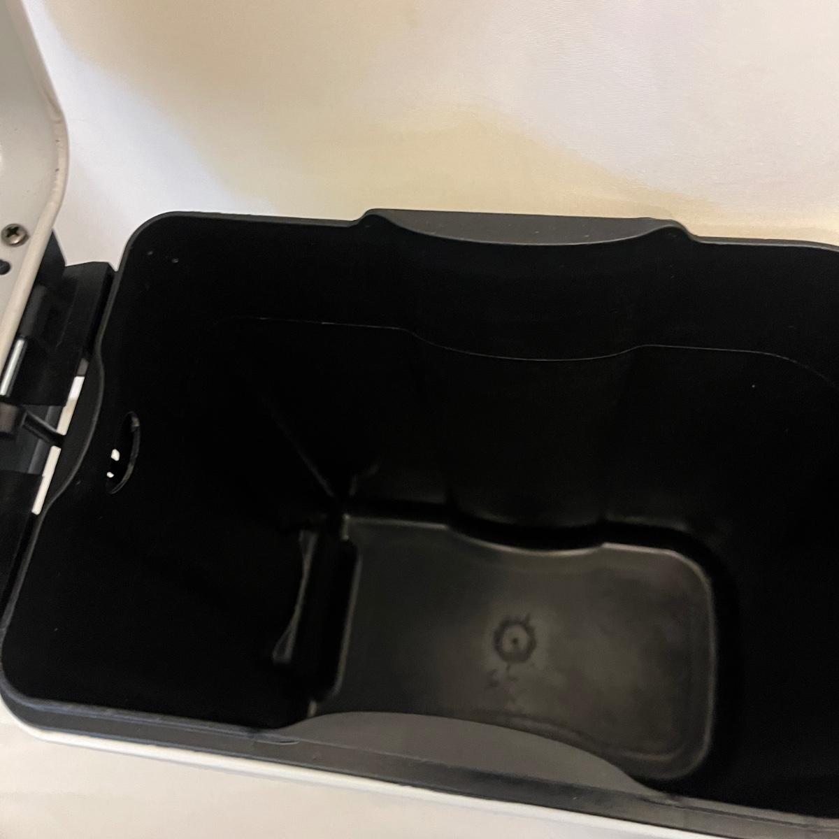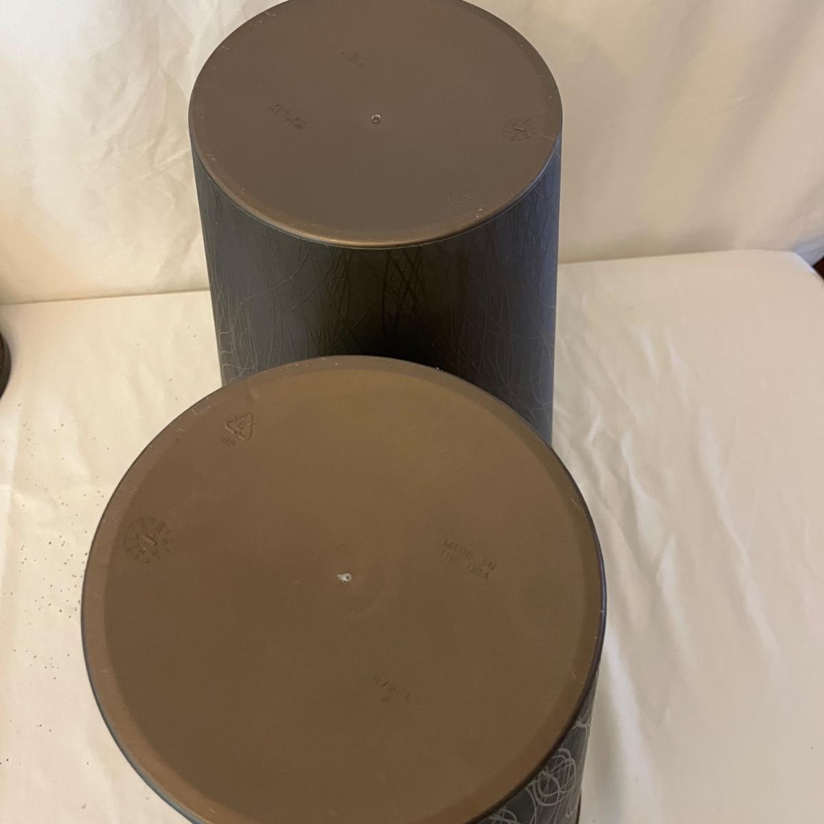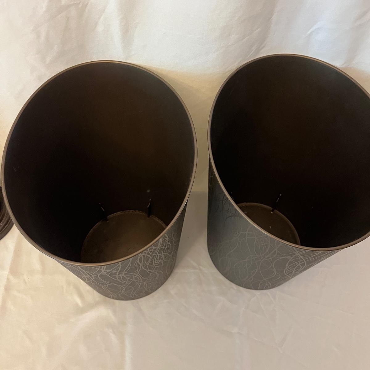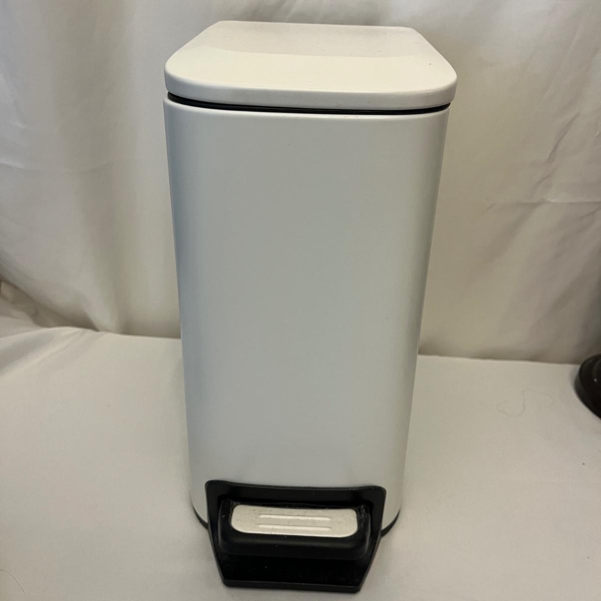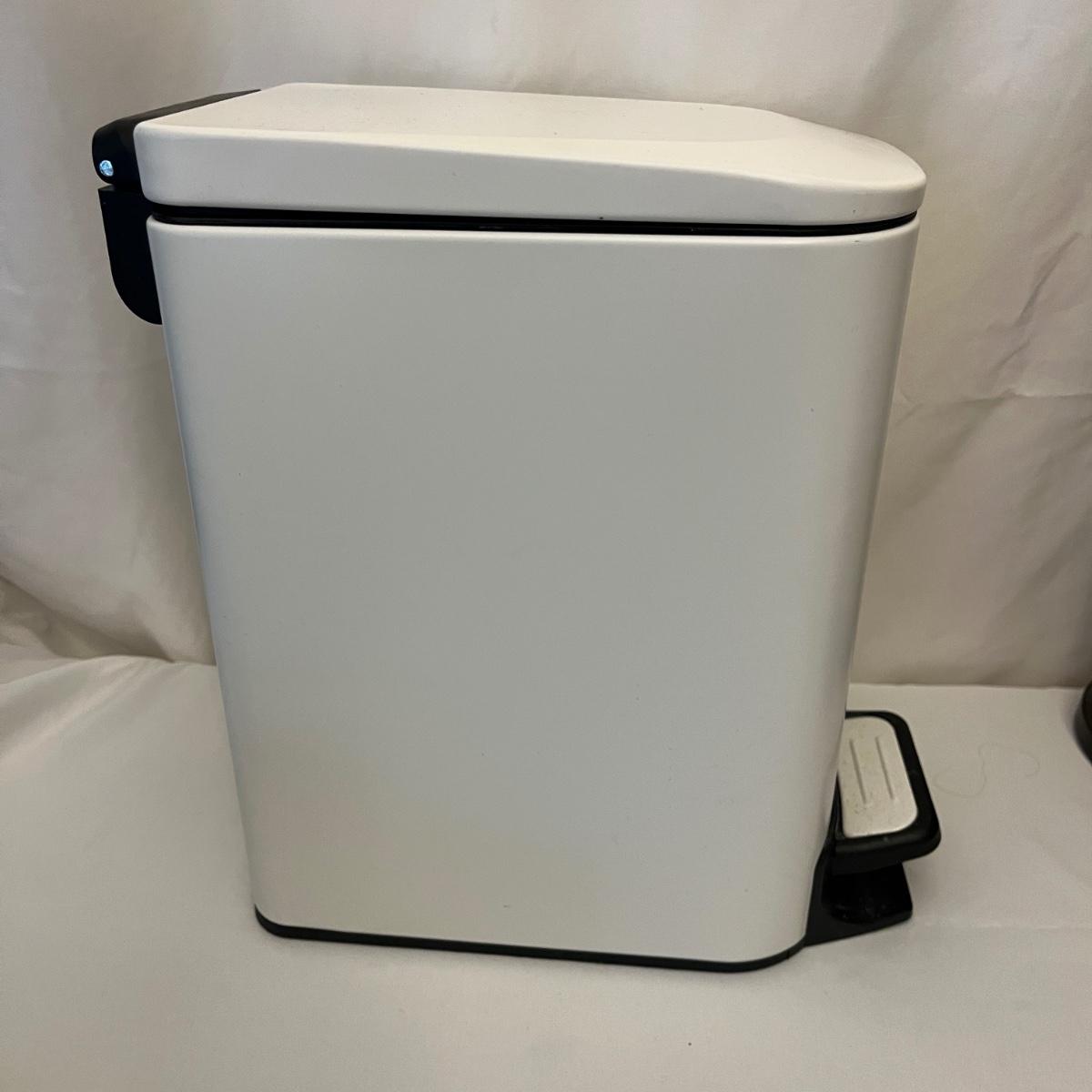 Lot contains an assortment of bathroom accessories that includes three plastic wastebaskets, metal hand towel holder,