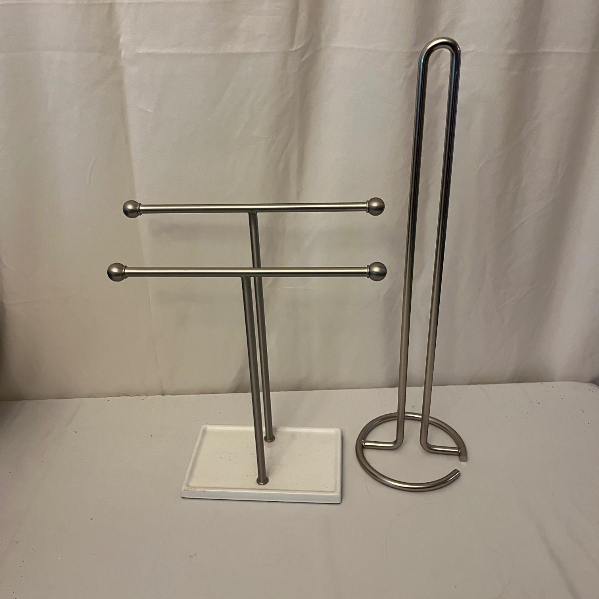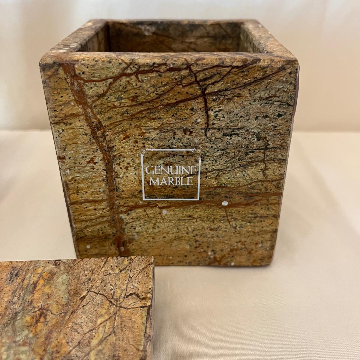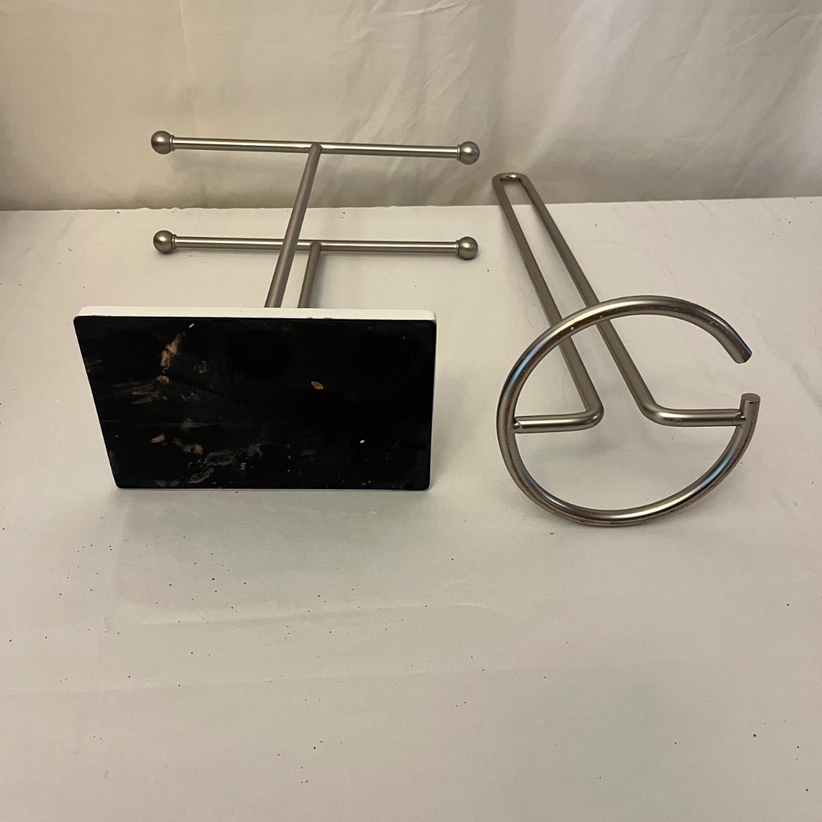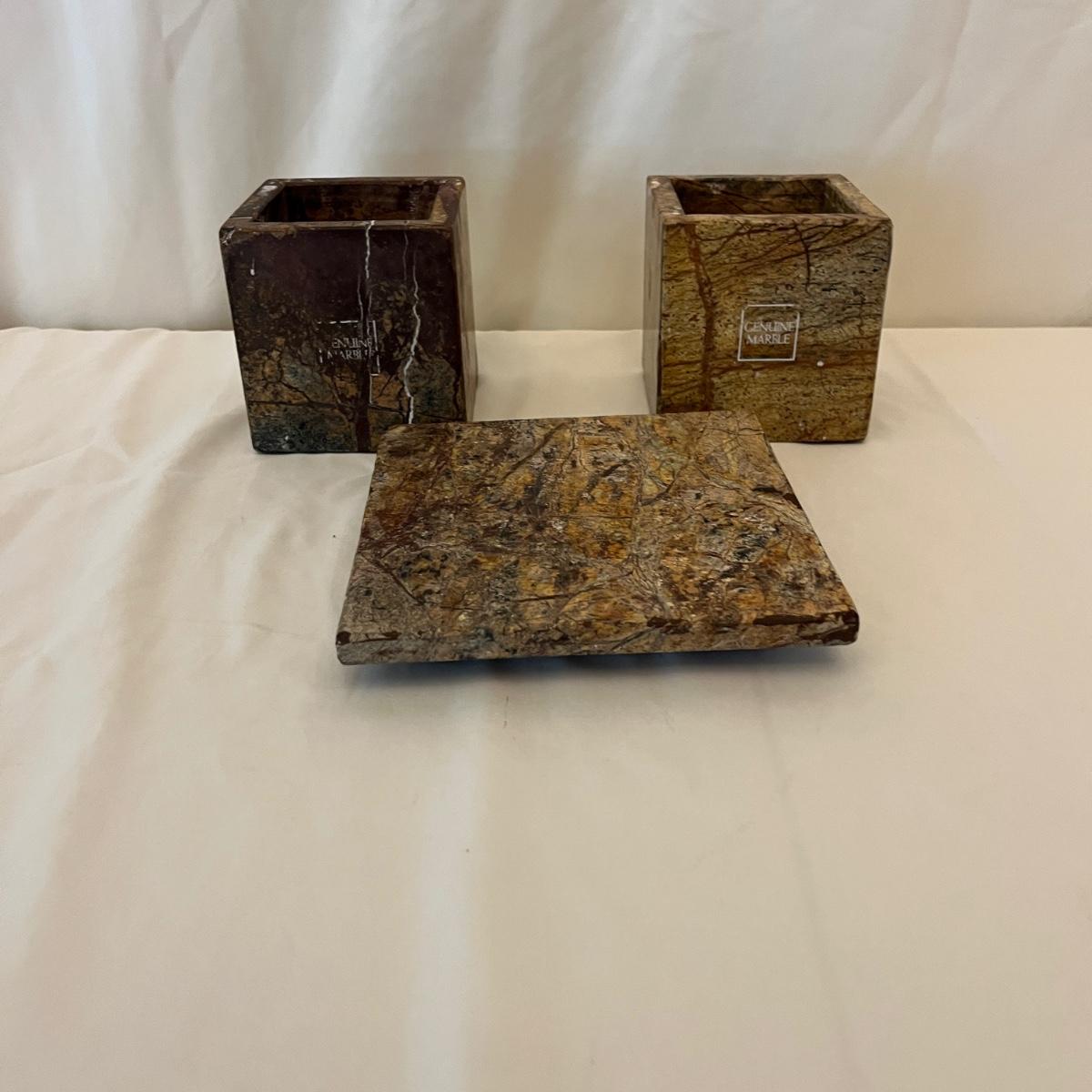 and plastic toothbrush holder, marble square containers, metal wastebasket metal toilet brushes, metal toilet paper holder and more. Hand towel holder measures 11” x 5” x 13”H.