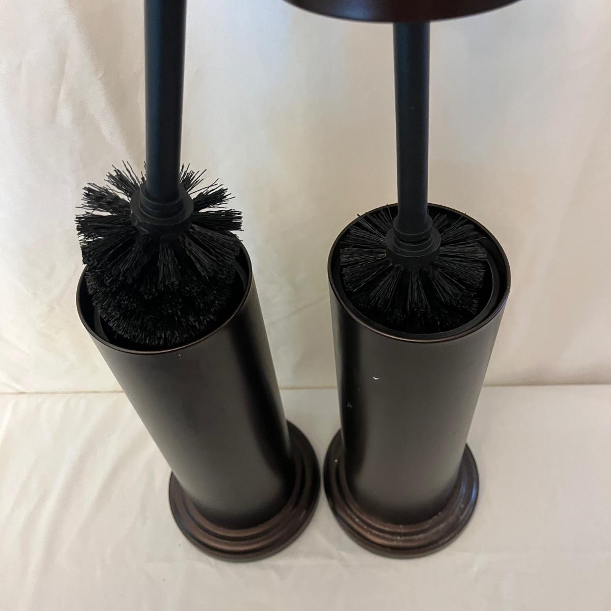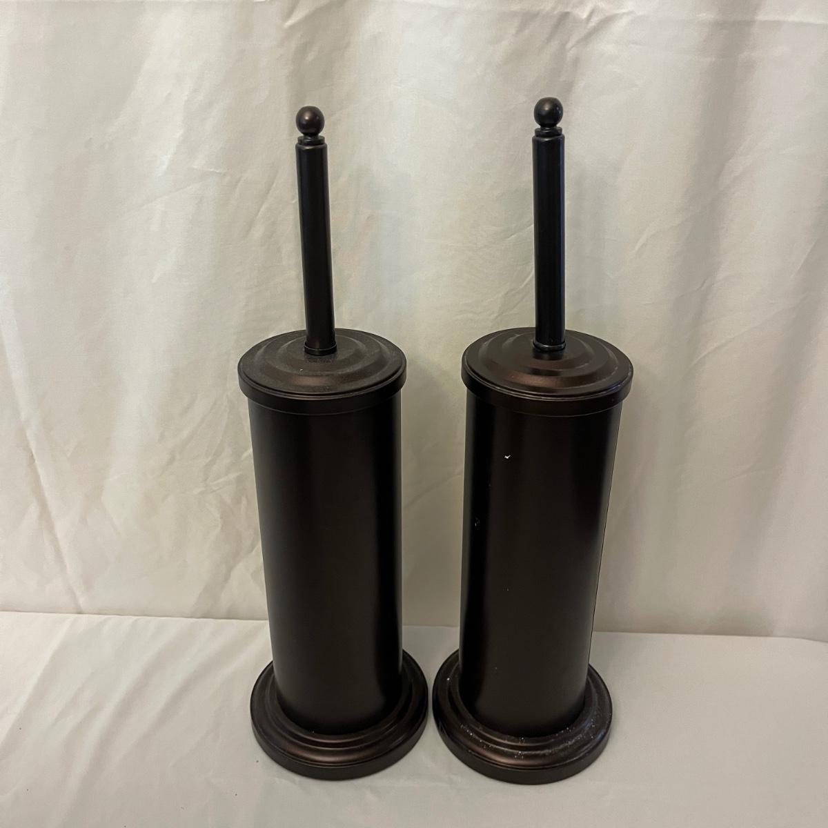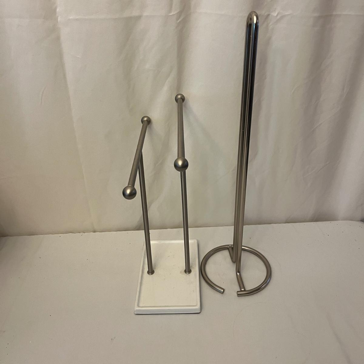 and plastic toothbrush holder, marble square containers, metal wastebasket metal toilet brushes, metal toilet paper holder and more. Hand towel holder measures 11” x 5” x 13”H.