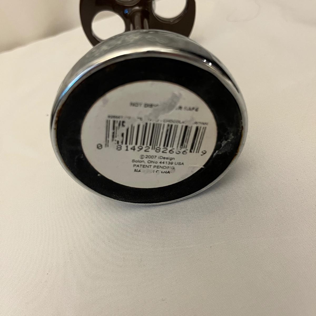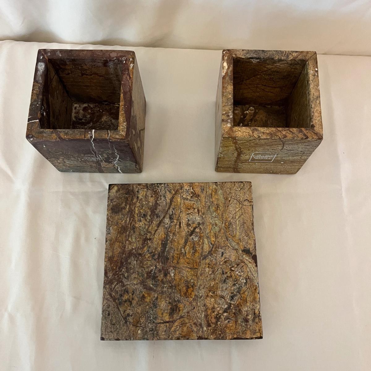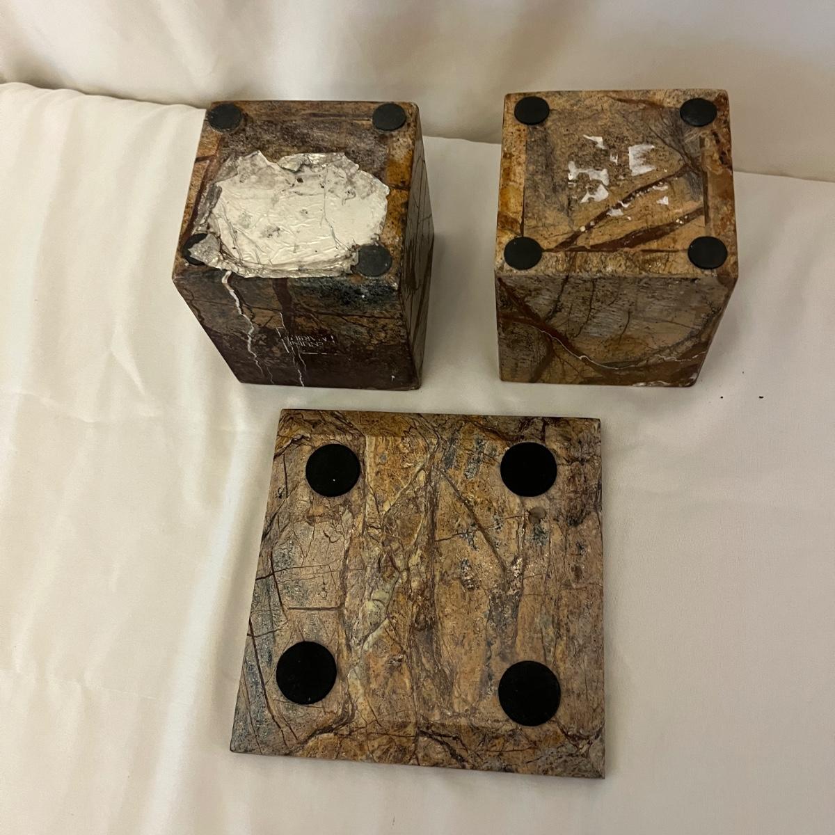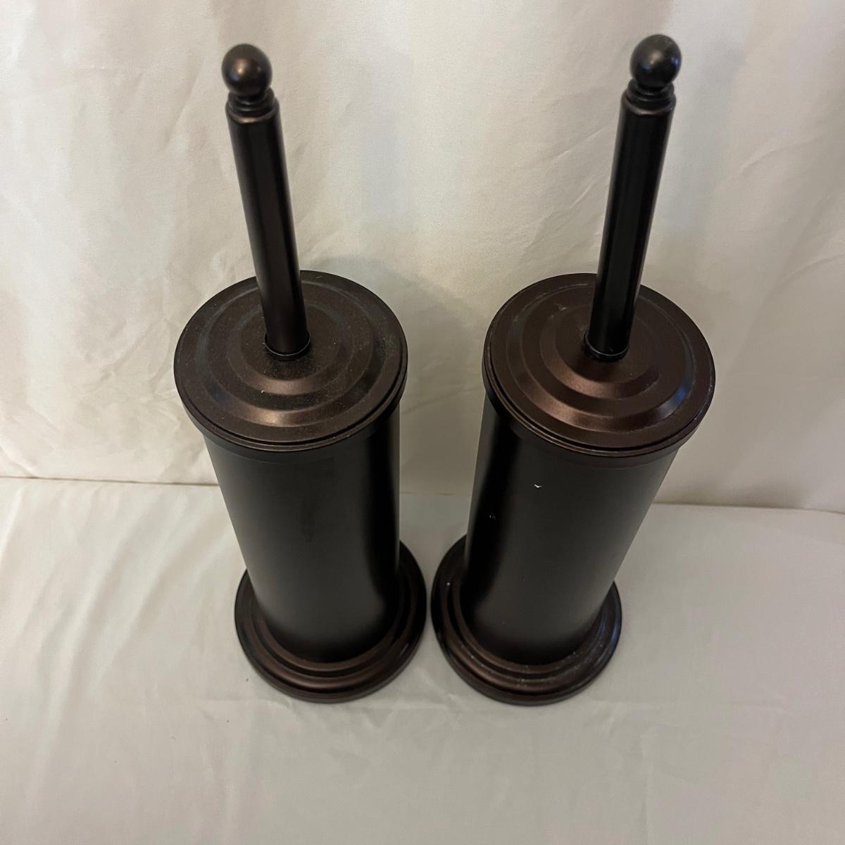 and plastic toothbrush holder, marble square containers, metal wastebasket metal toilet brushes, metal toilet paper holder and more. Hand towel holder measures 11” x 5” x 13”H.