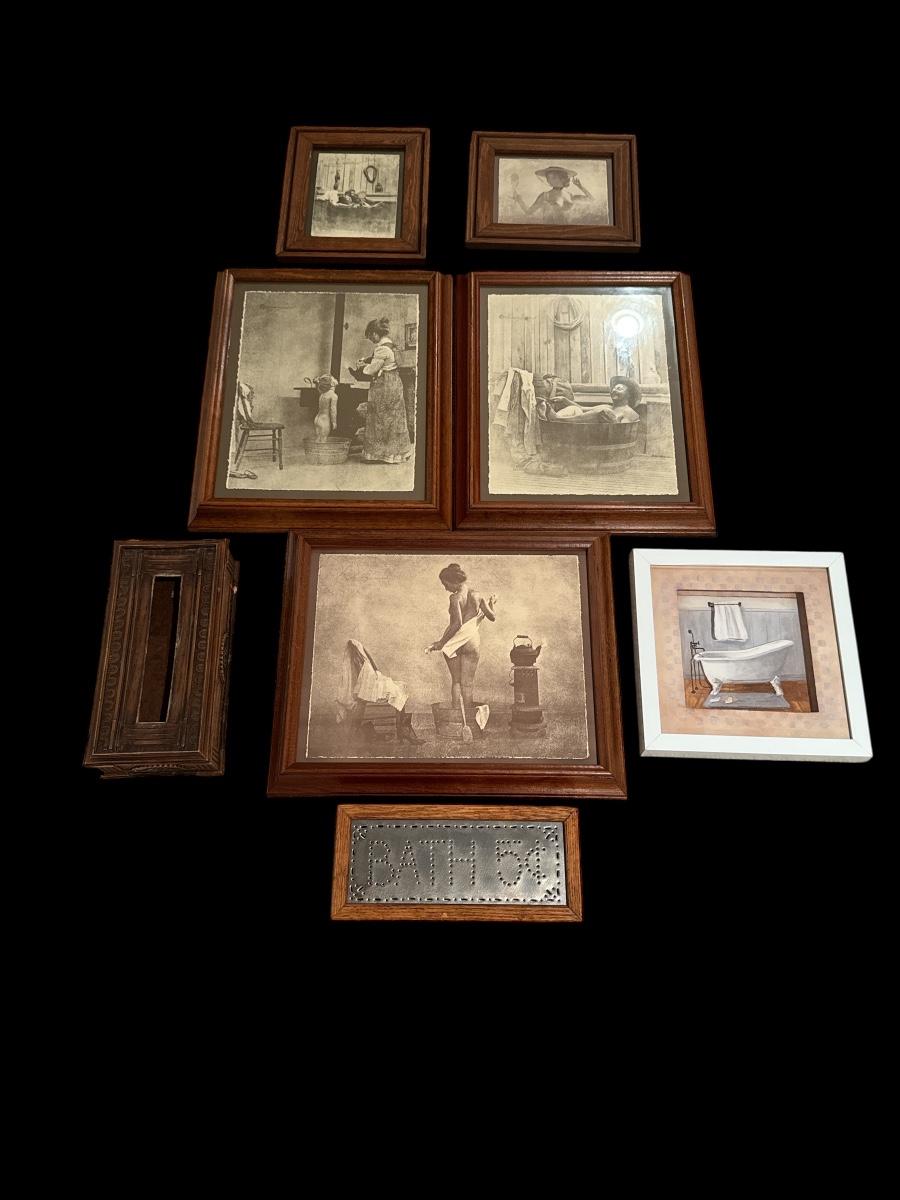 Collection of vintage and rustic bathroom-themed wall art, including: