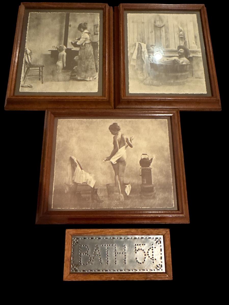 • Three sepia-toned prints depicting nostalgic bath scenes: a child in a washtub, a mother bathing her child, and a woman drying off by a wood-burning stove.