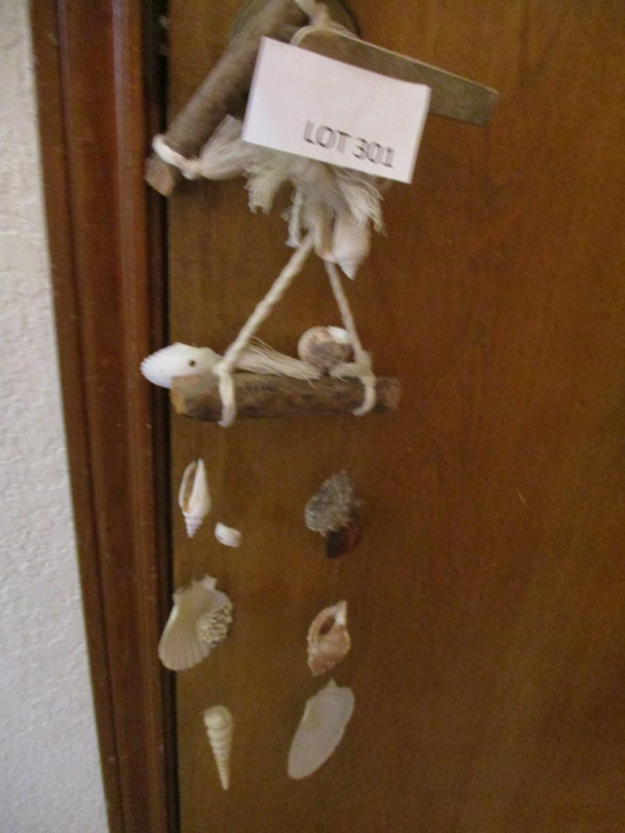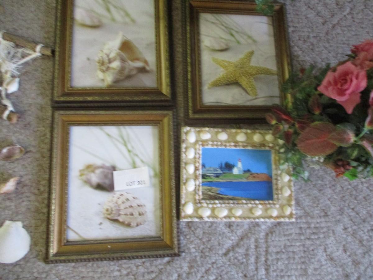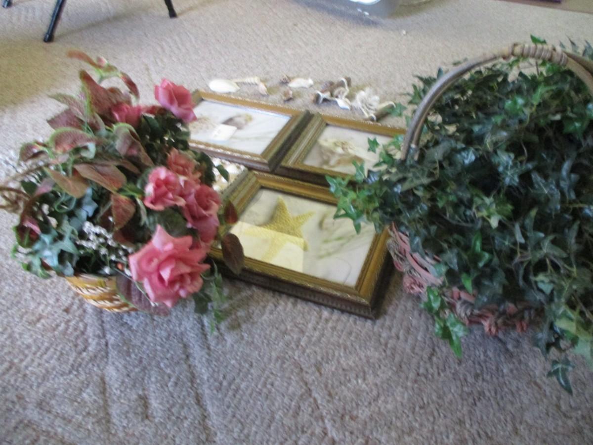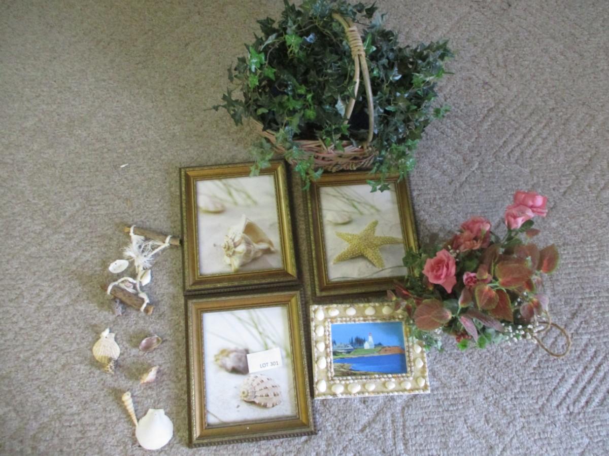 Hanging Seashells, Faux flowers (2). Framed shell artwort