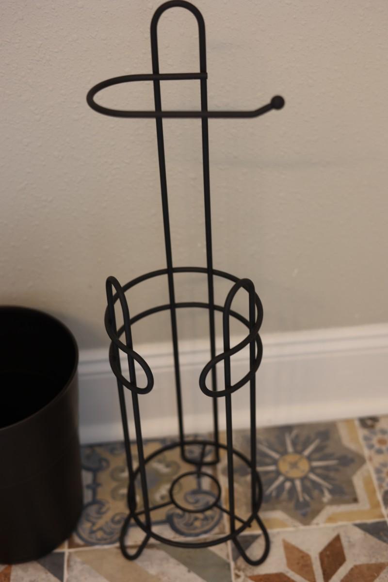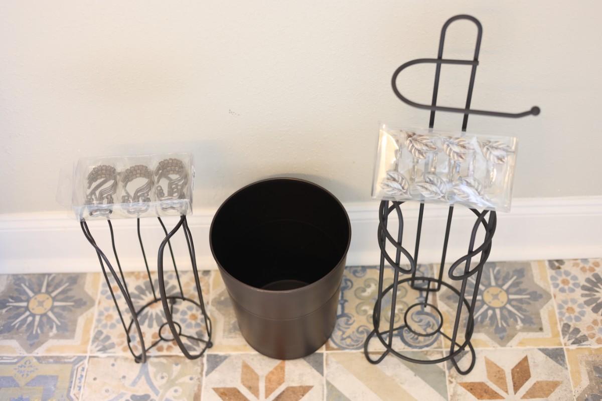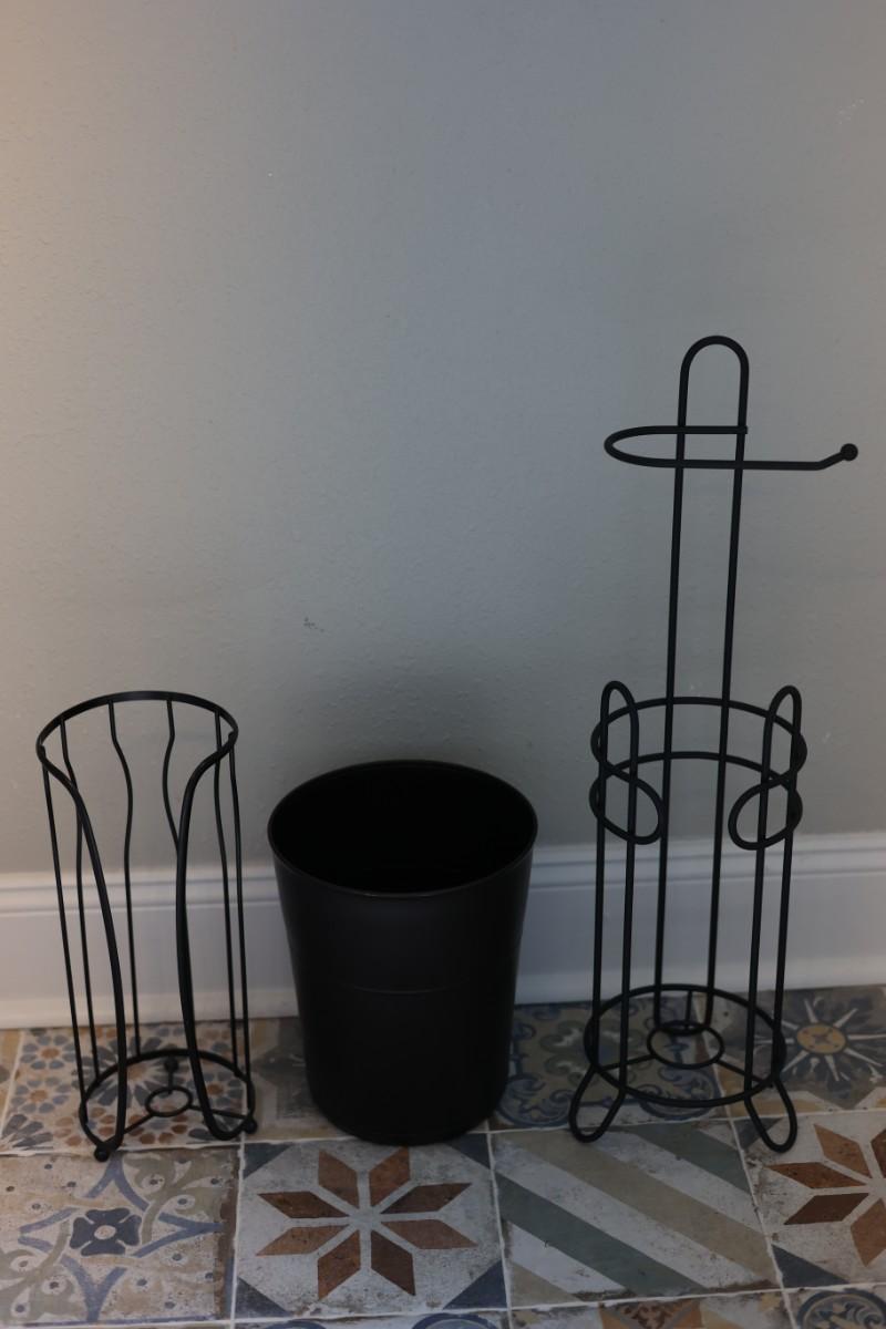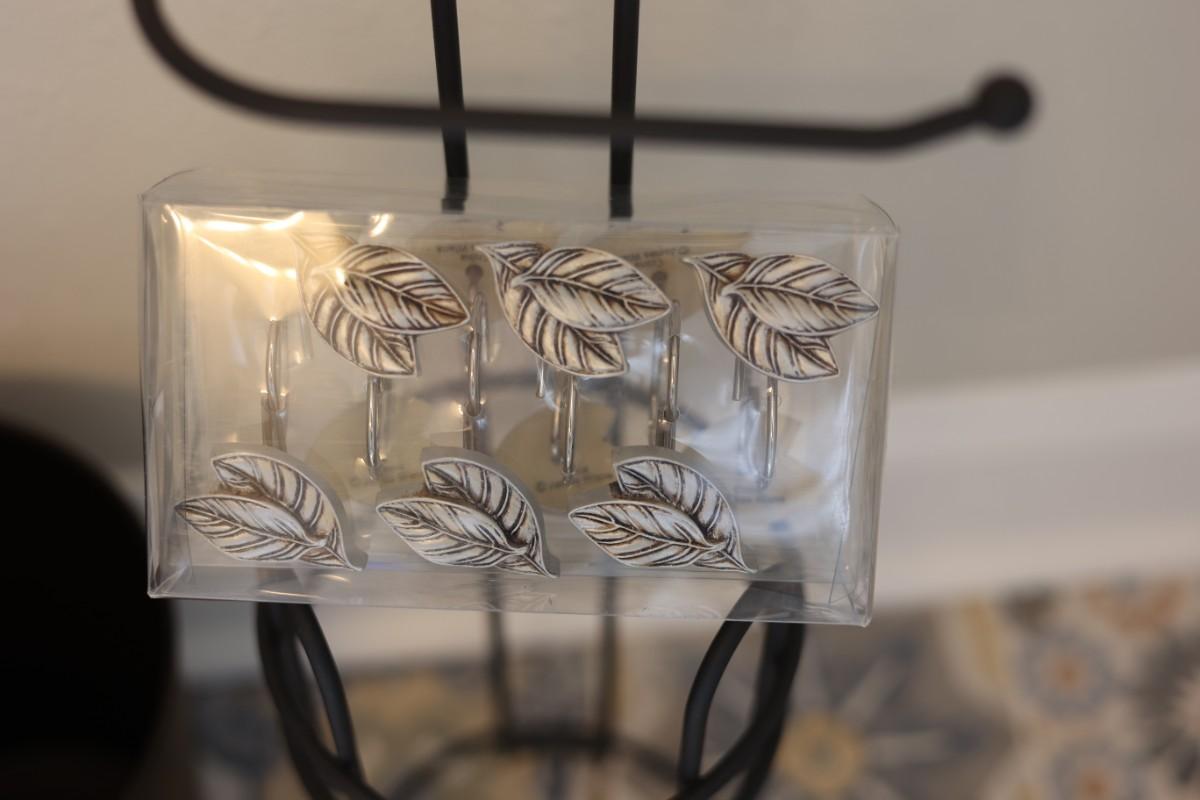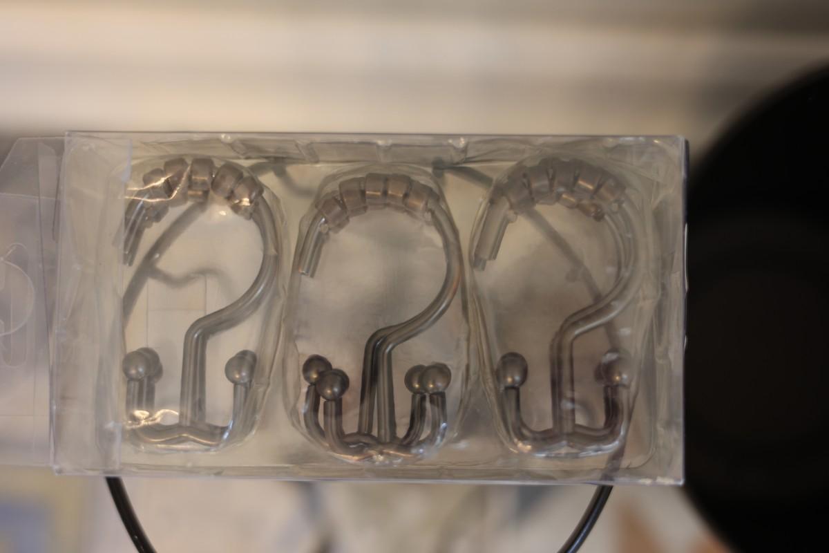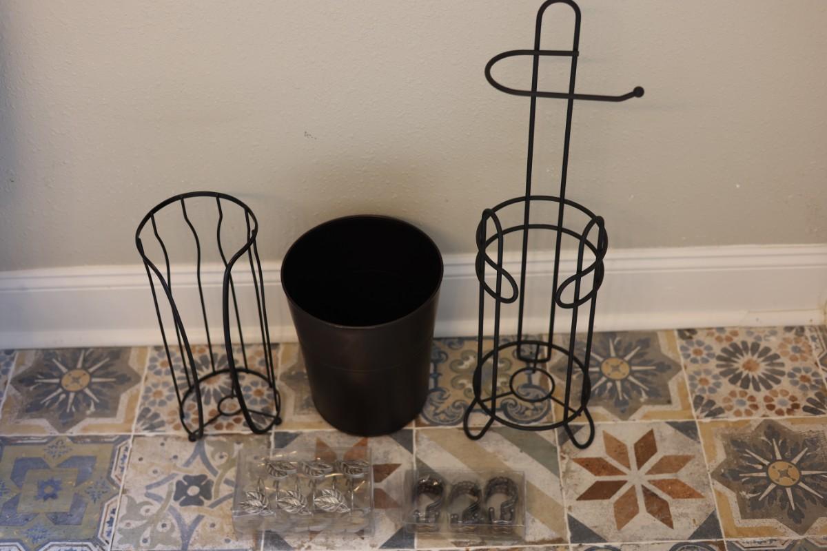 2 sets of shower hooks, 1 toilet paper holder, 1 toilet paper holder and dispenser, 1 small can.