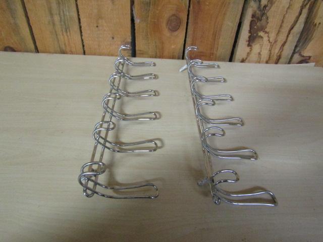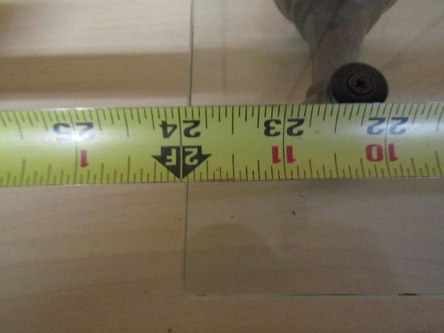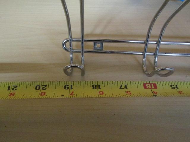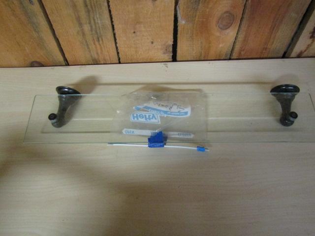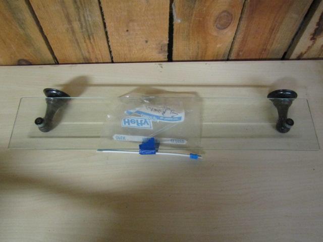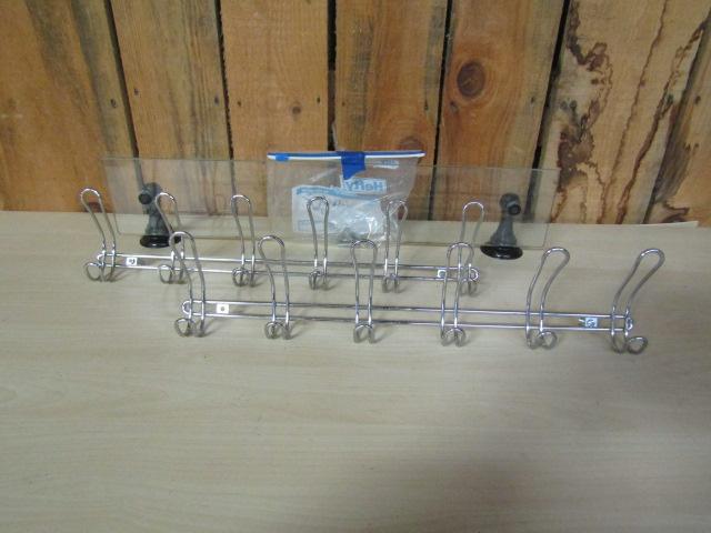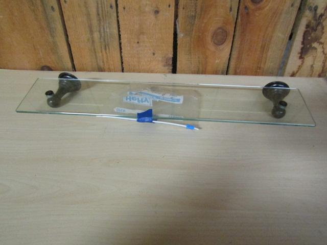 Bathroom Fixtures- Glass Wall Shelf and Two Metal Wall Hook Racks. Shelf is 24" Wide x 5" Deep, Hooks are 19" Wide