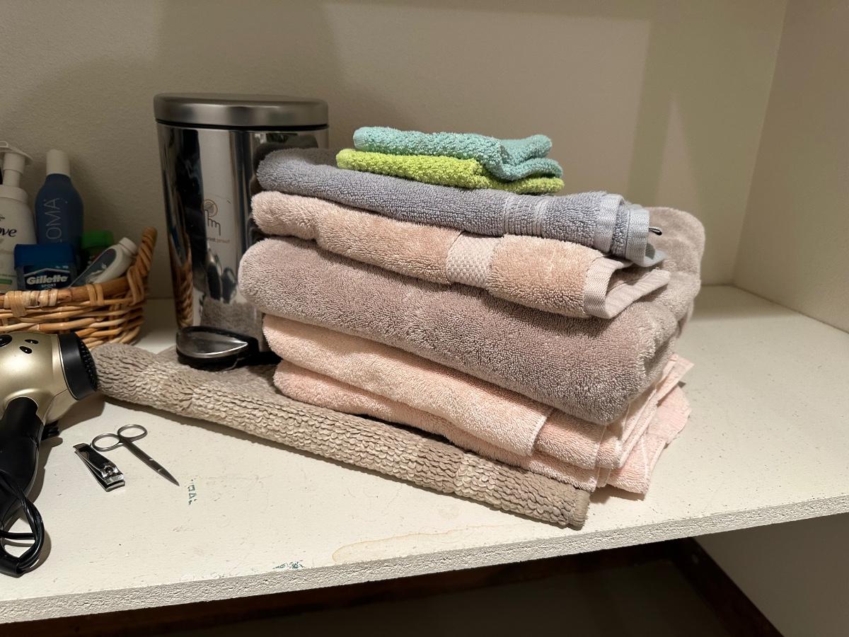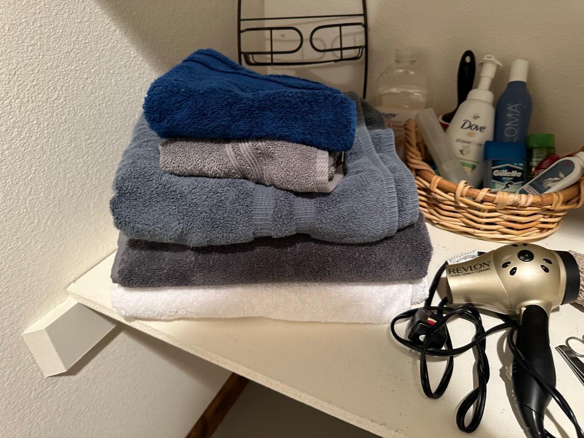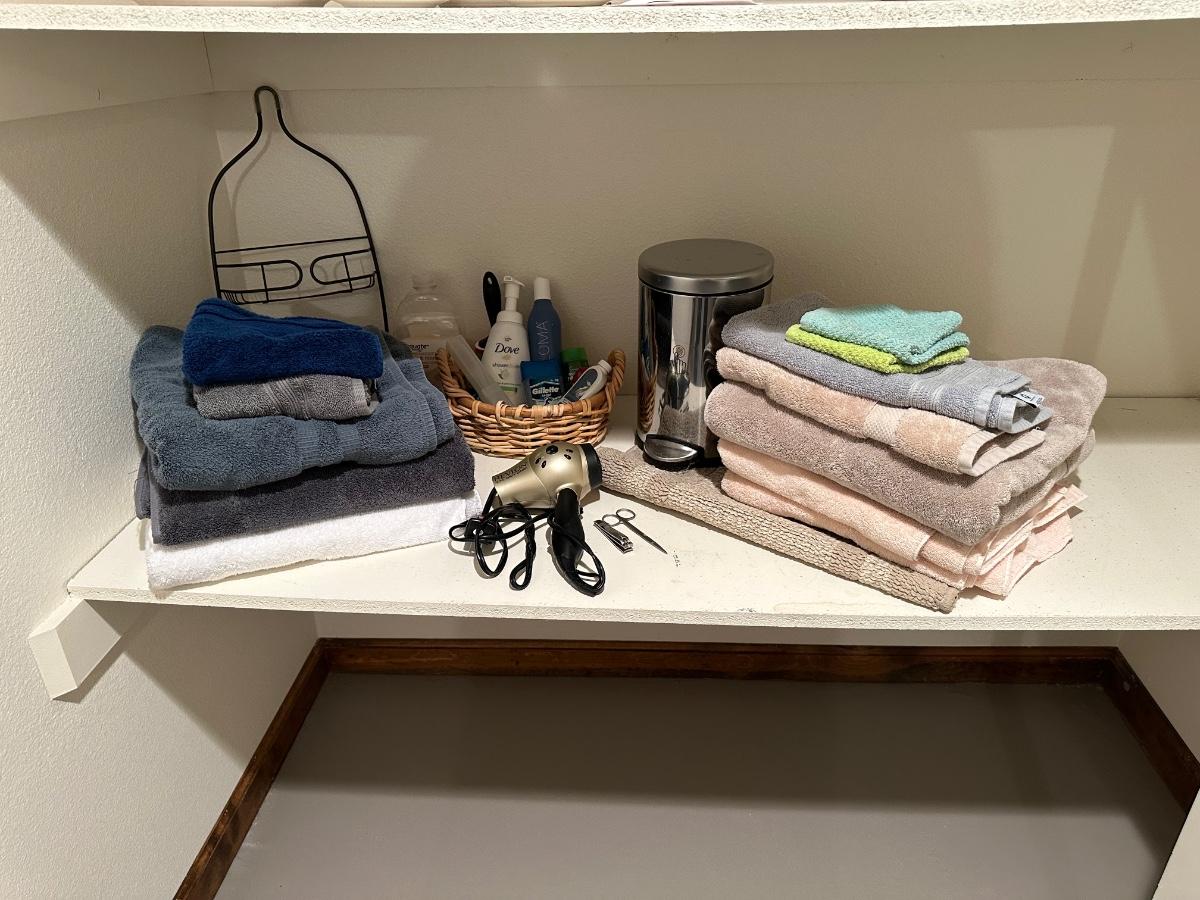 VARIOUS TOWELS, STEP WASTE CAN, HAIR DRYER AND MORE