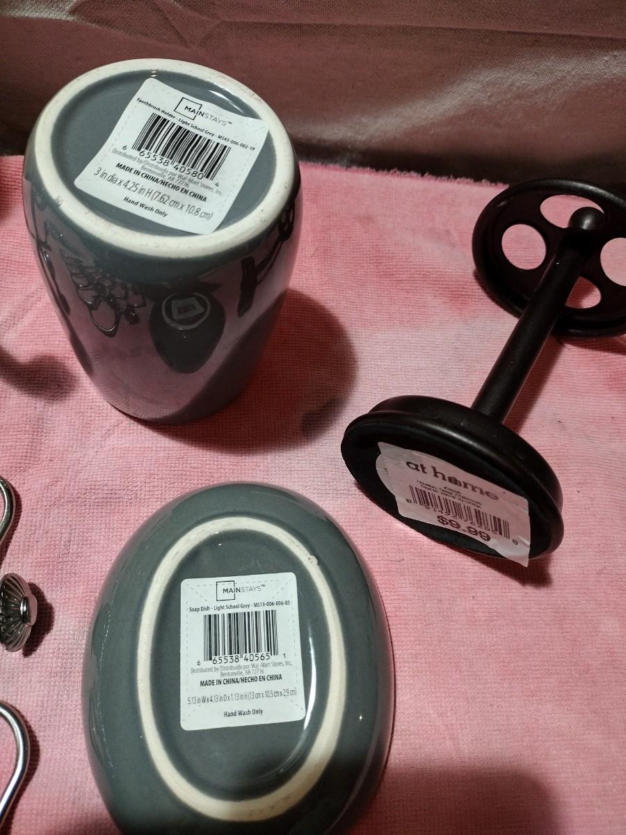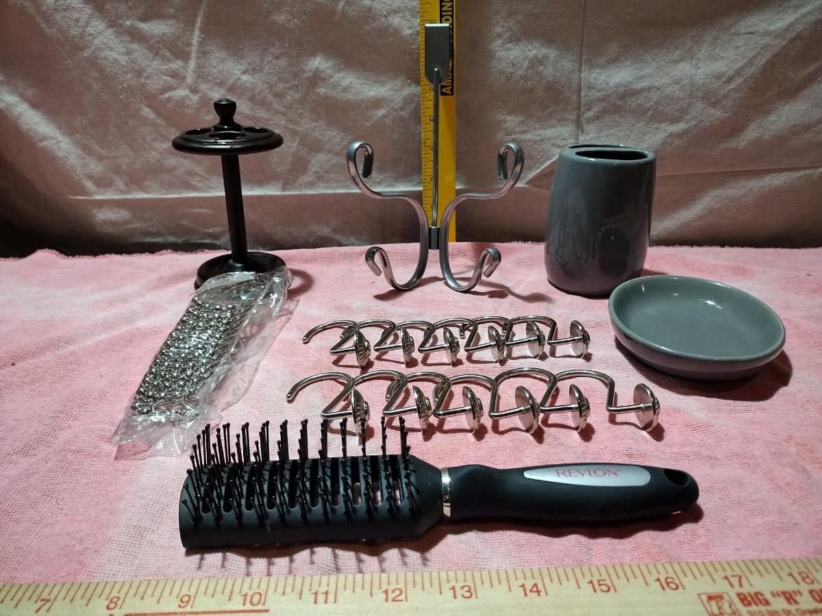 2 SETS OF SHOWER CURTAIN RINGS, OVER THE DOOR HANGER, TOOTHBRUSH HOLDER AND MORE
