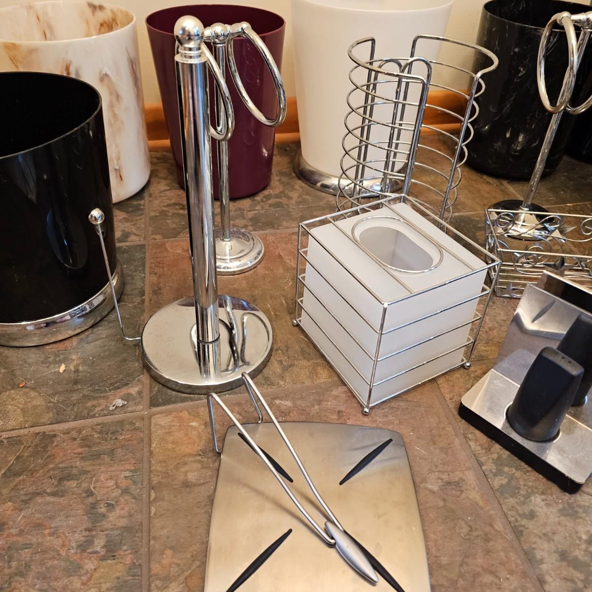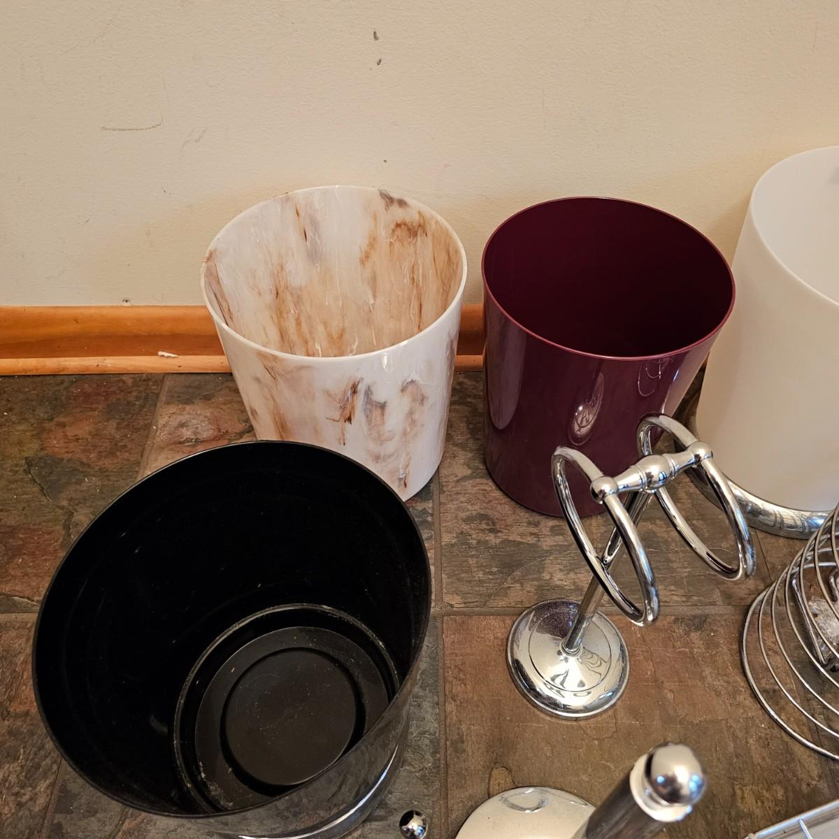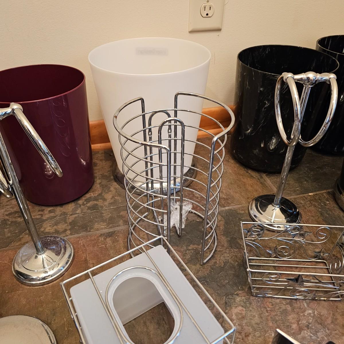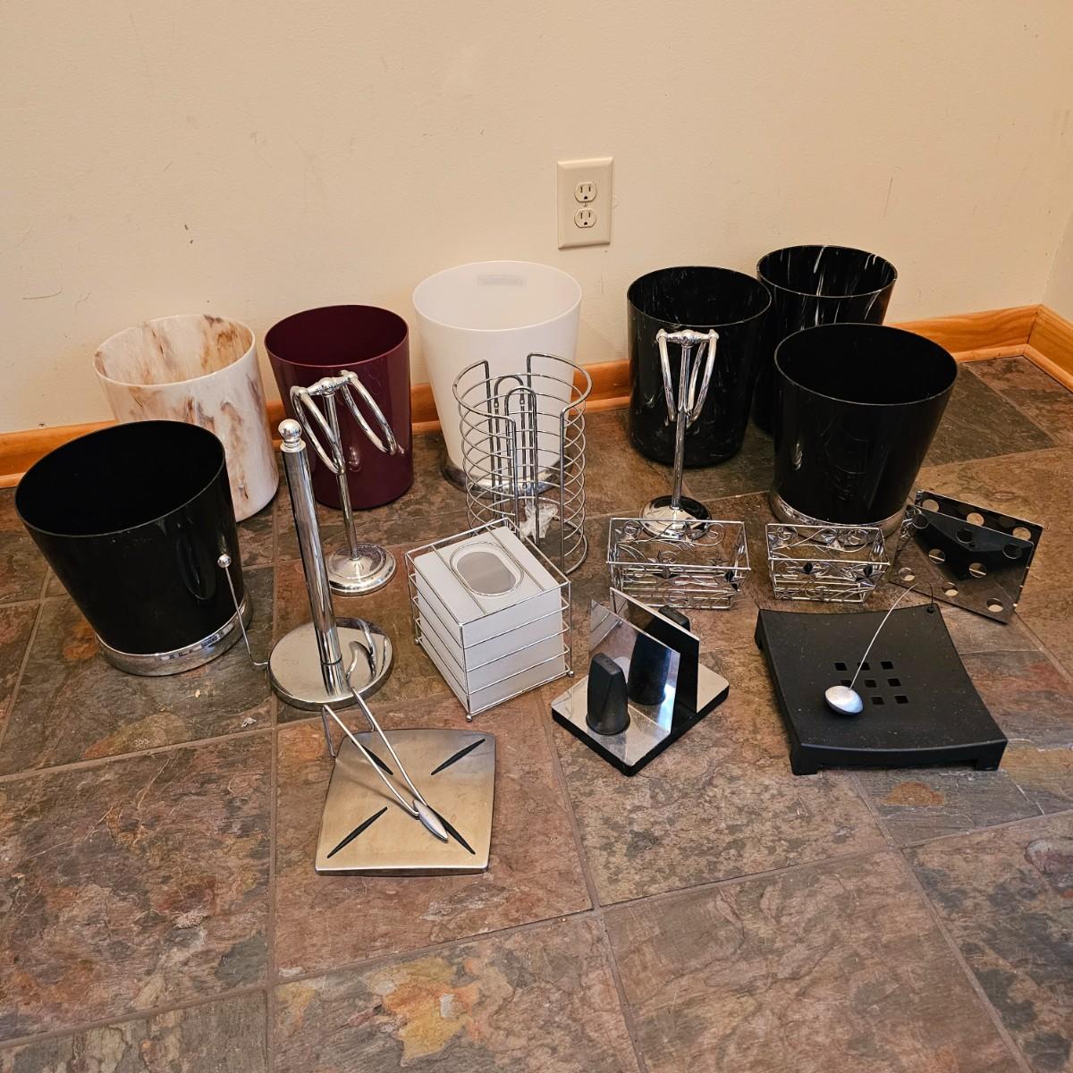 A large assortment of items for bath and kitchen. Seven small trashcans, largest is 9.5"D x 11"H. Towel holders, tissue box covers, napkin holders, etc. Many appear to be stainless. See photos for details.