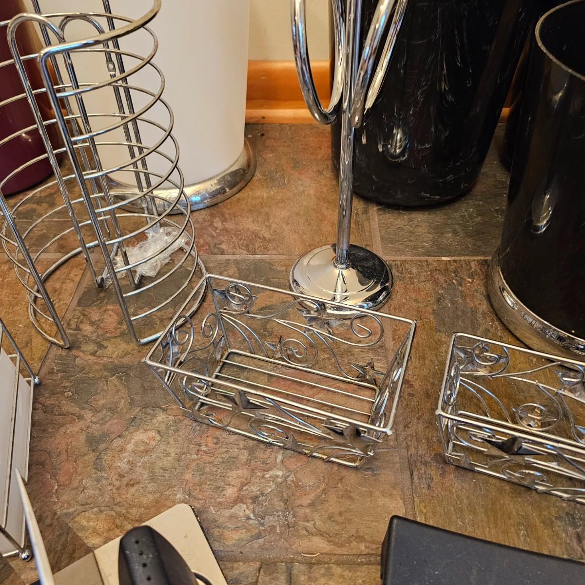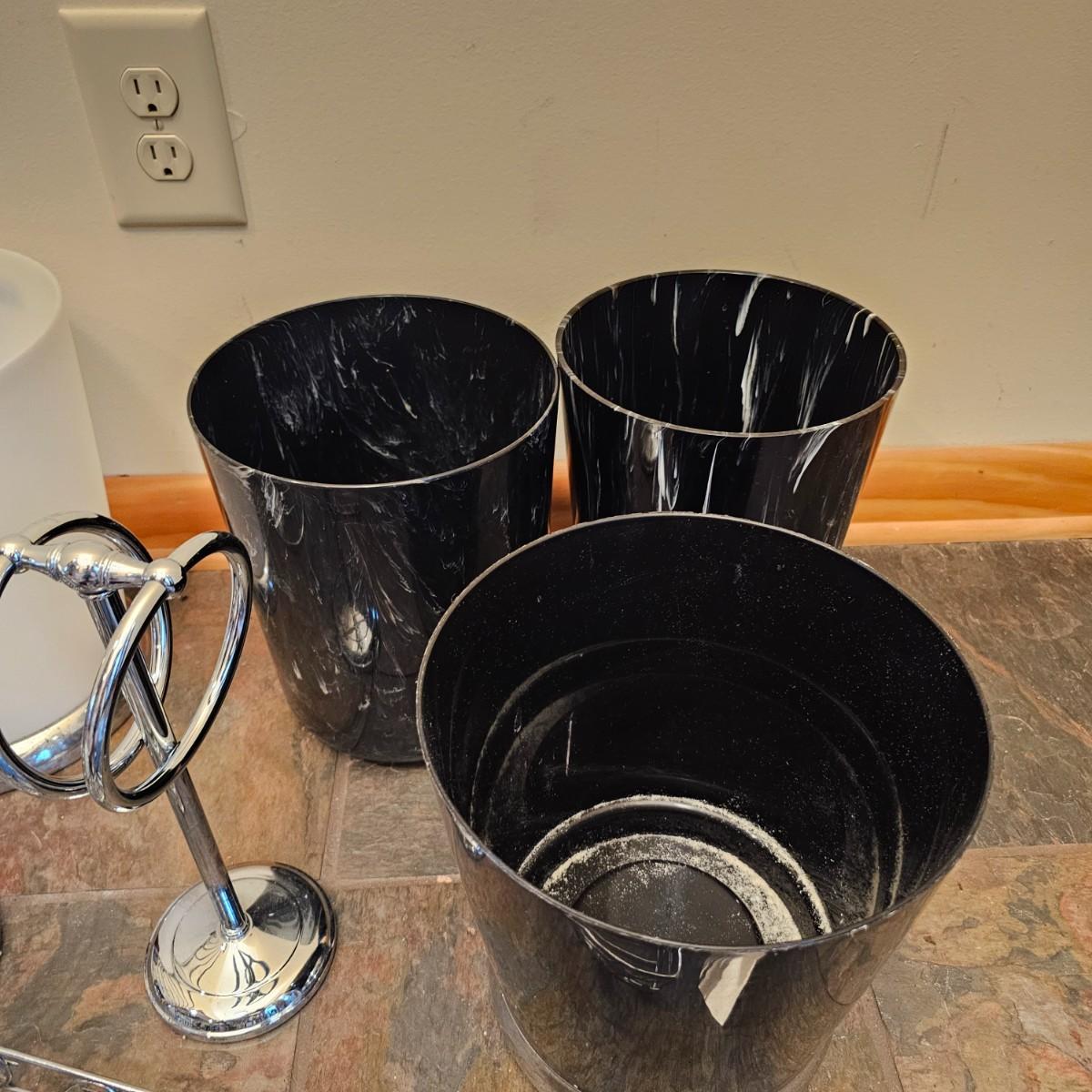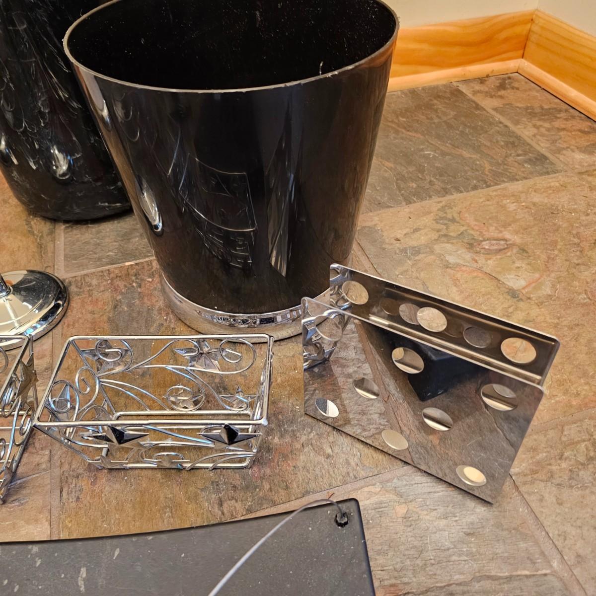 A large assortment of items for bath and kitchen. Seven small trashcans, largest is 9.5"D x 11"H. Towel holders, tissue box covers, napkin holders, etc. Many appear to be stainless. See photos for details.
