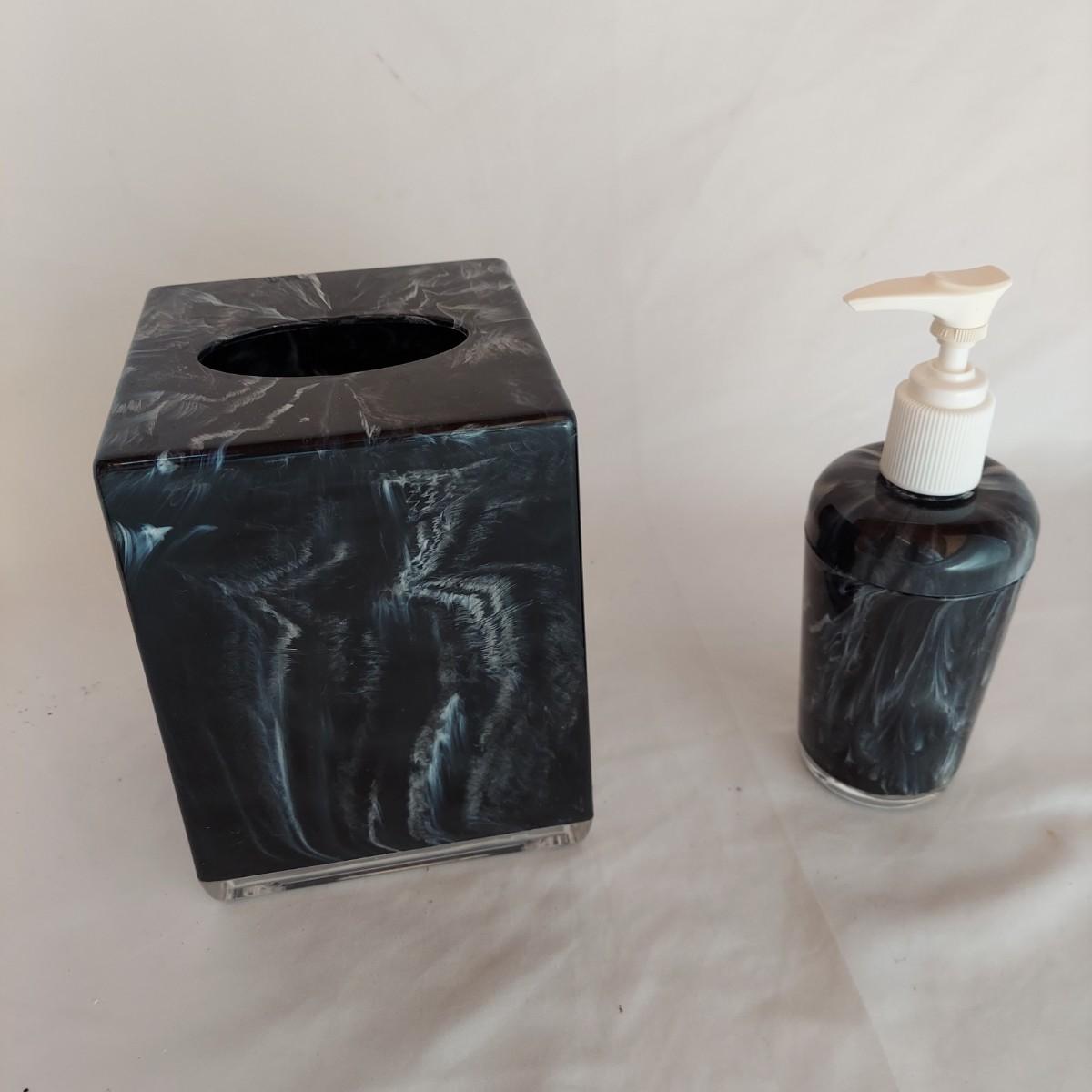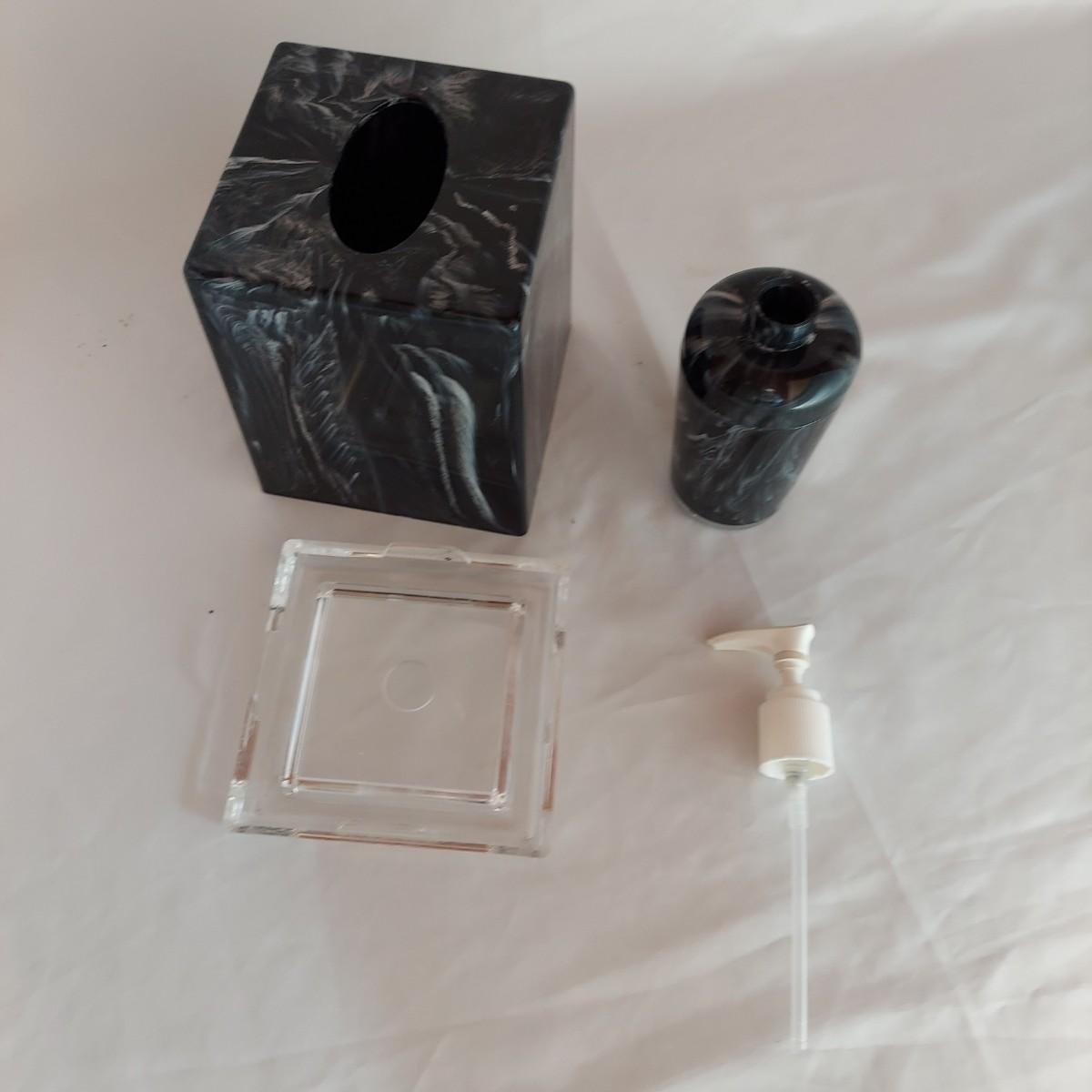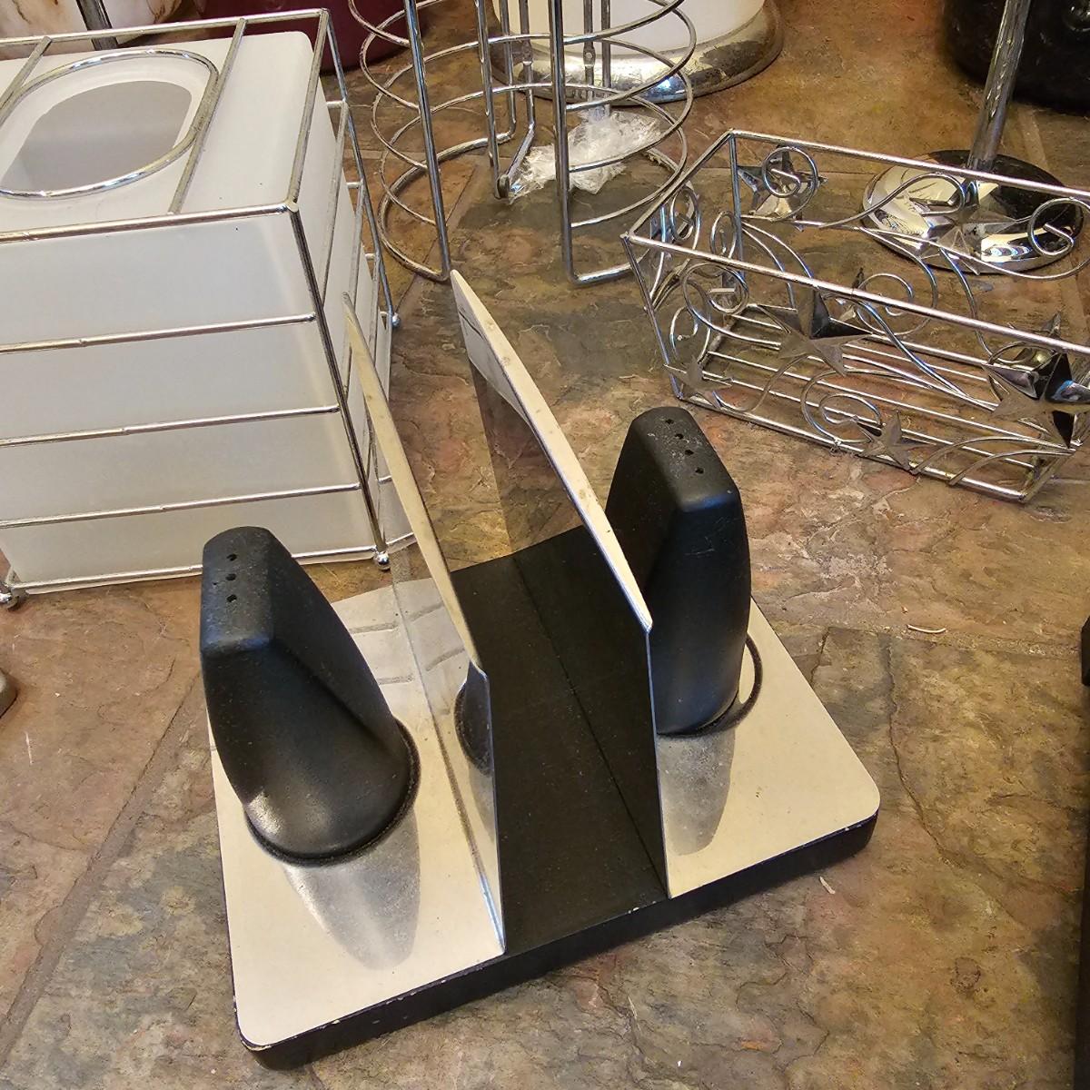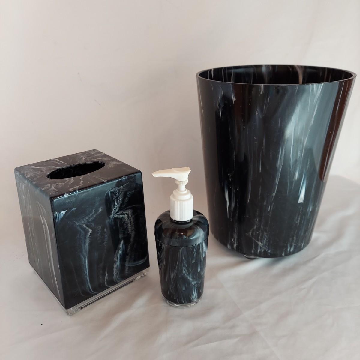 A large assortment of items for bath and kitchen. Seven small trashcans, largest is 9.5"D x 11"H. Towel holders, tissue box covers, napkin holders, etc. Many appear to be stainless. See photos for details.