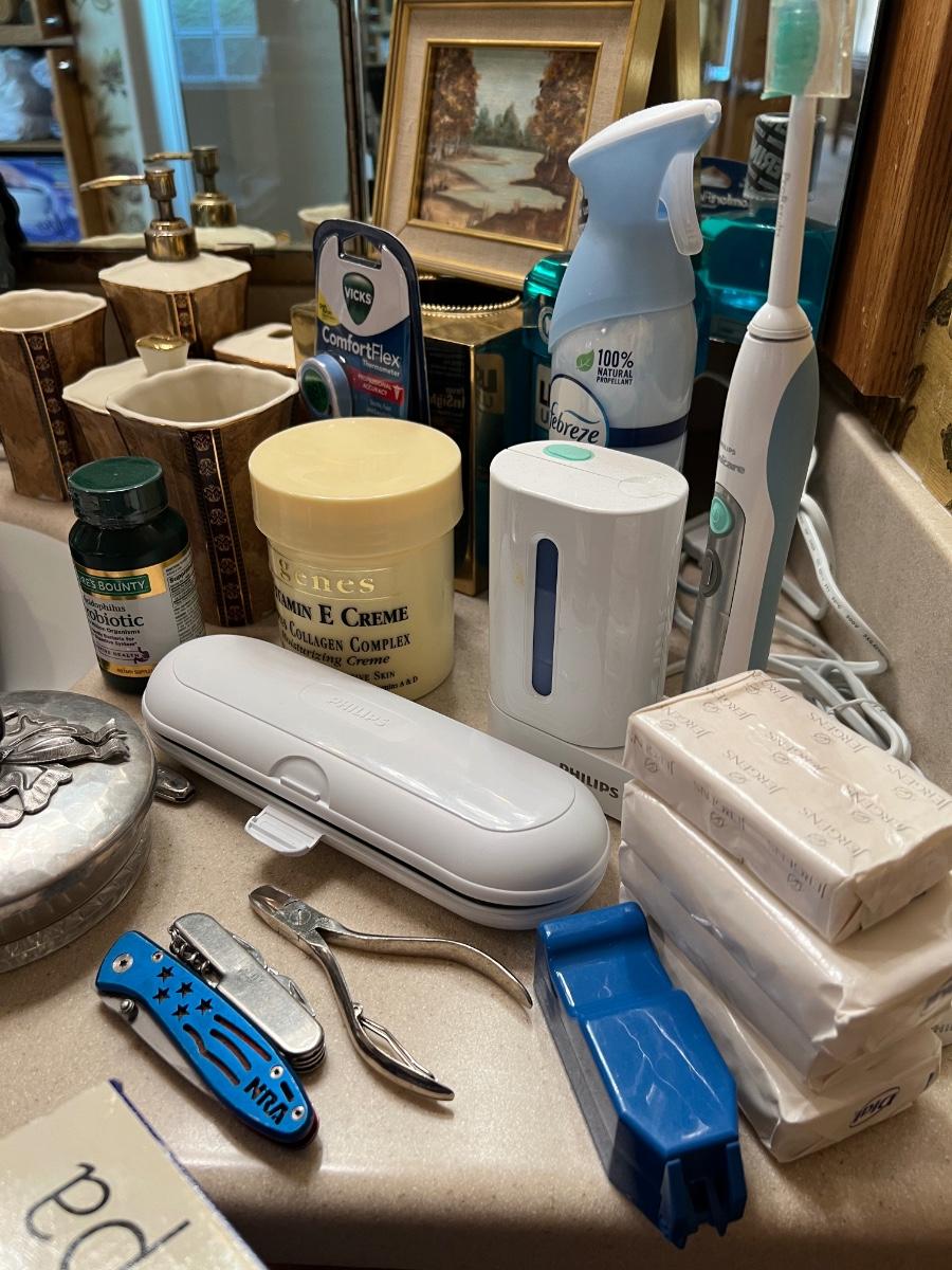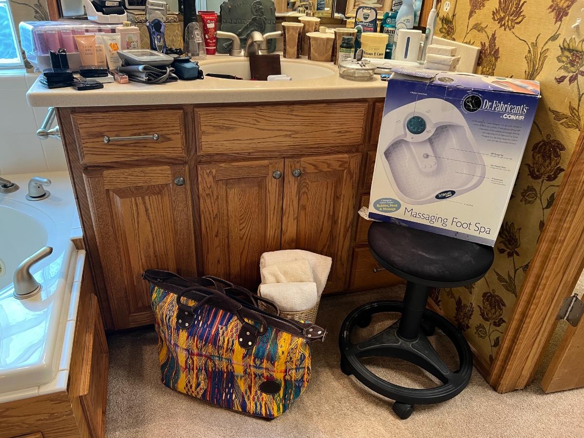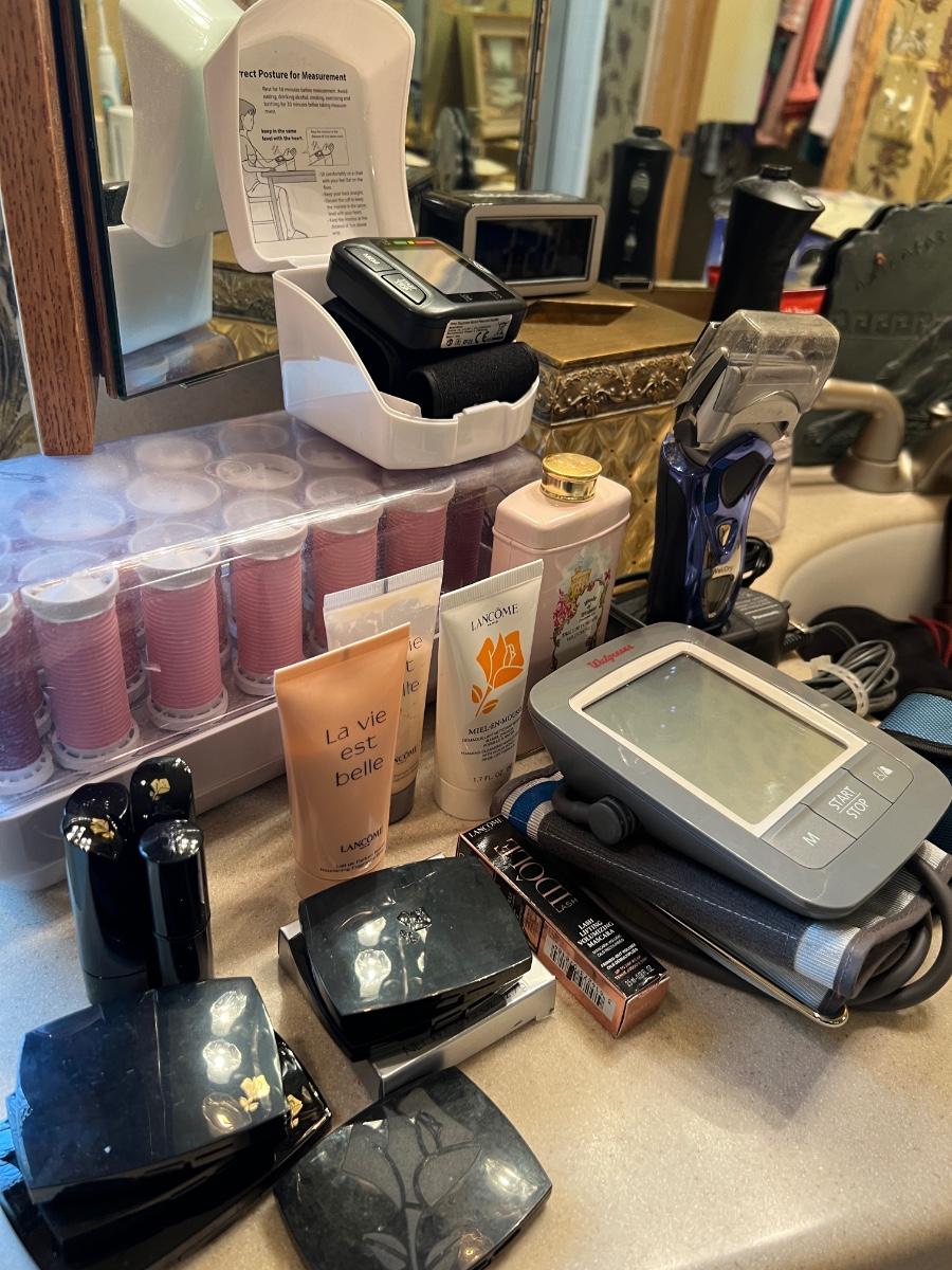 Towels, foot spa, curlers, Assortment of beauty products as pictured