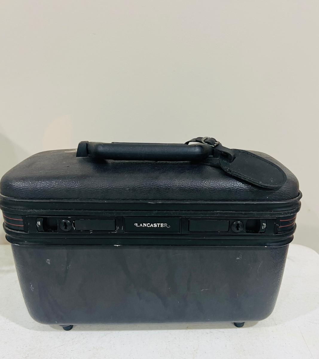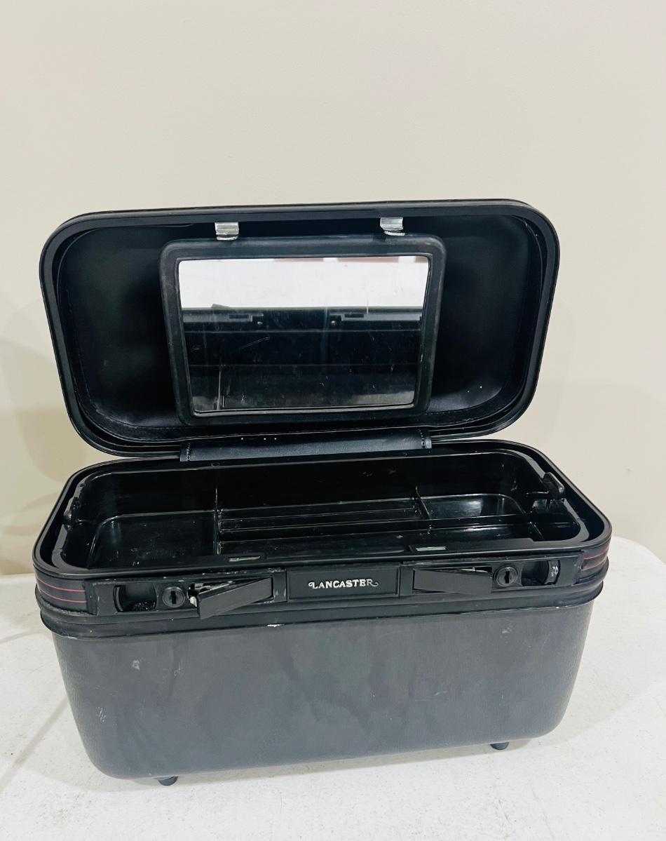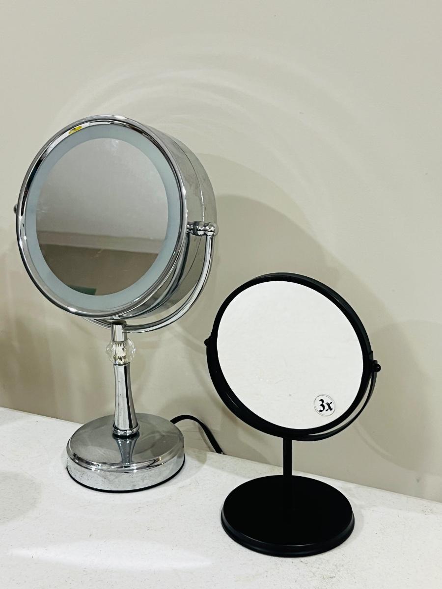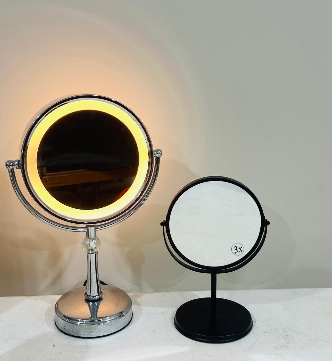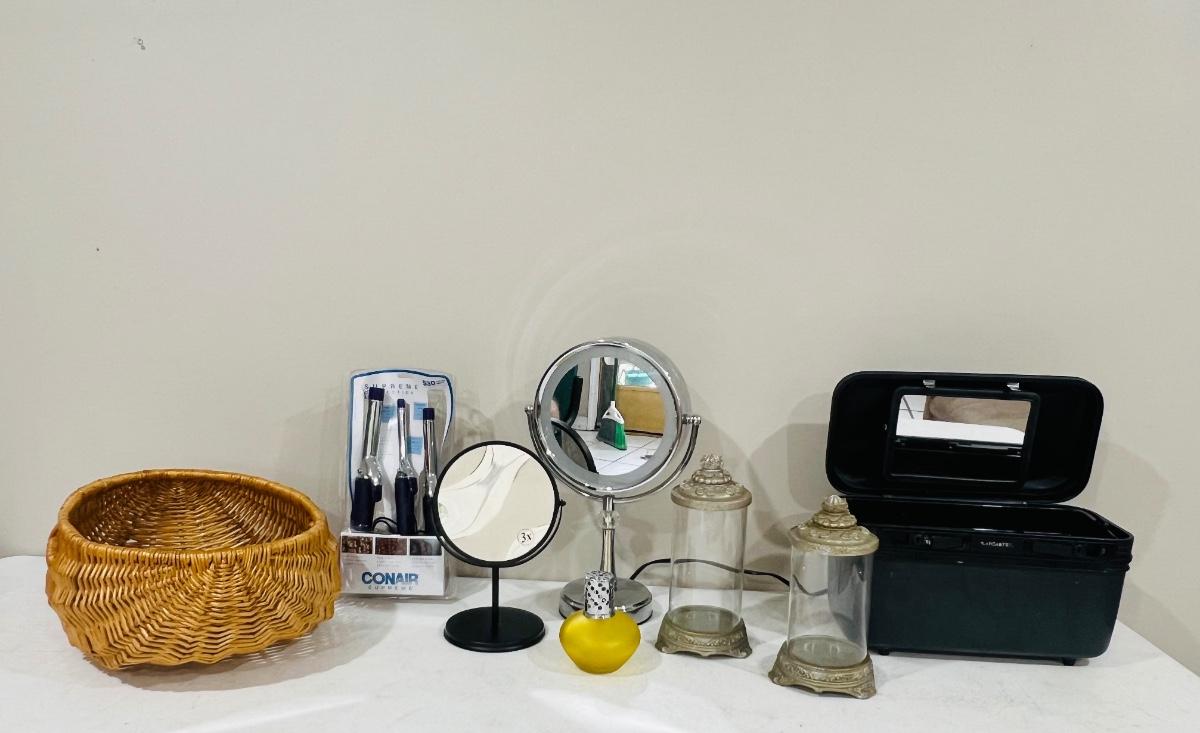 Table deal for bathroom items. LANCASTER vintage travel kit, one touch light mirror, large basket and everything else you see. Table not included.
