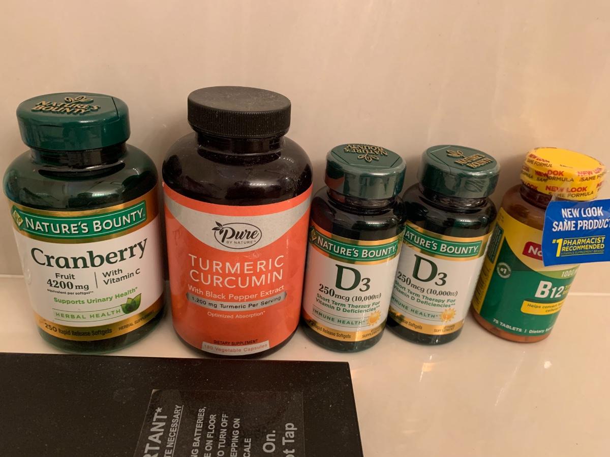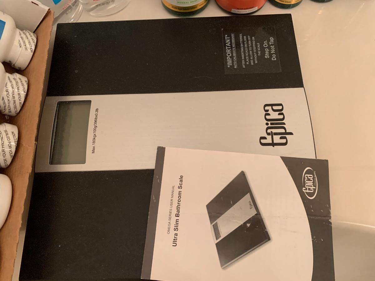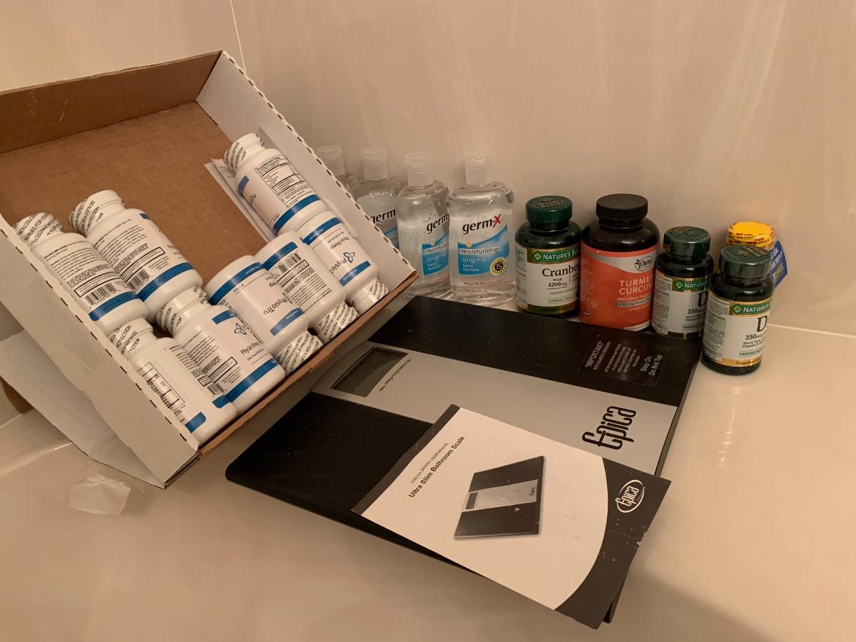 Includes a Epica bathroom scale, a box full of unopened Physic-Omega supplements, Hand Sanitizer and other vitamins.
