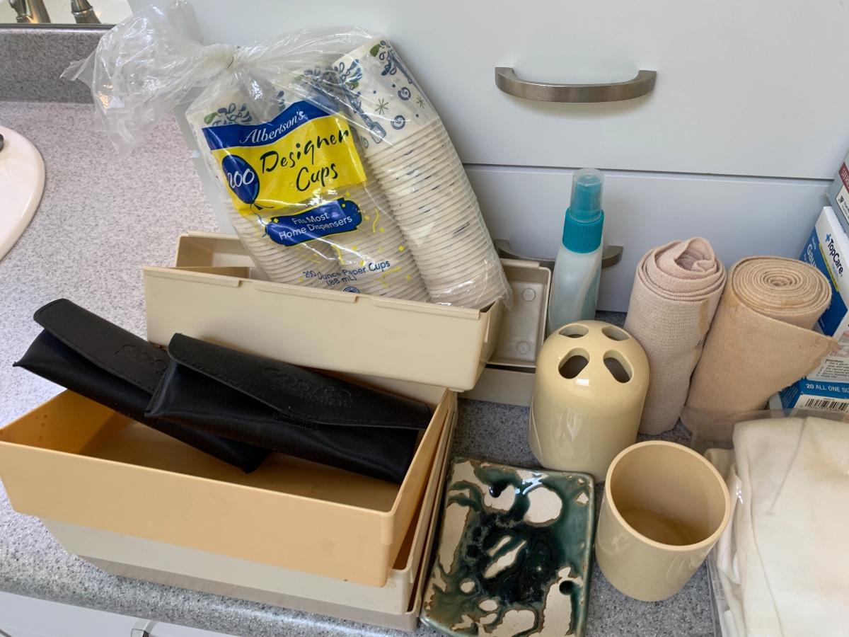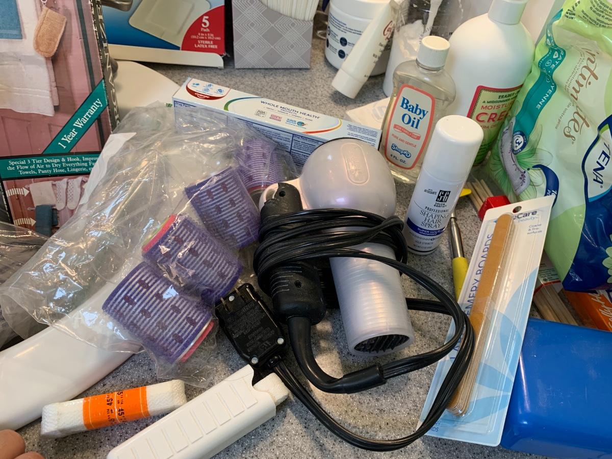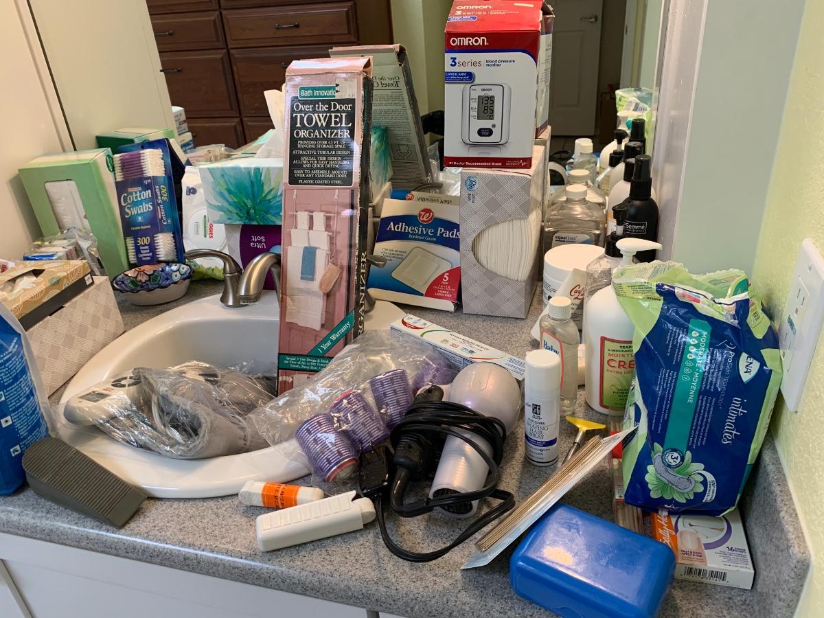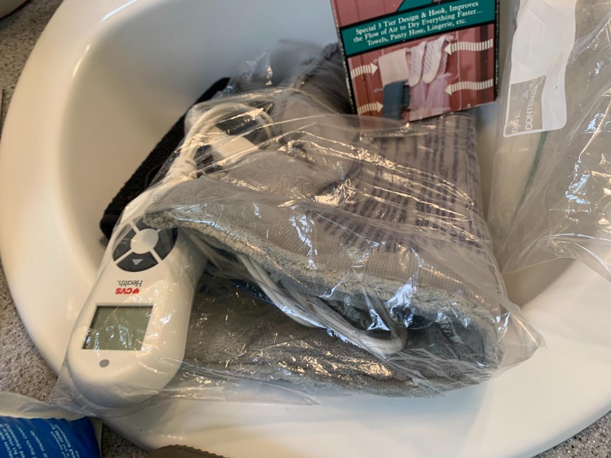 Lot includes various bathroom necessities including toothbrush holder, beauty products, heating pad, bathroom scale, non-slip bath mat, water cups, tissues, epsom salt, cotton swabs, a Omiron Blood Pressure Cuff and much more!