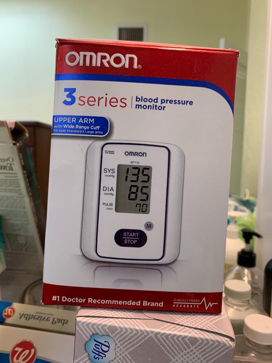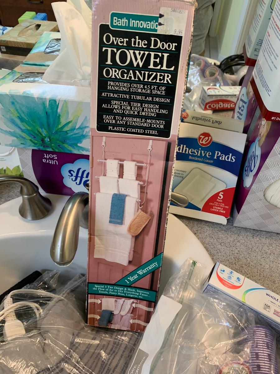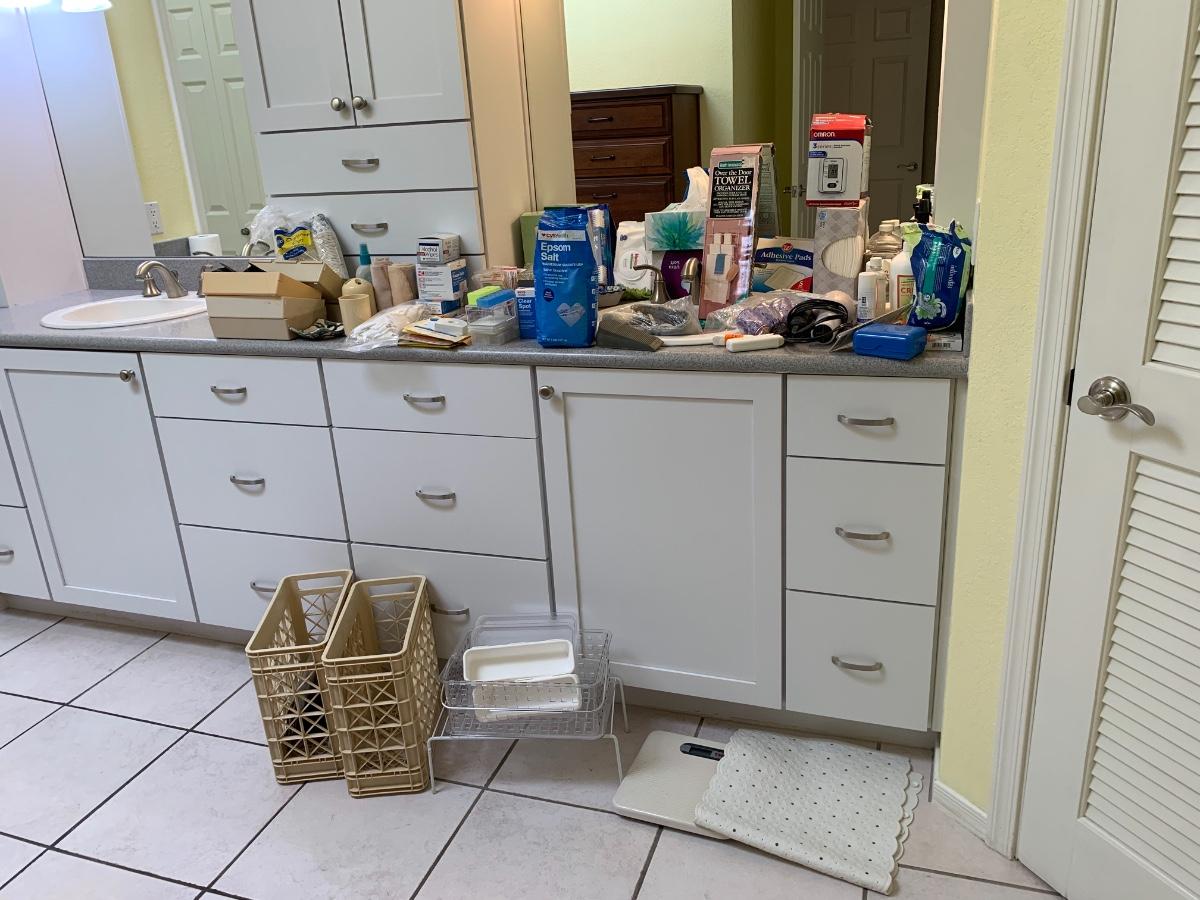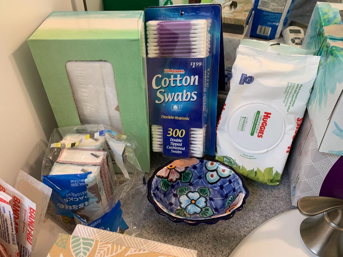 Lot includes various bathroom necessities including toothbrush holder, beauty products, heating pad, bathroom scale, non-slip bath mat, water cups, tissues, epsom salt, cotton swabs, a Omiron Blood Pressure Cuff and much more!