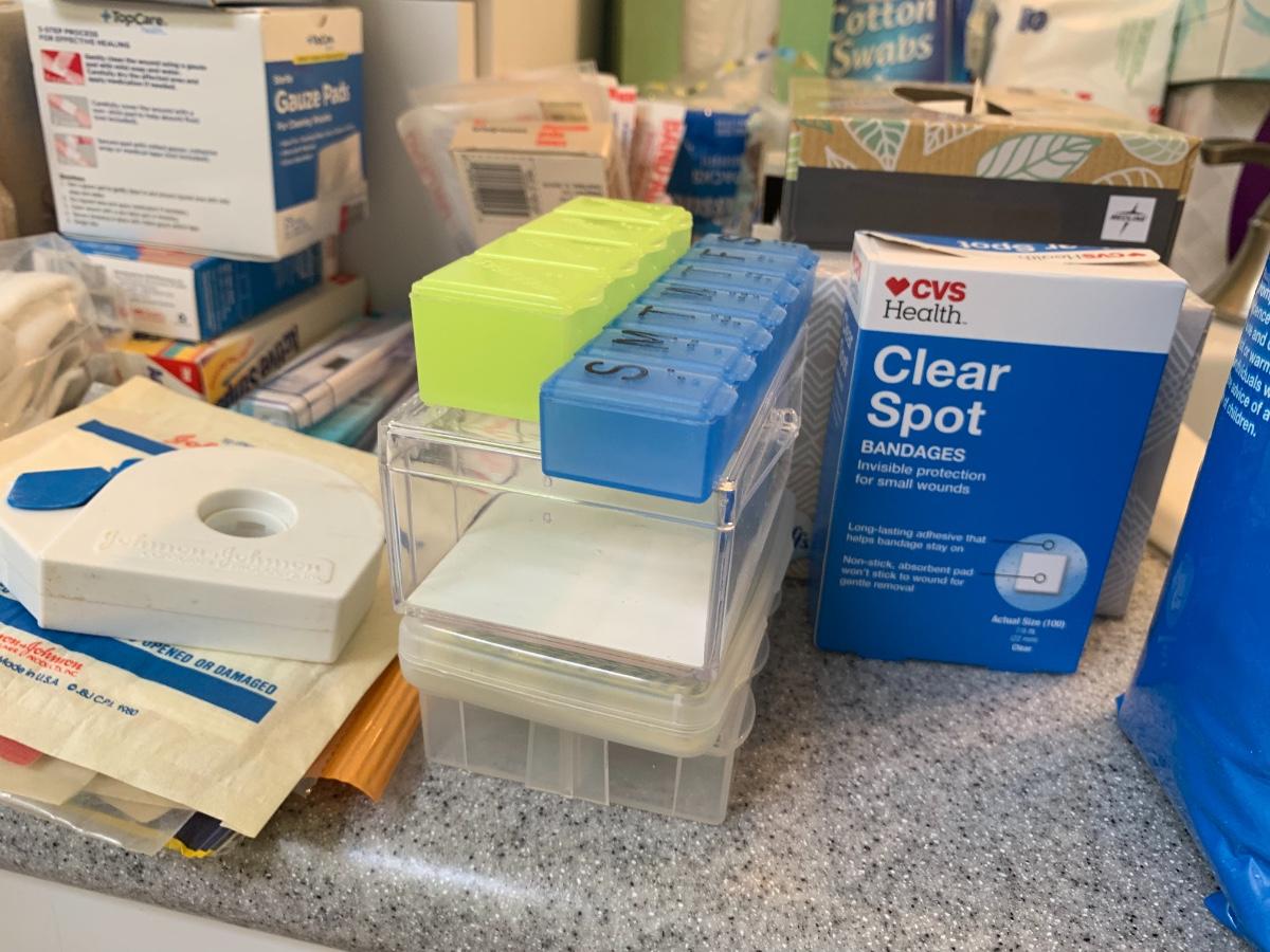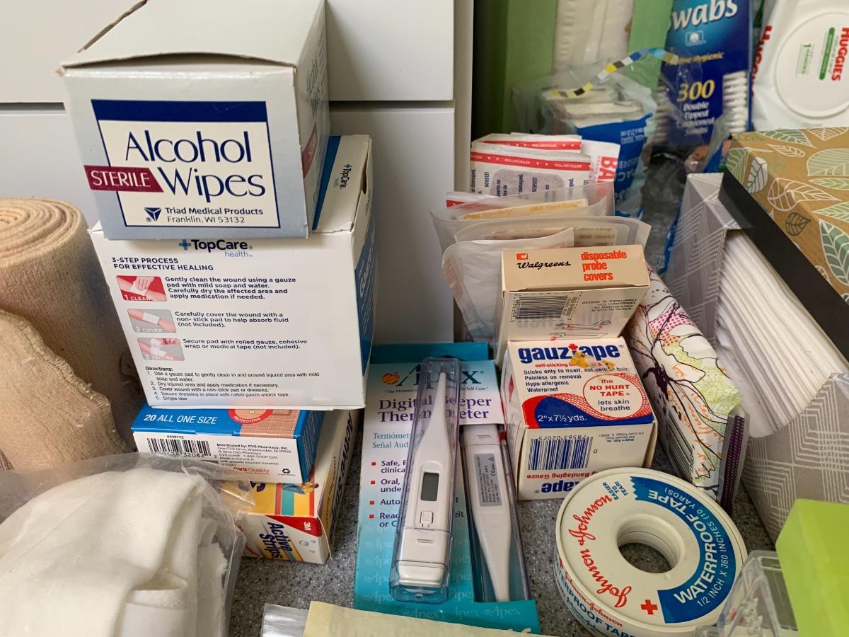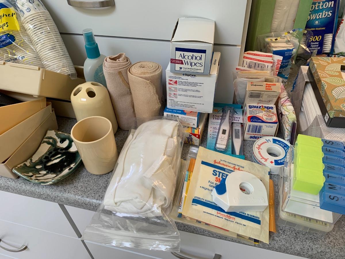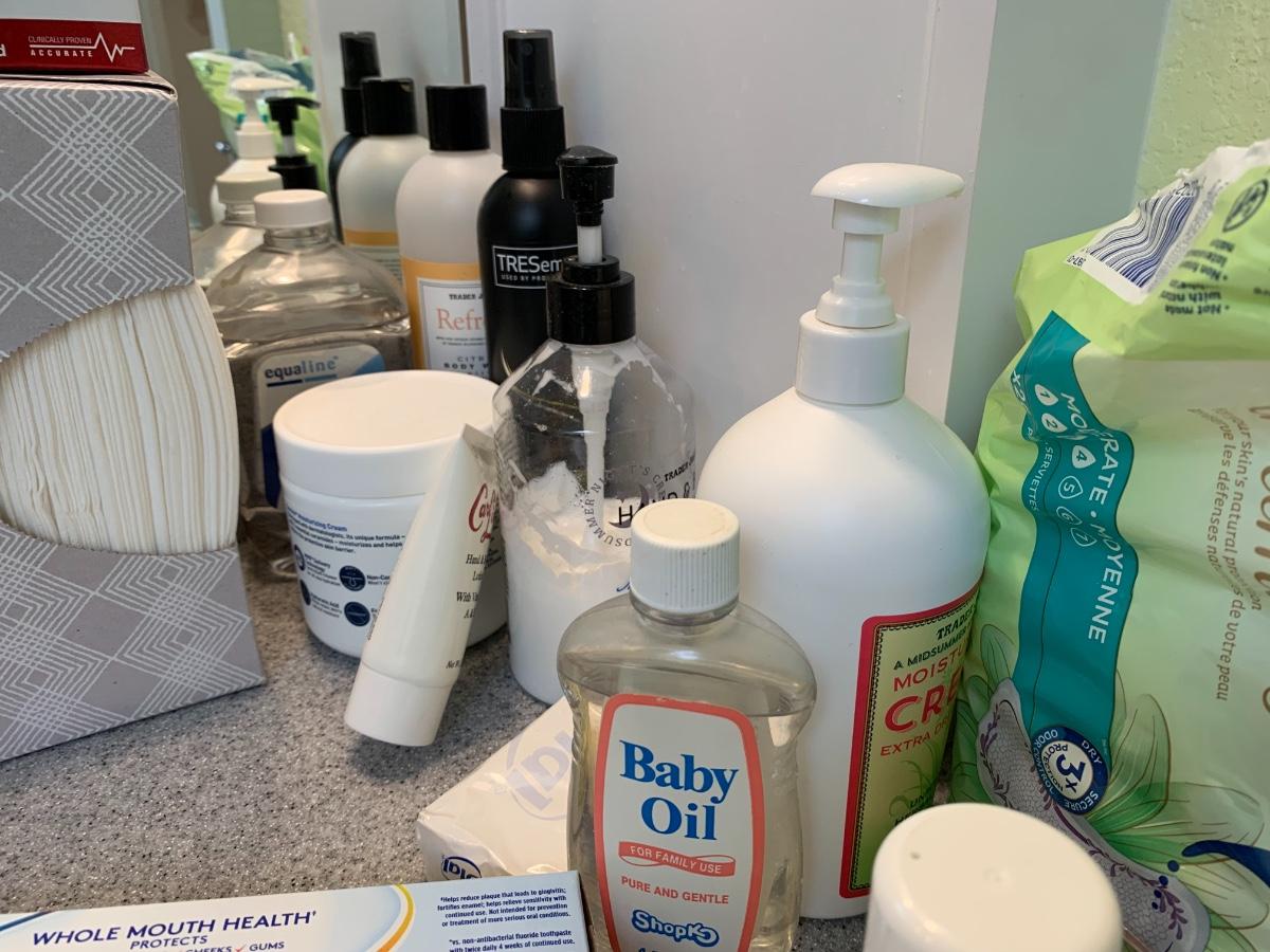 Lot includes various bathroom necessities including toothbrush holder, beauty products, heating pad, bathroom scale, non-slip bath mat, water cups, tissues, epsom salt, cotton swabs, a Omiron Blood Pressure Cuff and much more!