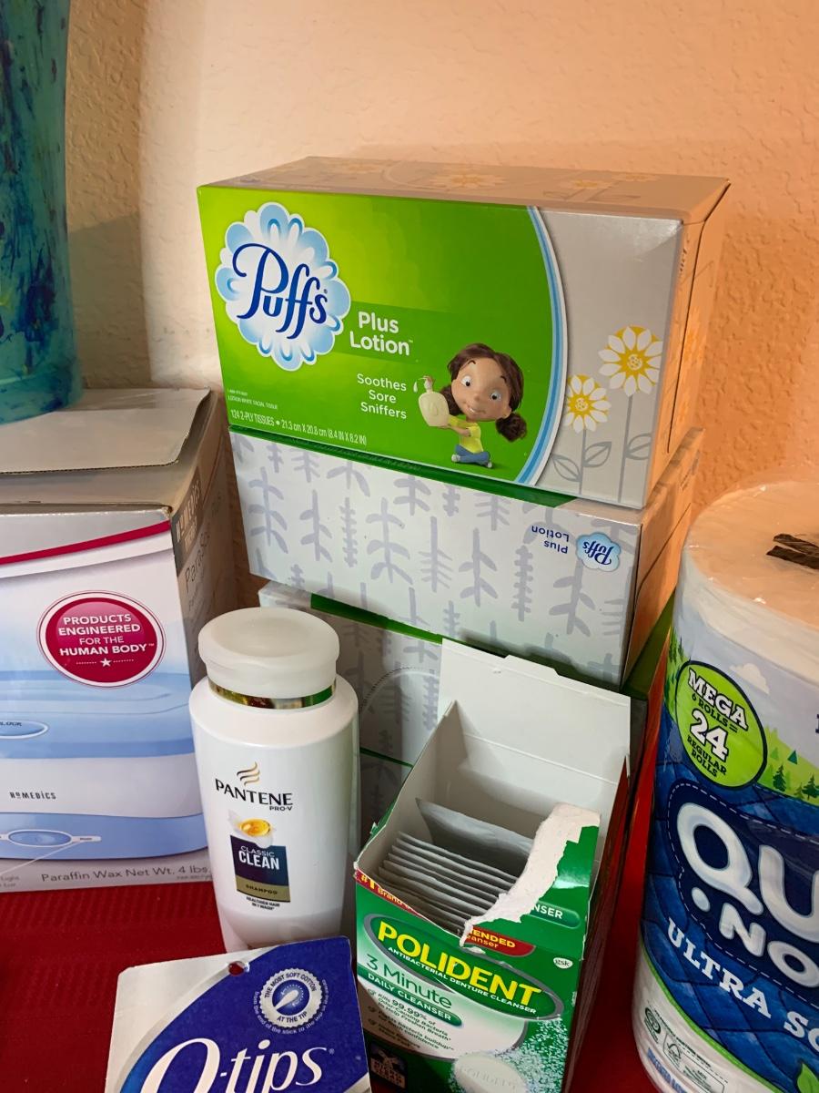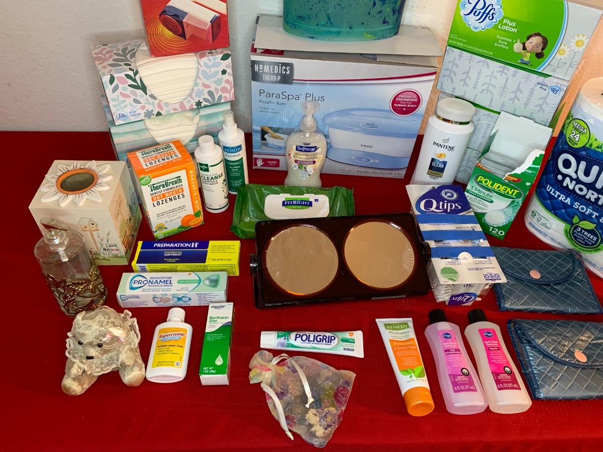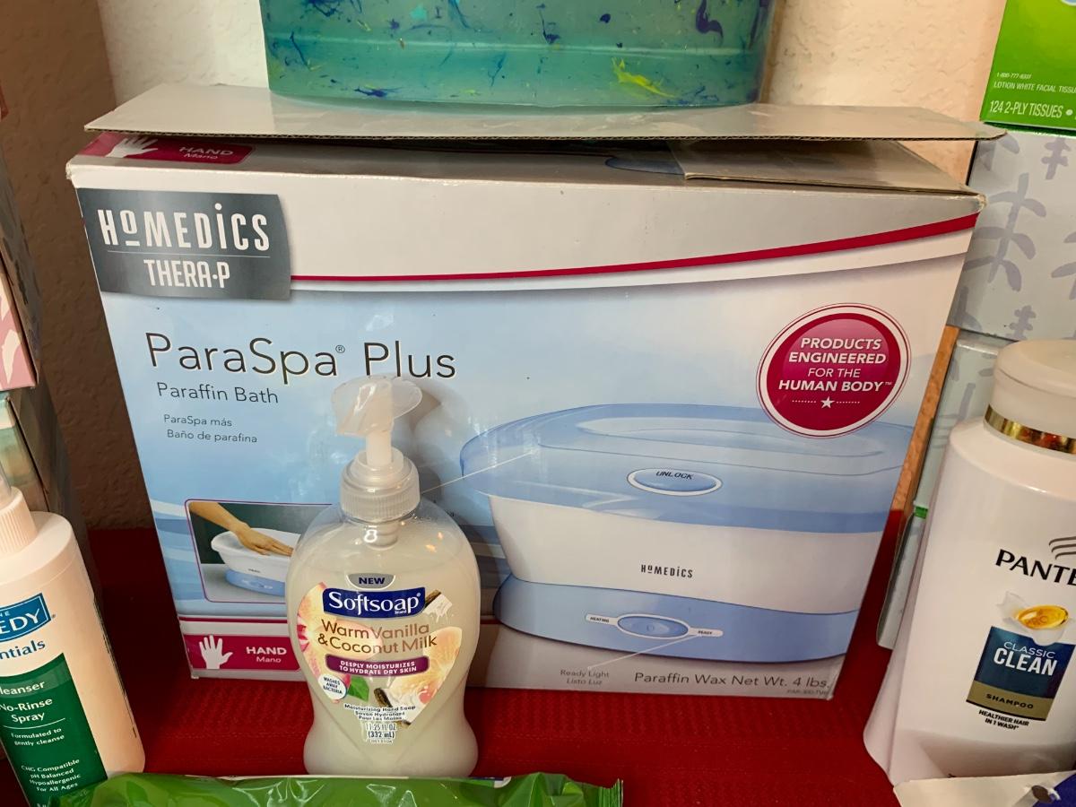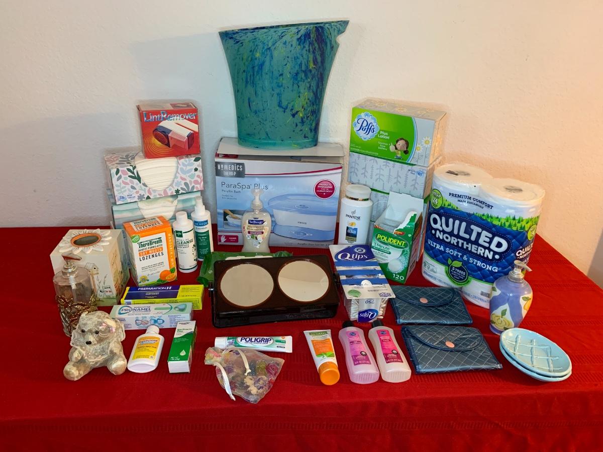 Include Homedics parafin hand bath, make up mirror, trash can, soap dispensers, bath tissue, Kleenex and more!