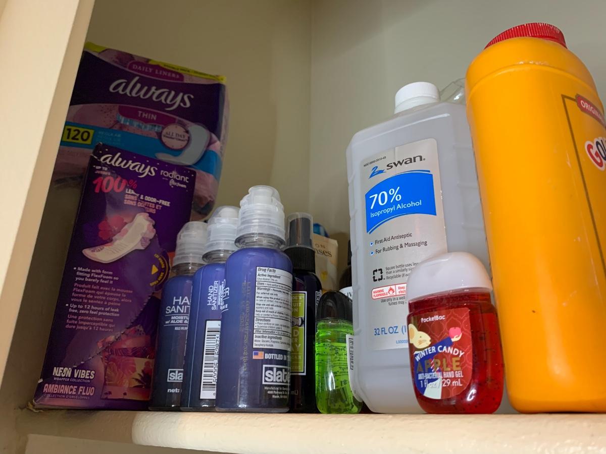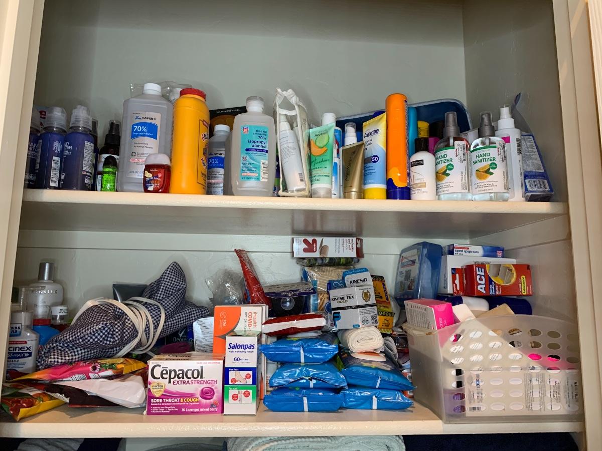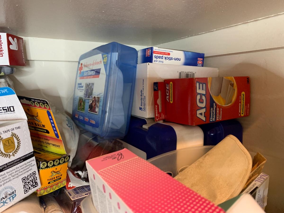 A closet full of mixed restroom supplies including OTC medicine and first aid essentials. All in good condition and not expired.