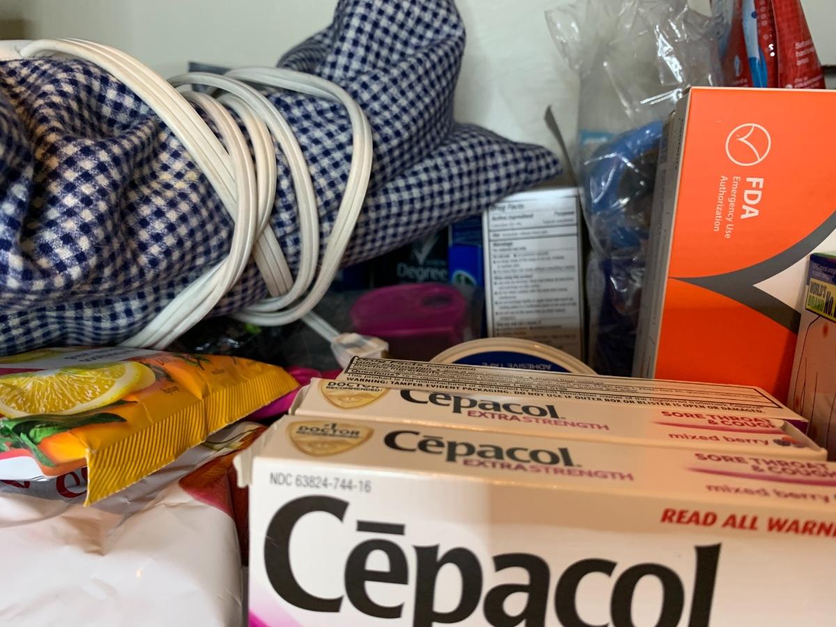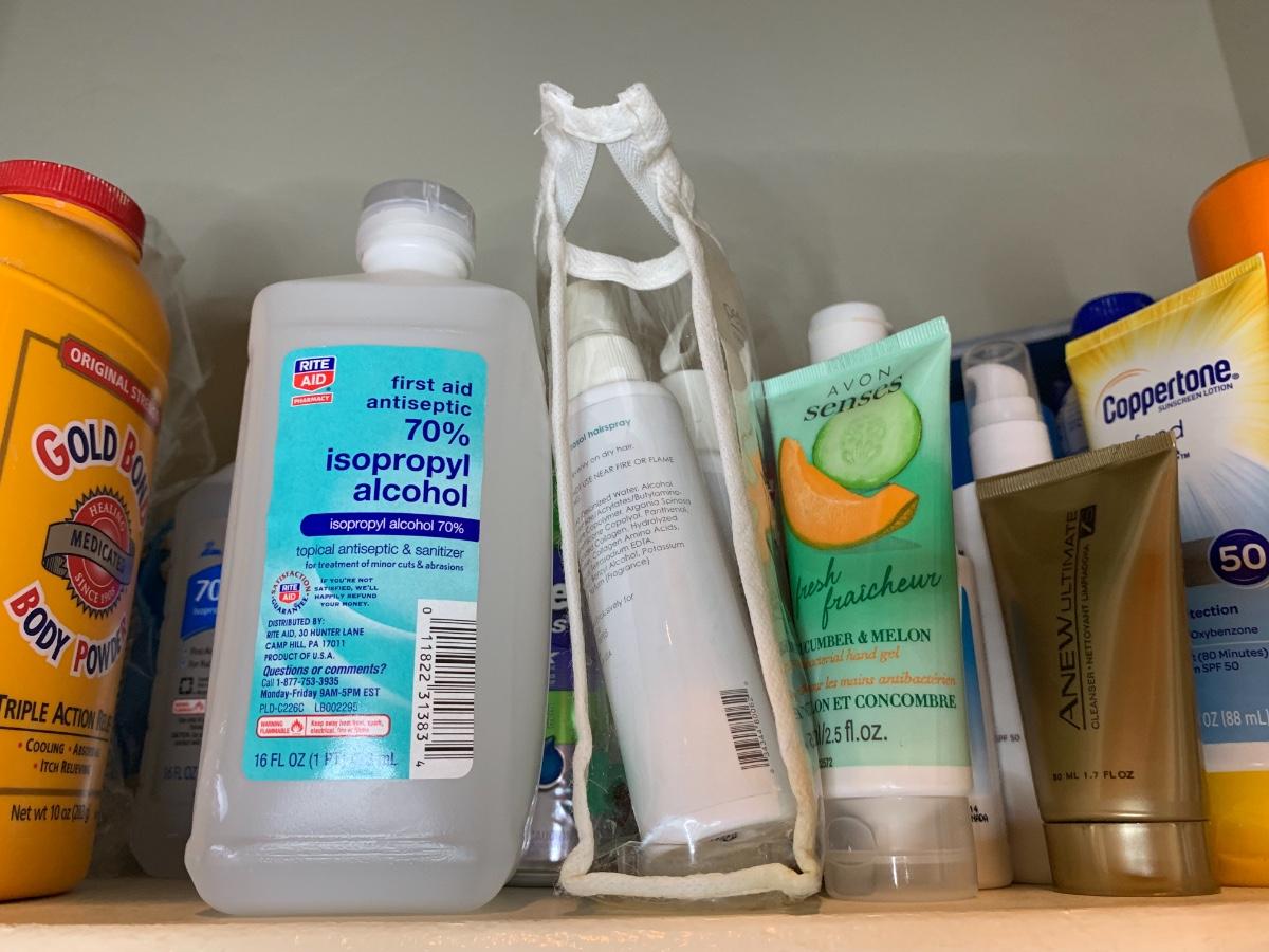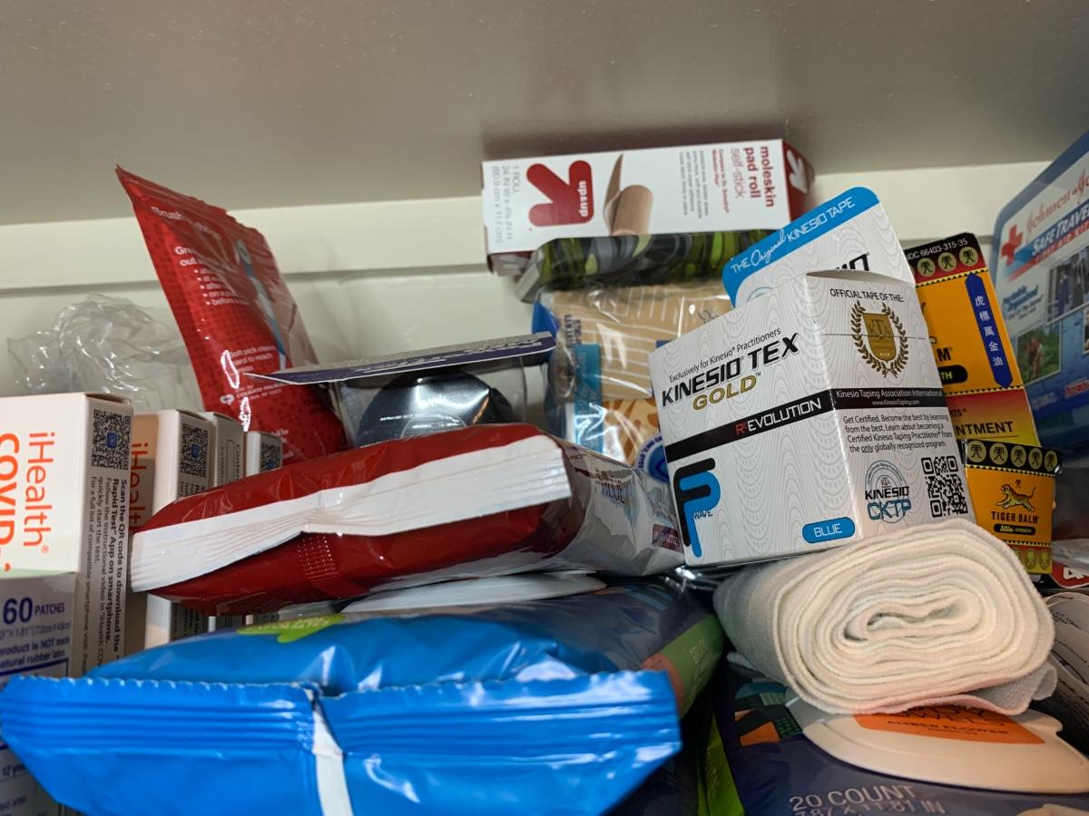 A closet full of mixed restroom supplies including OTC medicine and first aid essentials. All in good condition and not expired.