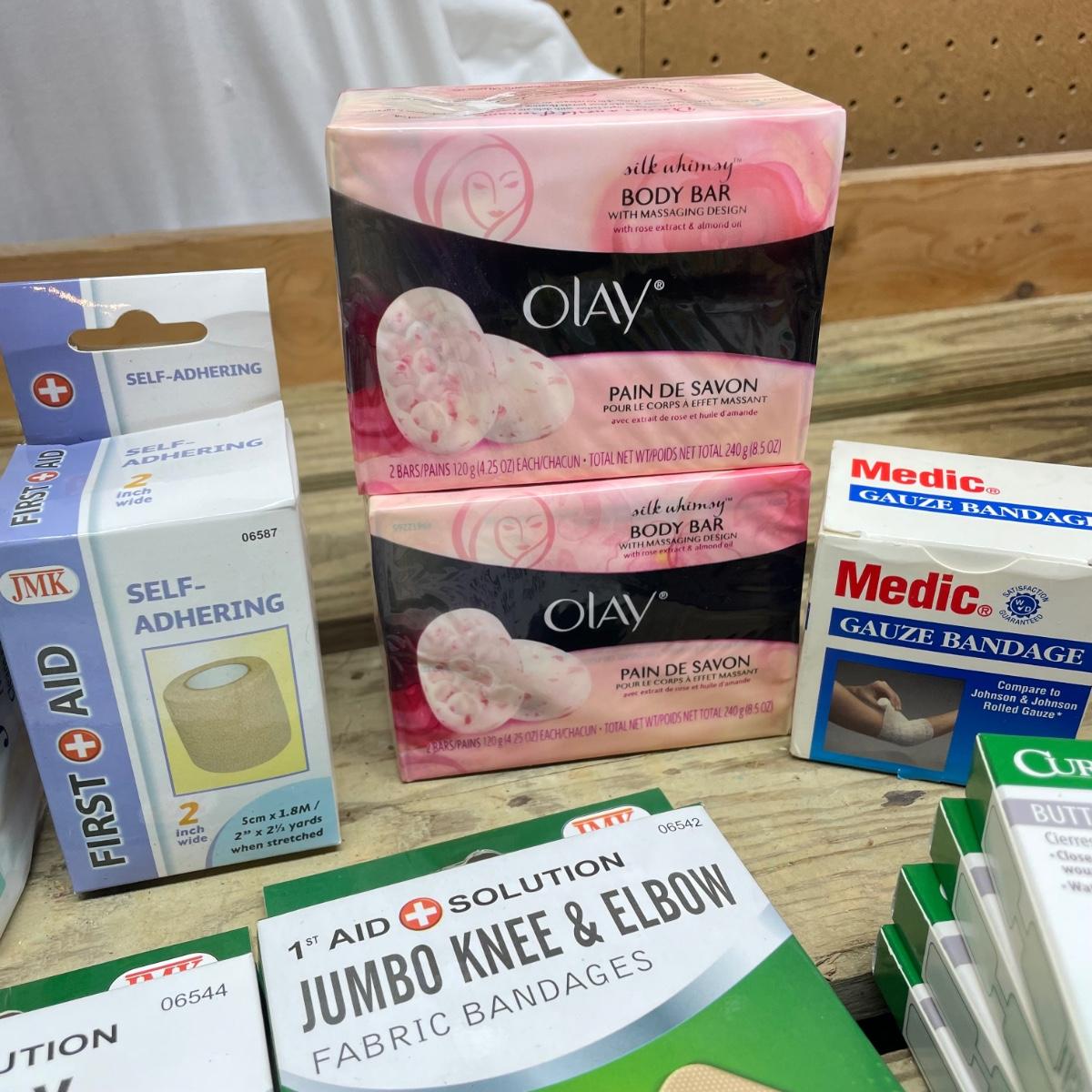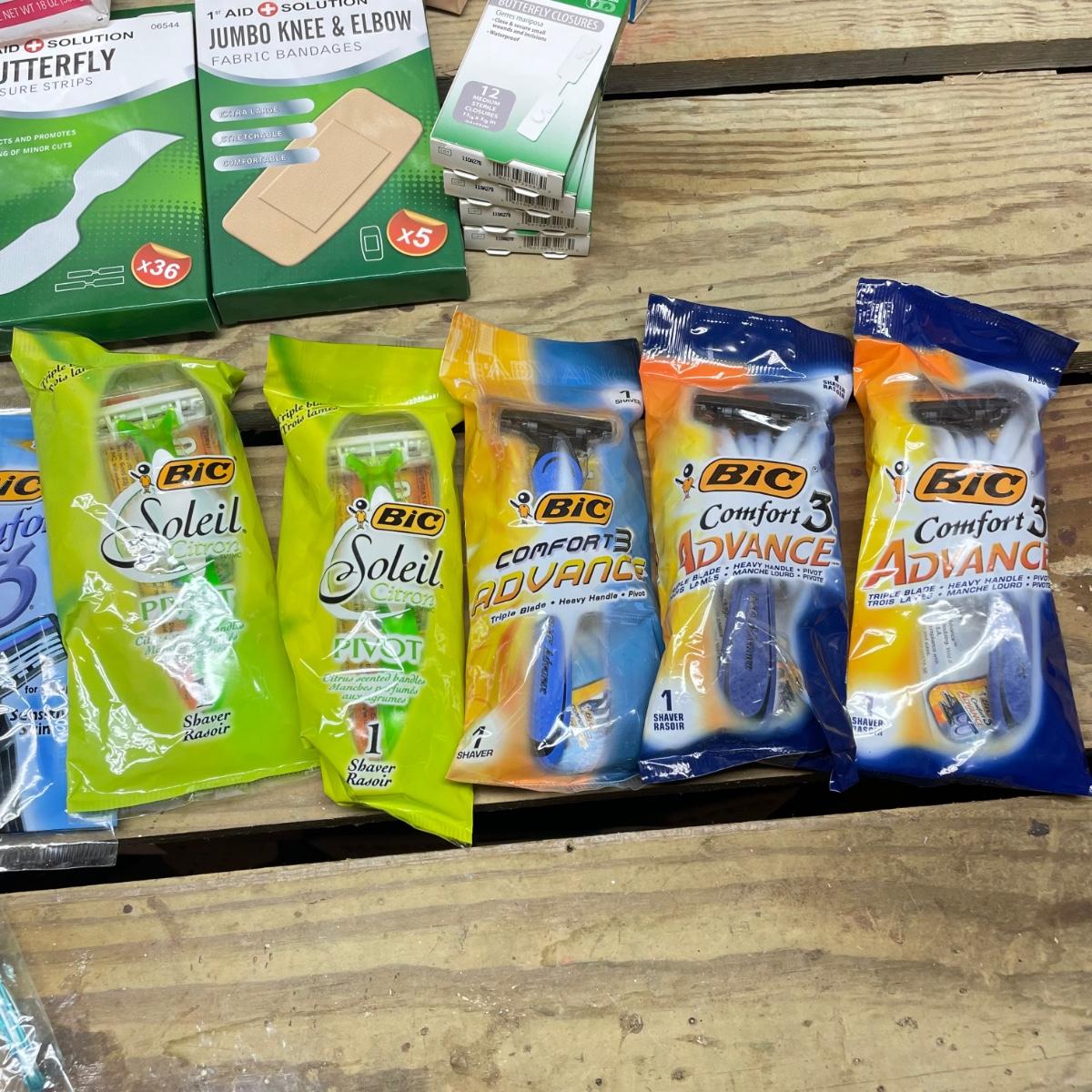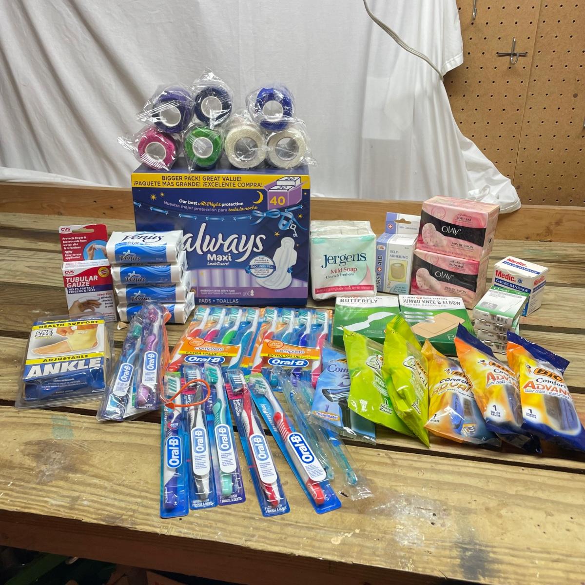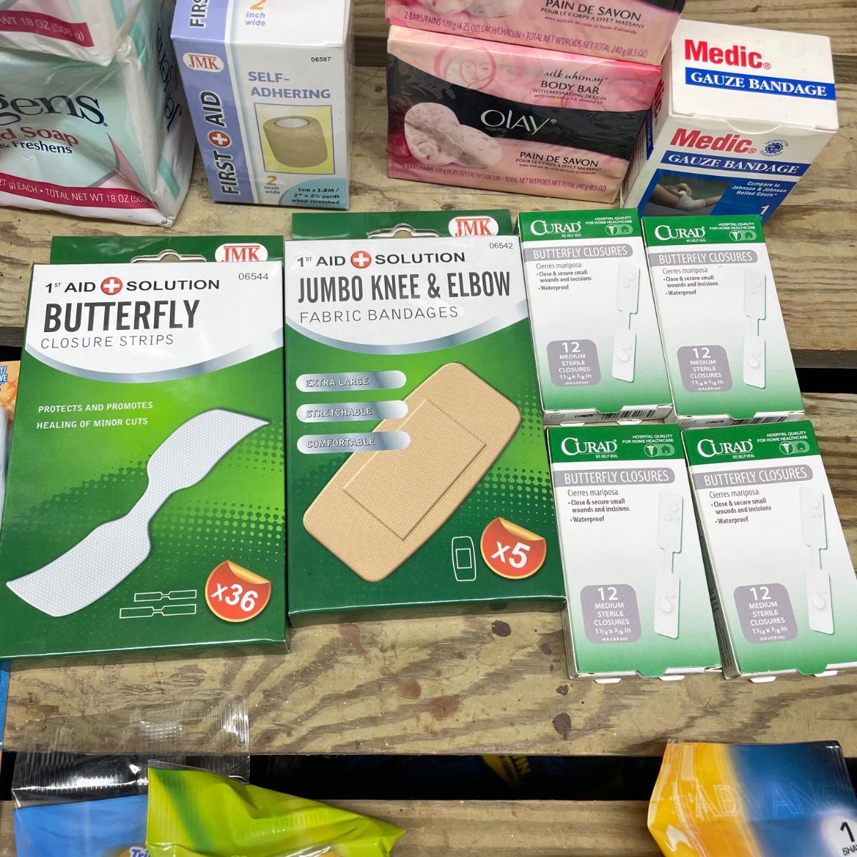 Lot includes Oral B toothbrushes, six single packs of razors, Co-Flex flexible bandages, multiple bars of soap, butterfly bandages and more.