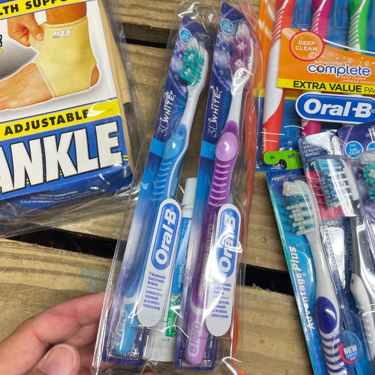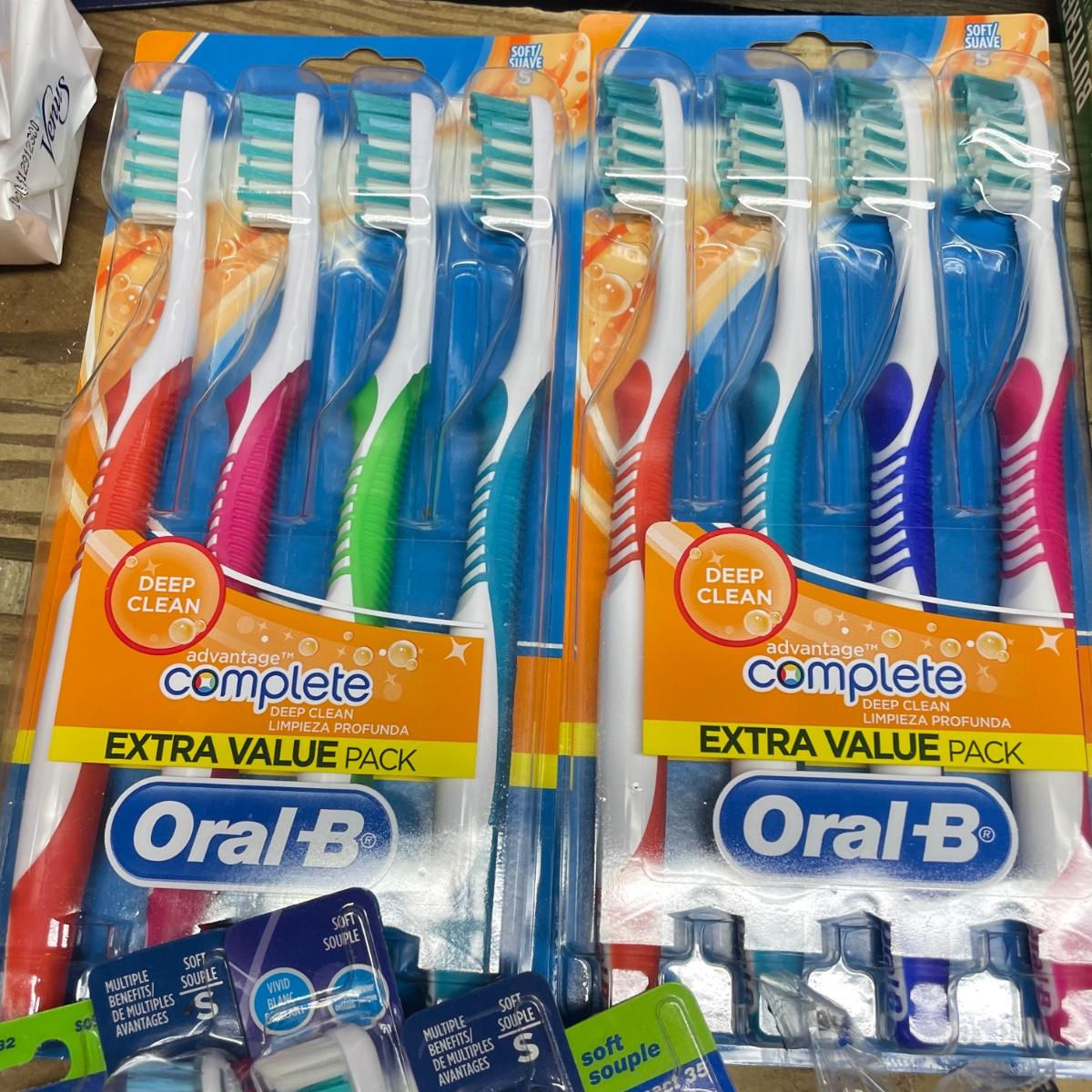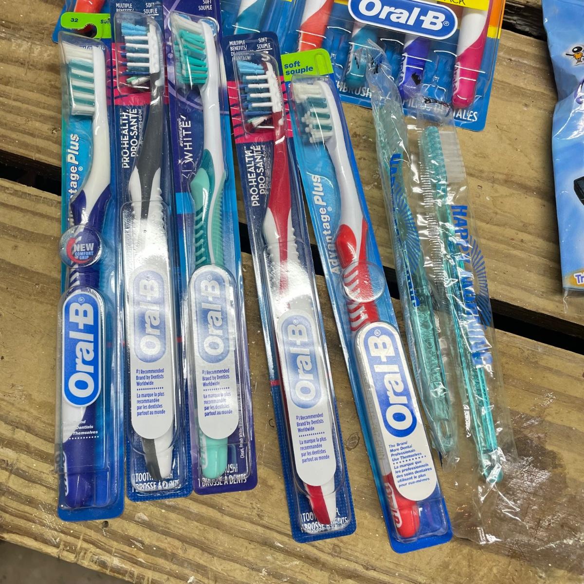 Lot includes Oral B toothbrushes, six single packs of razors, Co-Flex flexible bandages, multiple bars of soap, butterfly bandages and more.