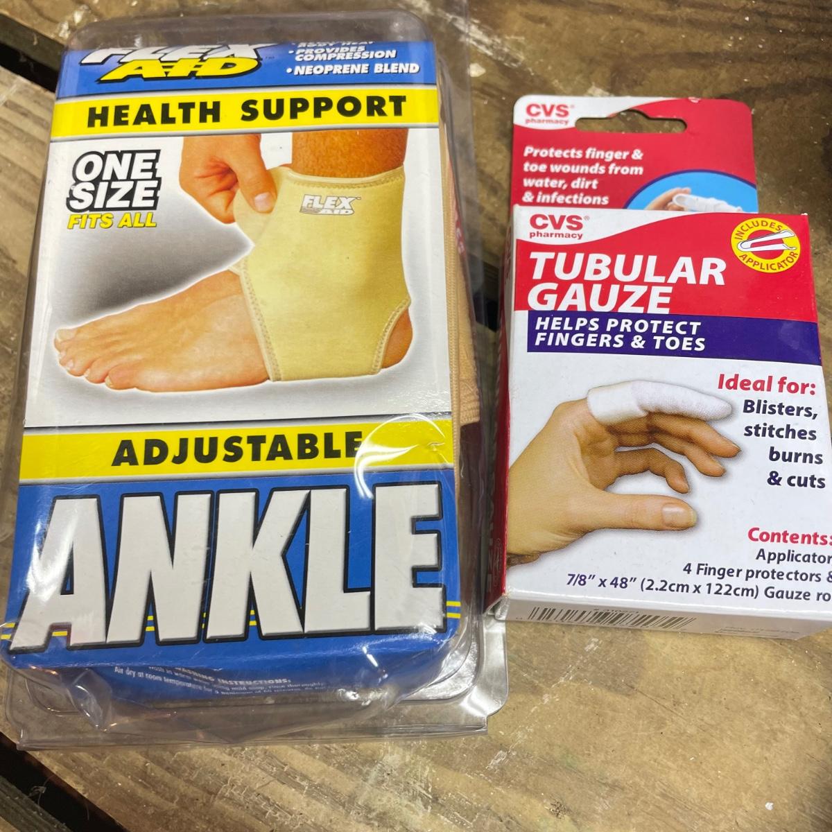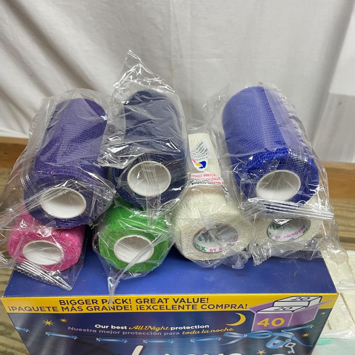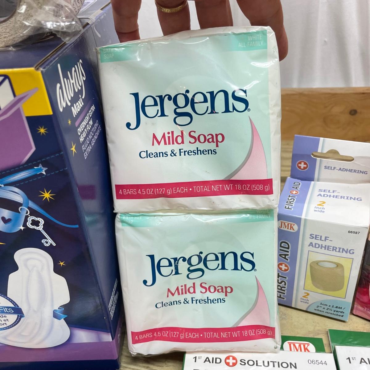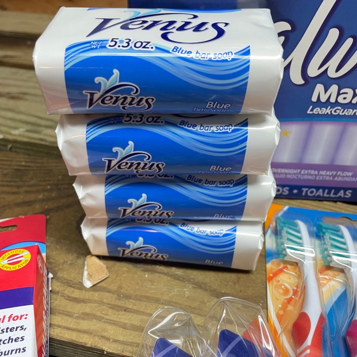 Lot includes Oral B toothbrushes, six single packs of razors, Co-Flex flexible bandages, multiple bars of soap, butterfly bandages and more.