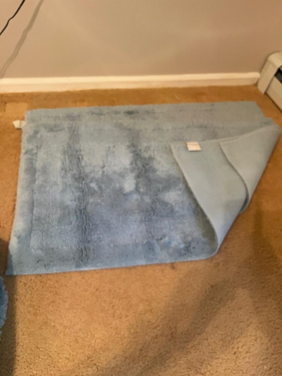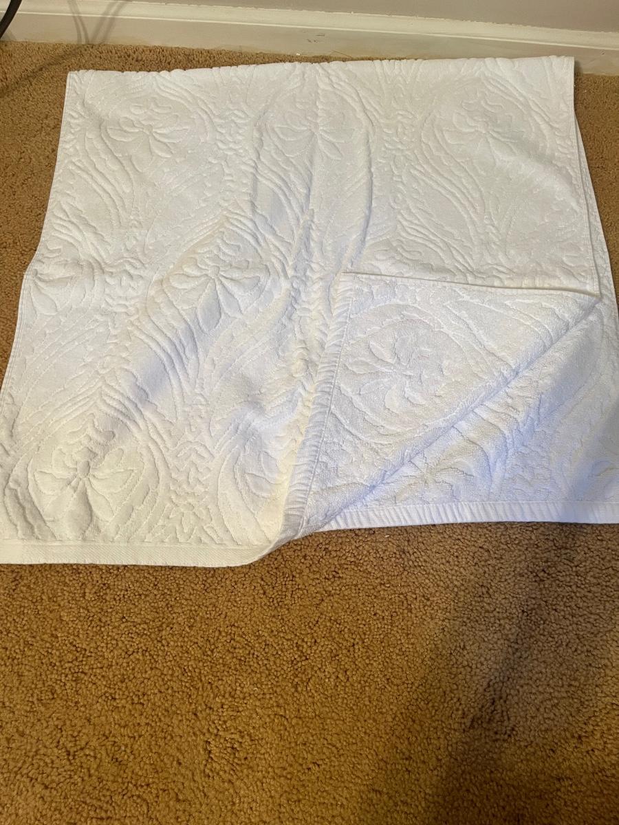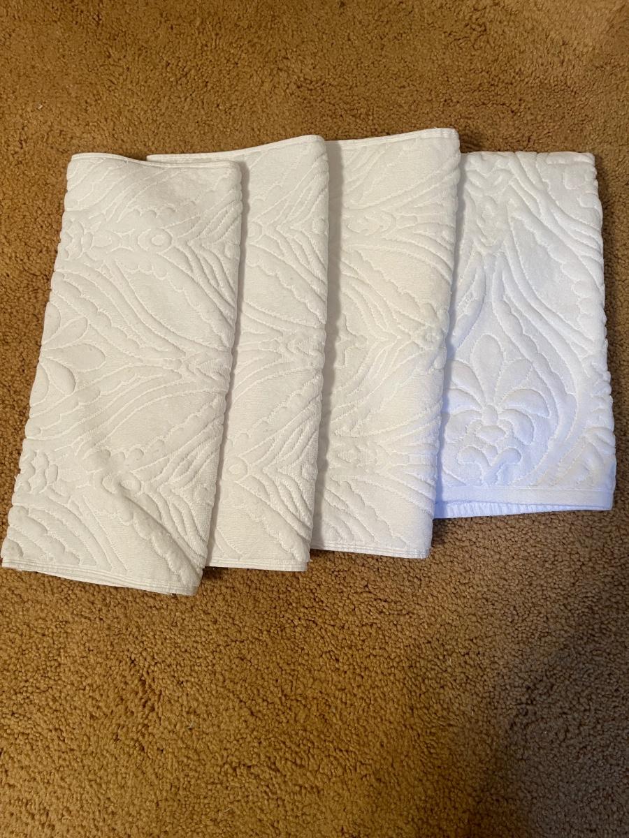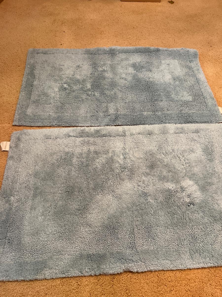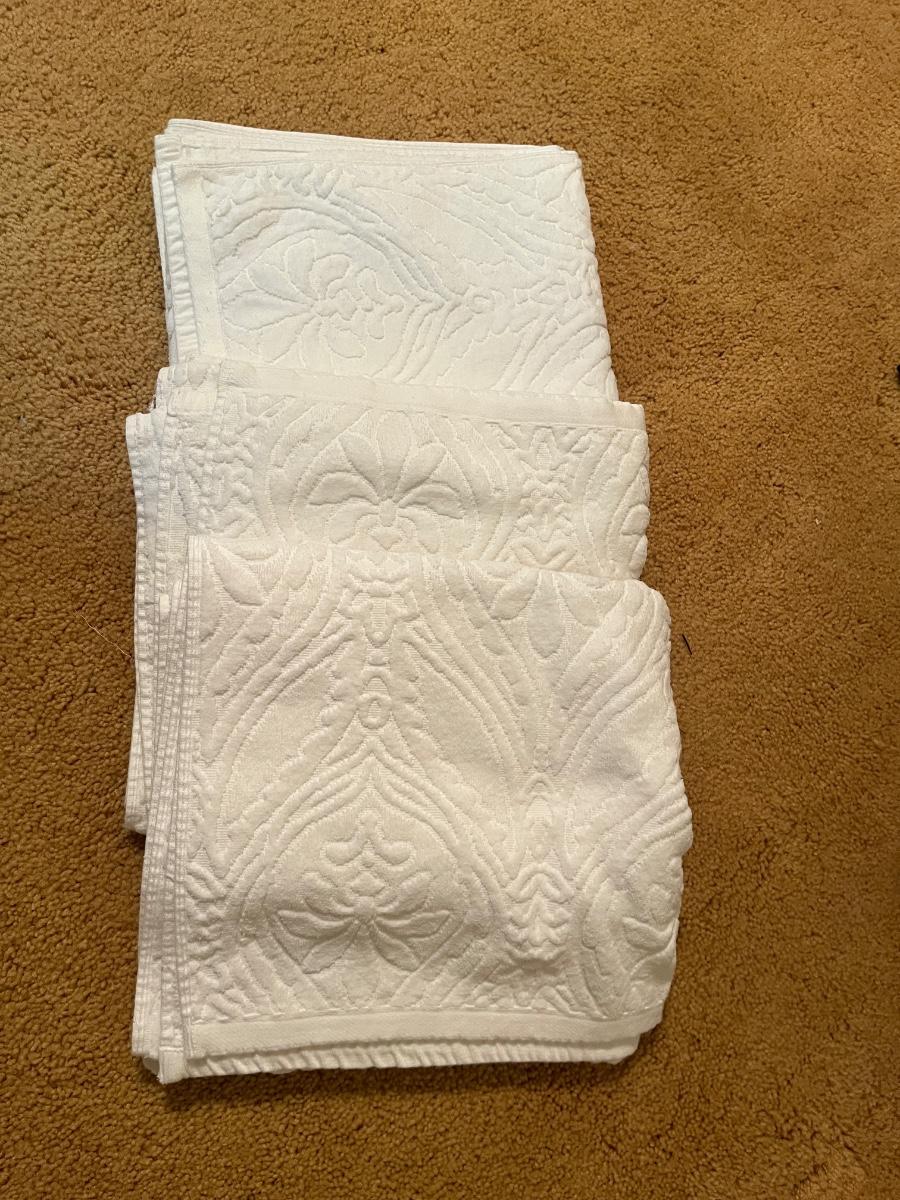 Lot includes four blue bathroom rugs and two green bathroom rugs all with rubber backing and white bath towels, wash cloths and hand towels. Largest rug measures 24” x 41” and largest bath towel measures 26” x 50”.
