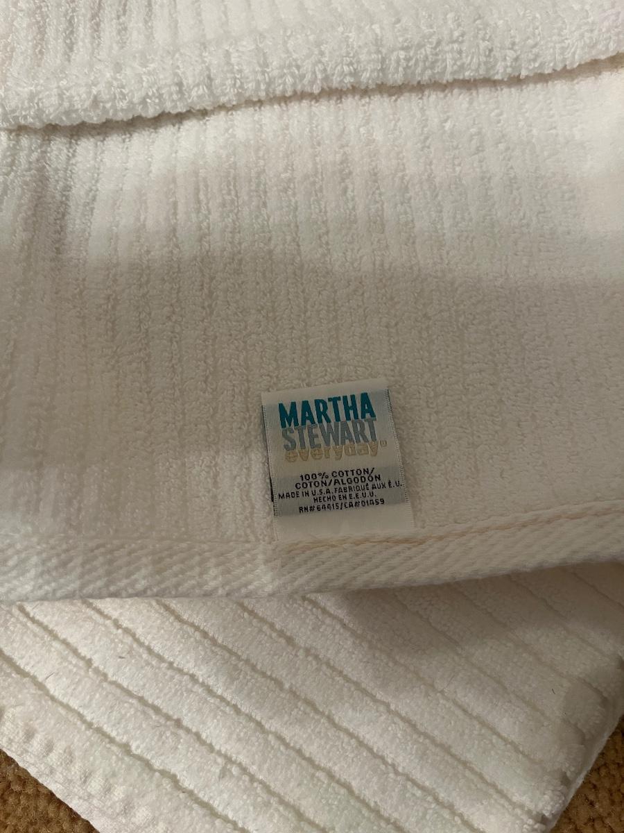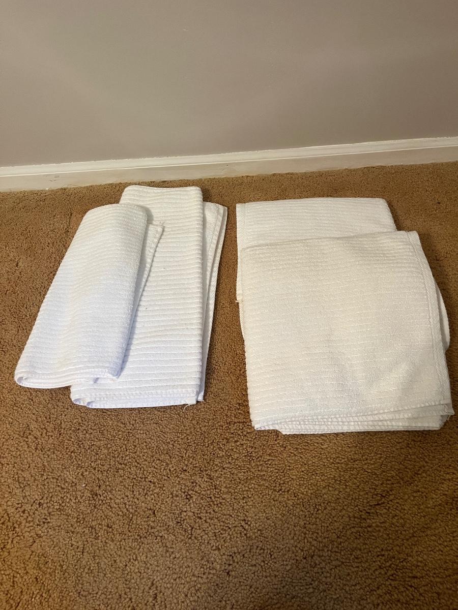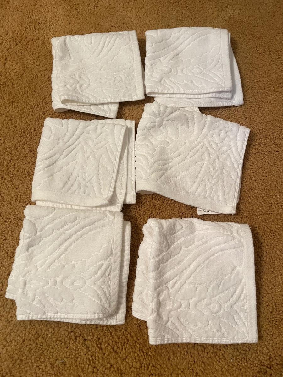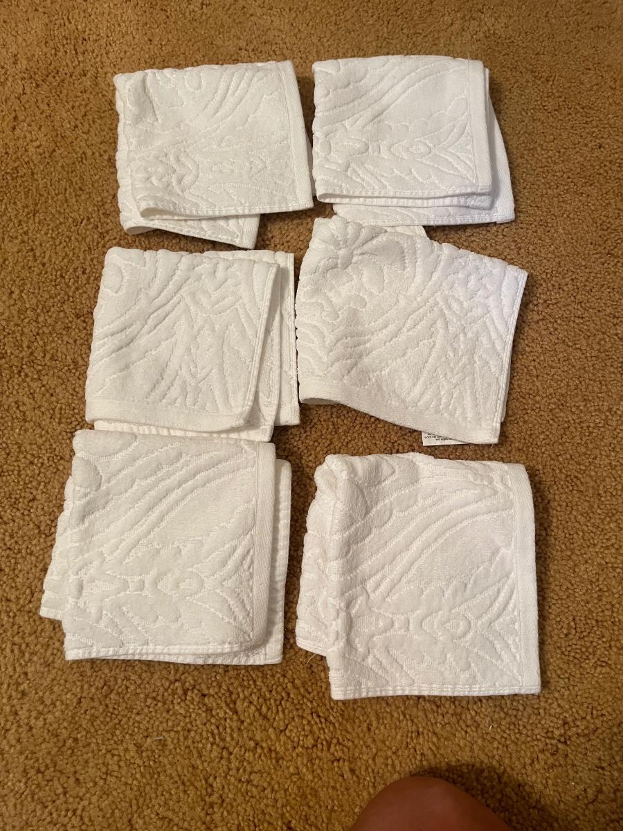 Lot includes four blue bathroom rugs and two green bathroom rugs all with rubber backing and white bath towels, wash cloths and hand towels. Largest rug measures 24” x 41” and largest bath towel measures 26” x 50”.