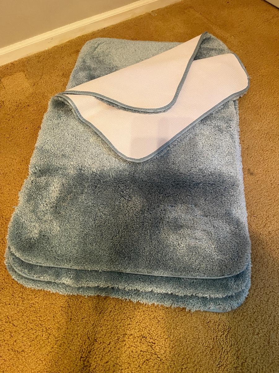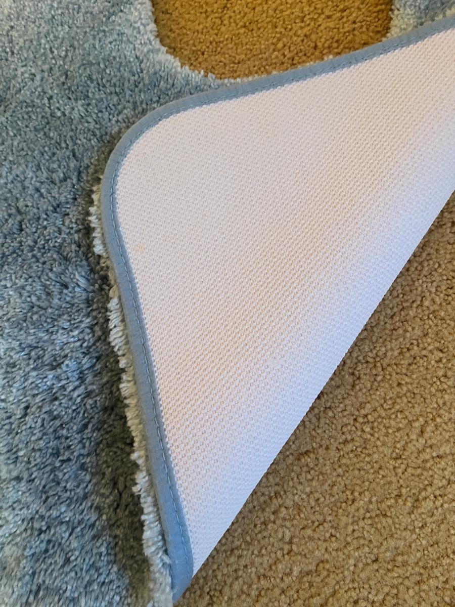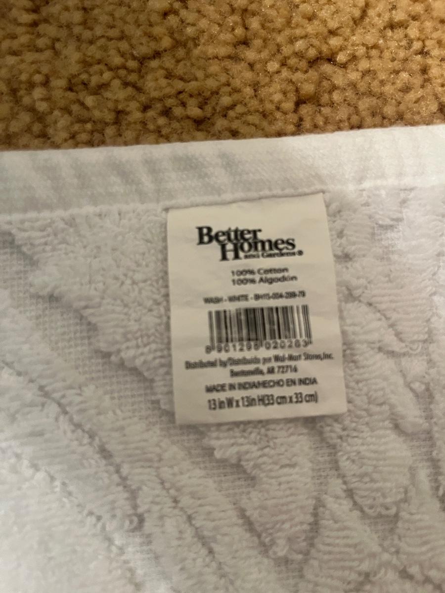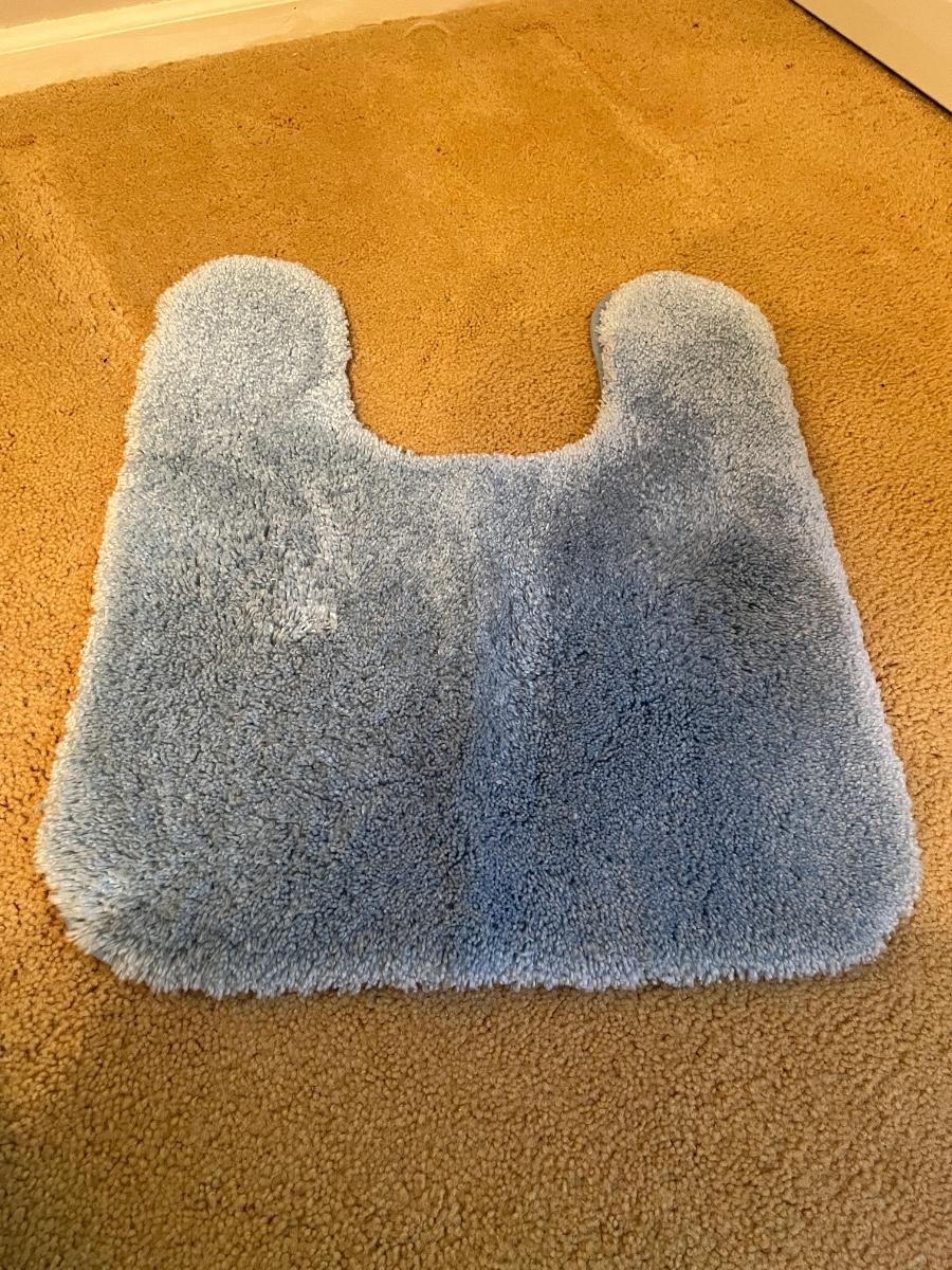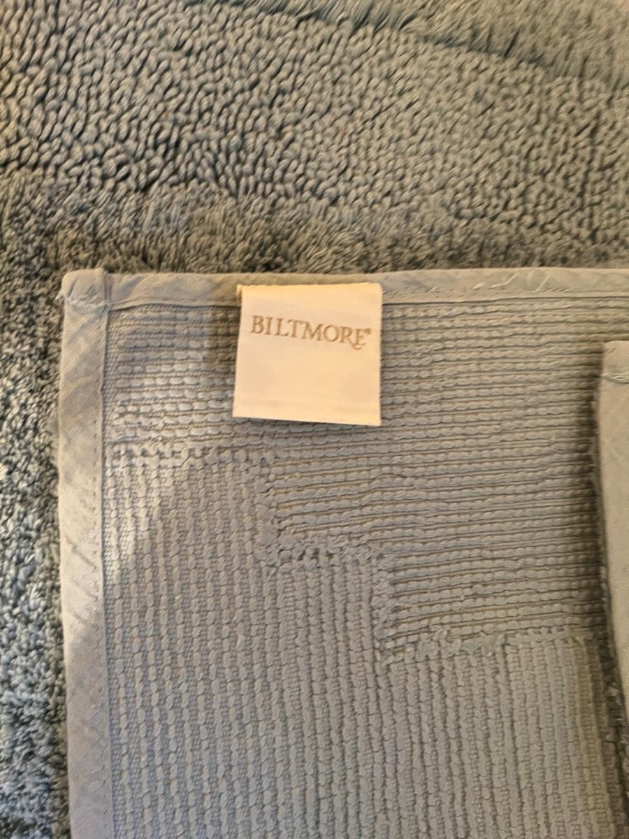 Lot includes four blue bathroom rugs and two green bathroom rugs all with rubber backing and white bath towels, wash cloths and hand towels. Largest rug measures 24” x 41” and largest bath towel measures 26” x 50”.