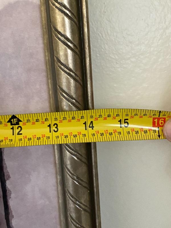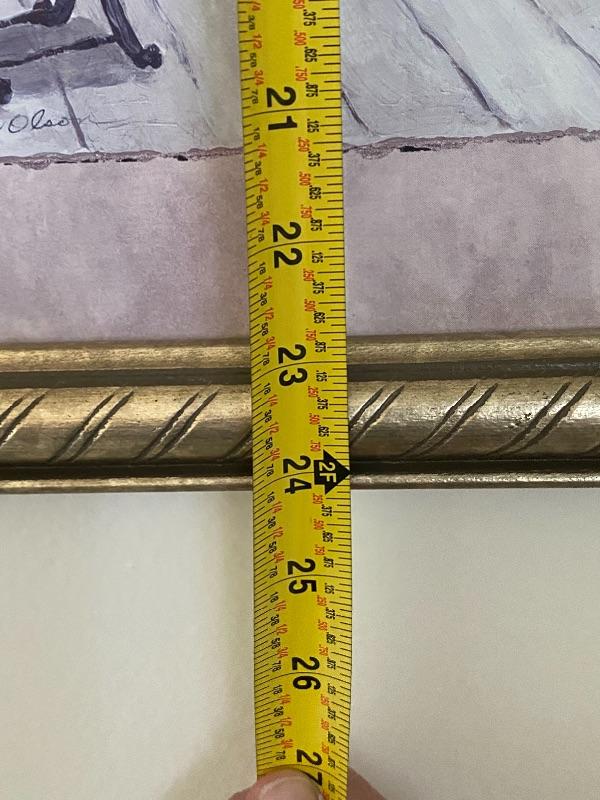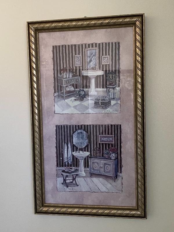 Framed bathroom wall art. Has a purple tint to it. Measures about 24"x14"