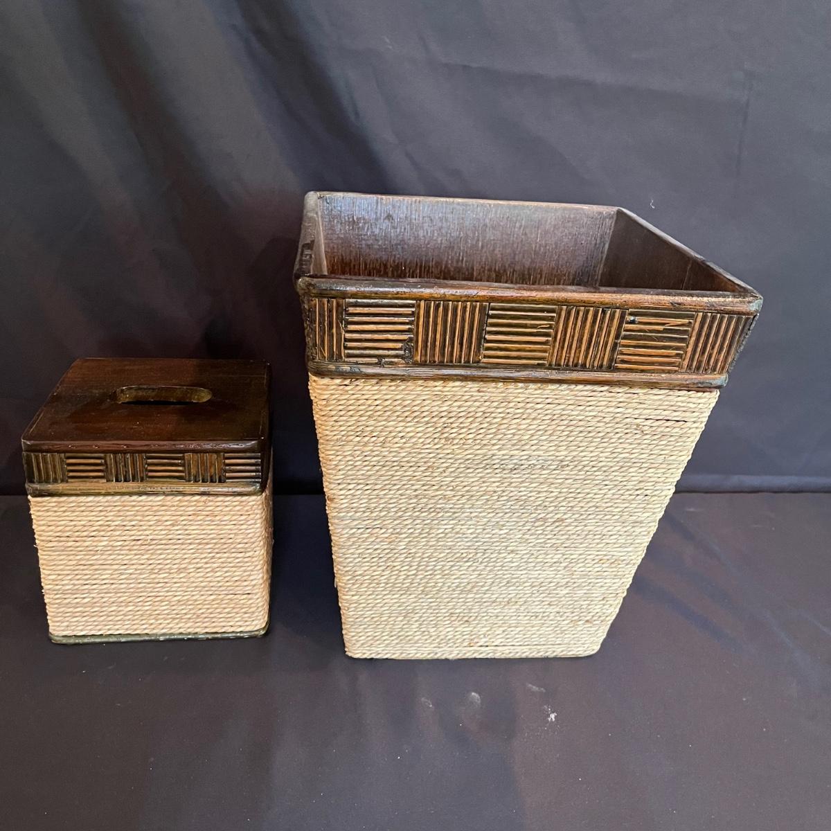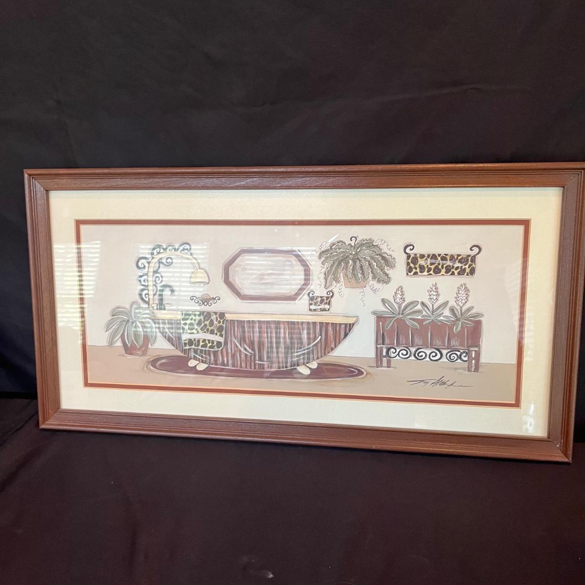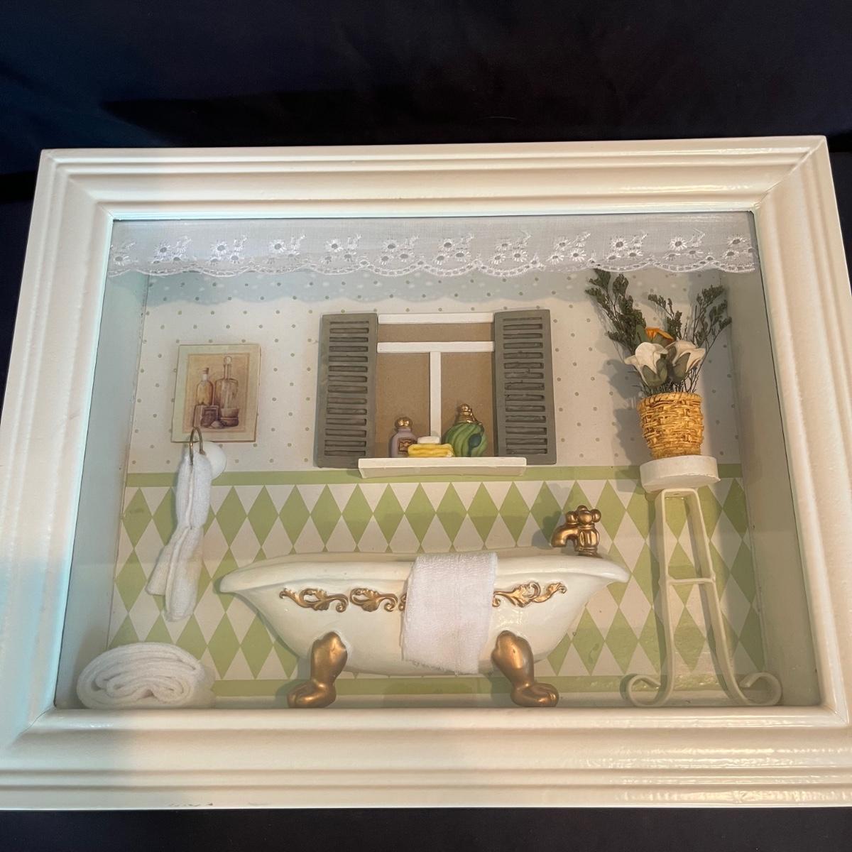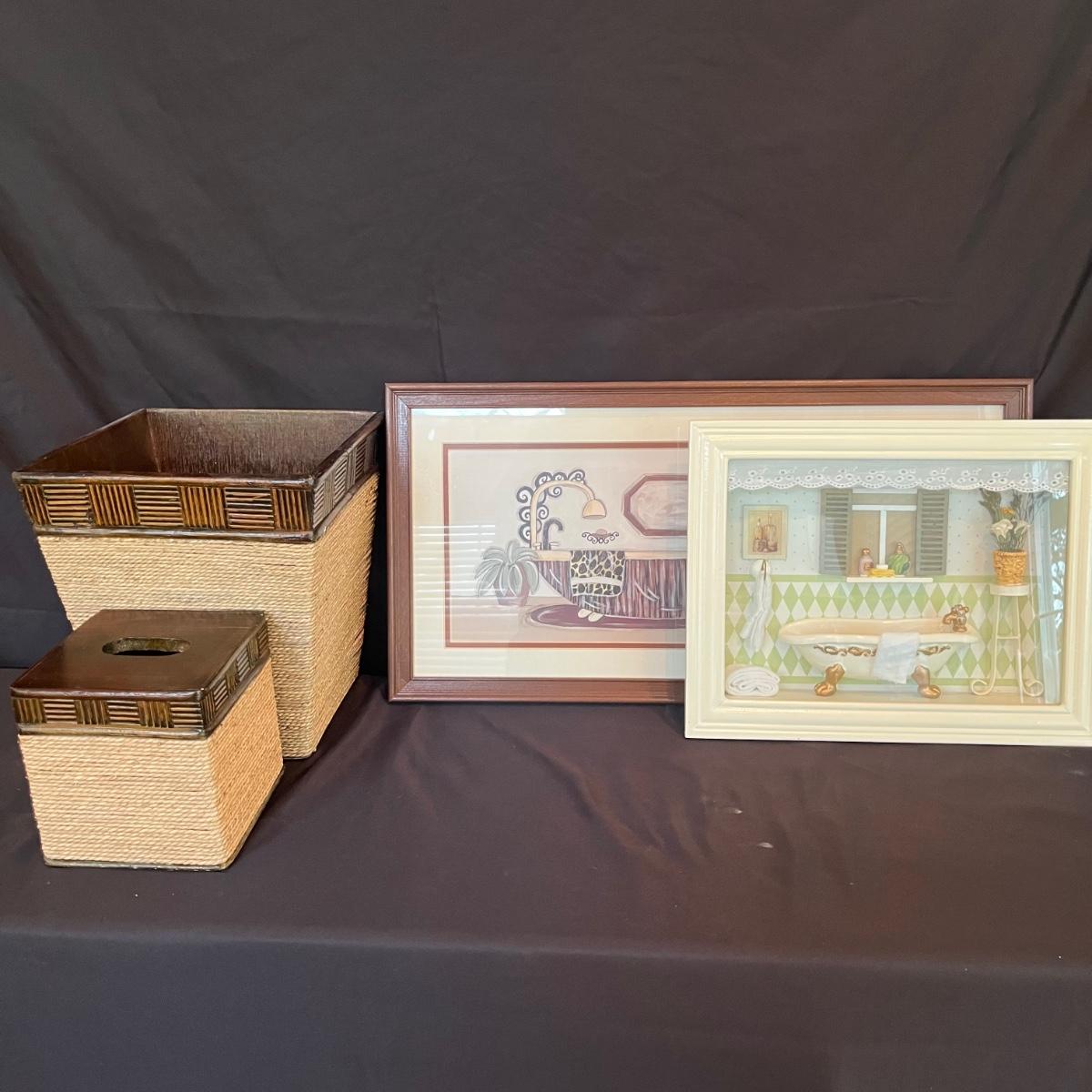 Lot includes 3D bathtub Art, ine piece is in a plastic frame amd thenother is wood, with signed and matted art. Lot also features matching wooden tissue box cover and wastebasket with rope surrounding each piece. Largest frame measures 12” x 24”.