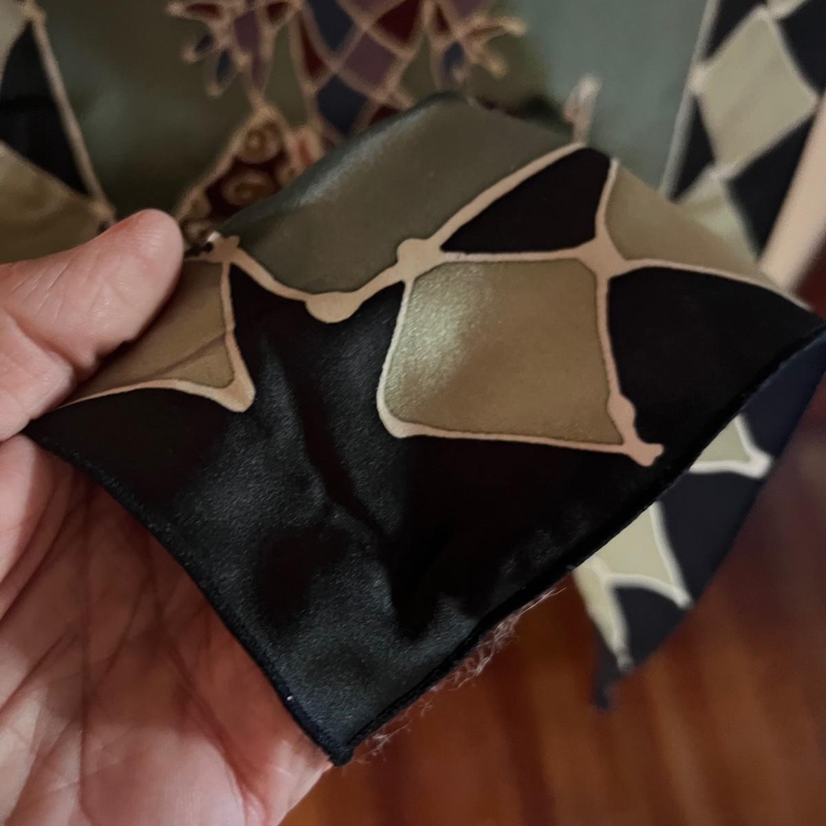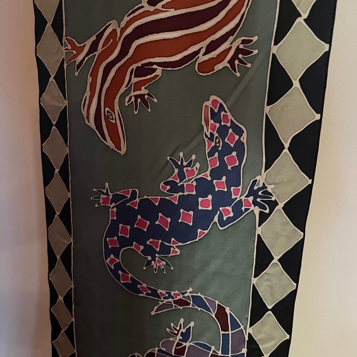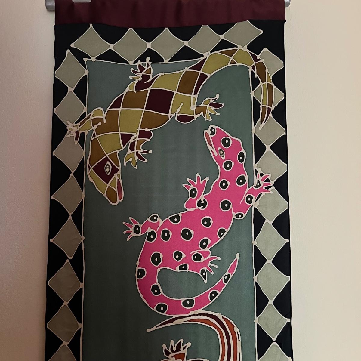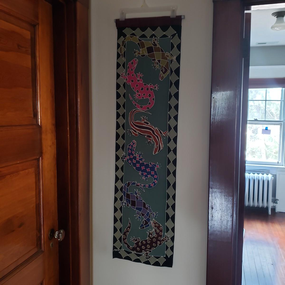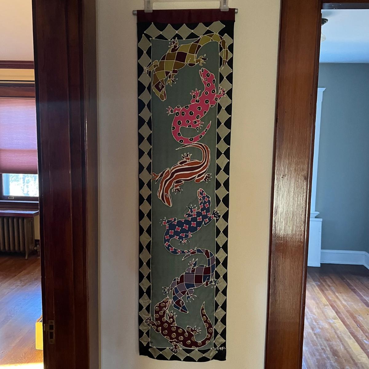 This pretty wall hanging appears to be Batik on silk. It has a light wooden rod but no hanging hardware. The reverse side is pictured as well, its just in reverse.