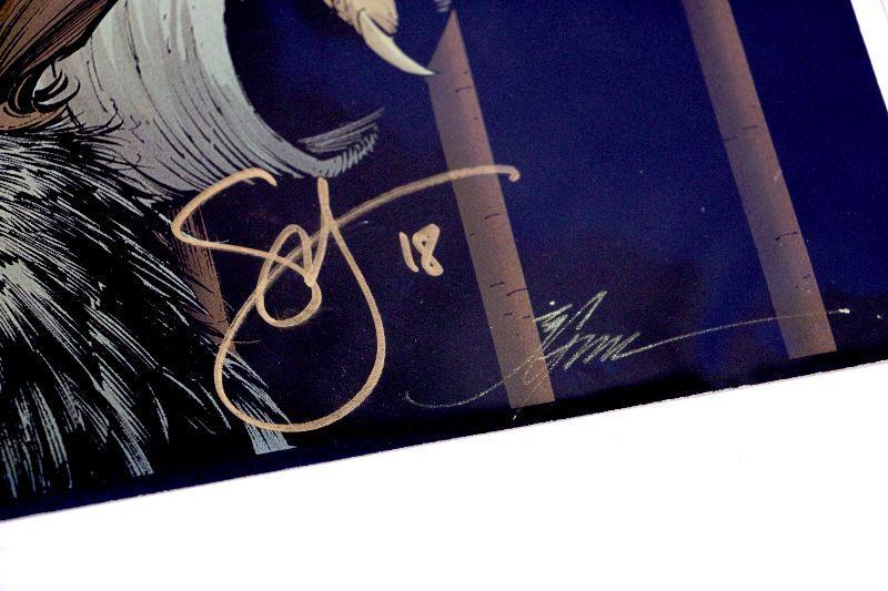 Rare original comic art print hand signed by 3 artists: Greg Capullo, Scott Snyder and Jonathan Glapion, there two minor nicks at the top left side, otherwise near excellent condition, 11" x 17" - Very Rare Art Print with 3 signatures - Collector's item!