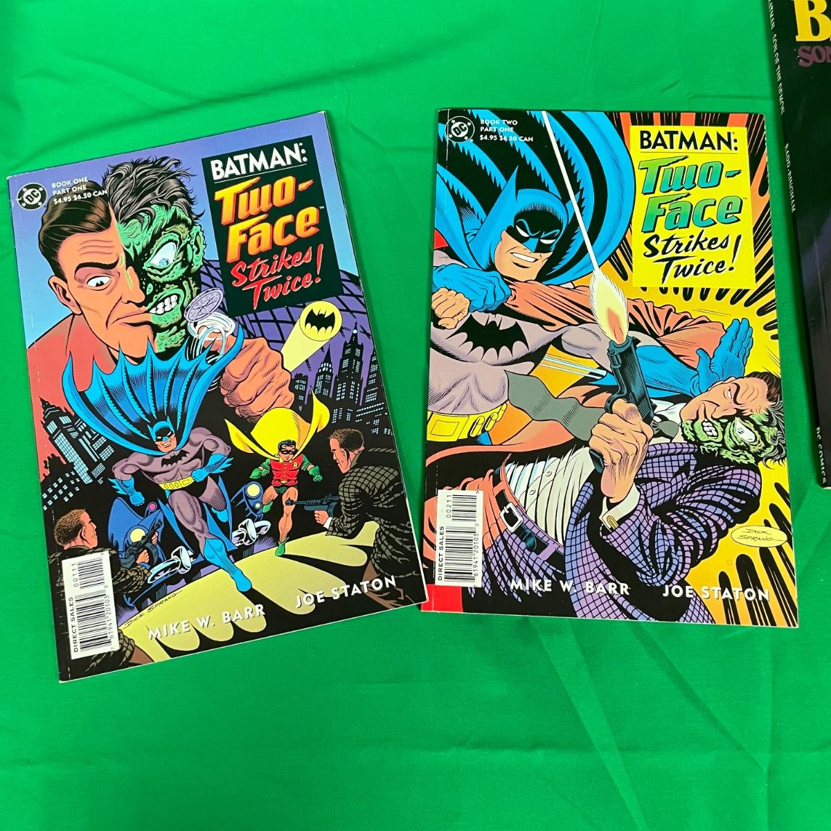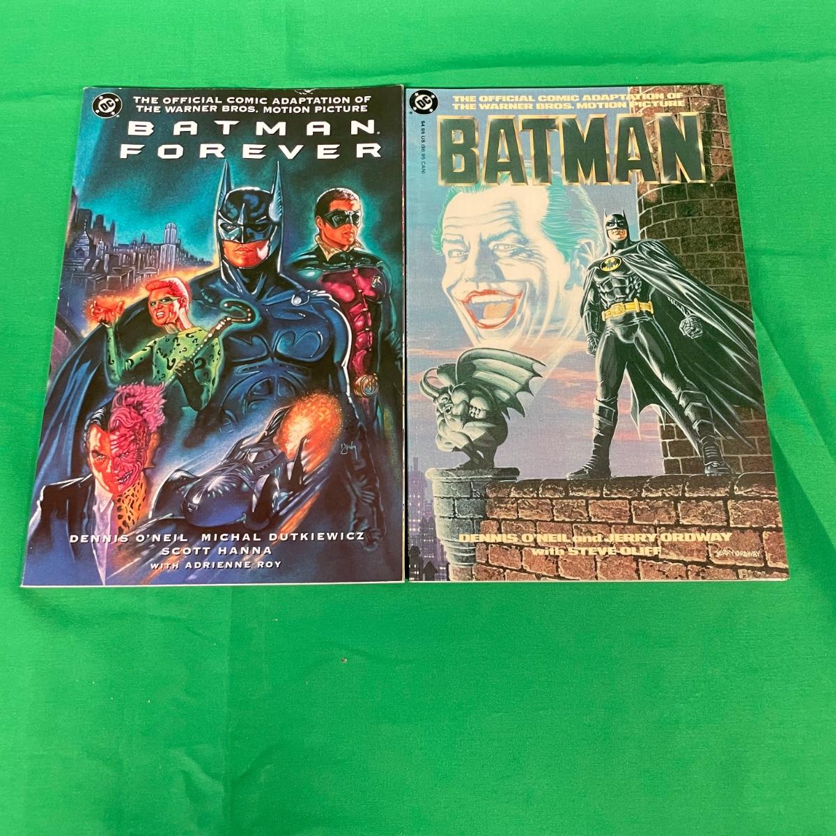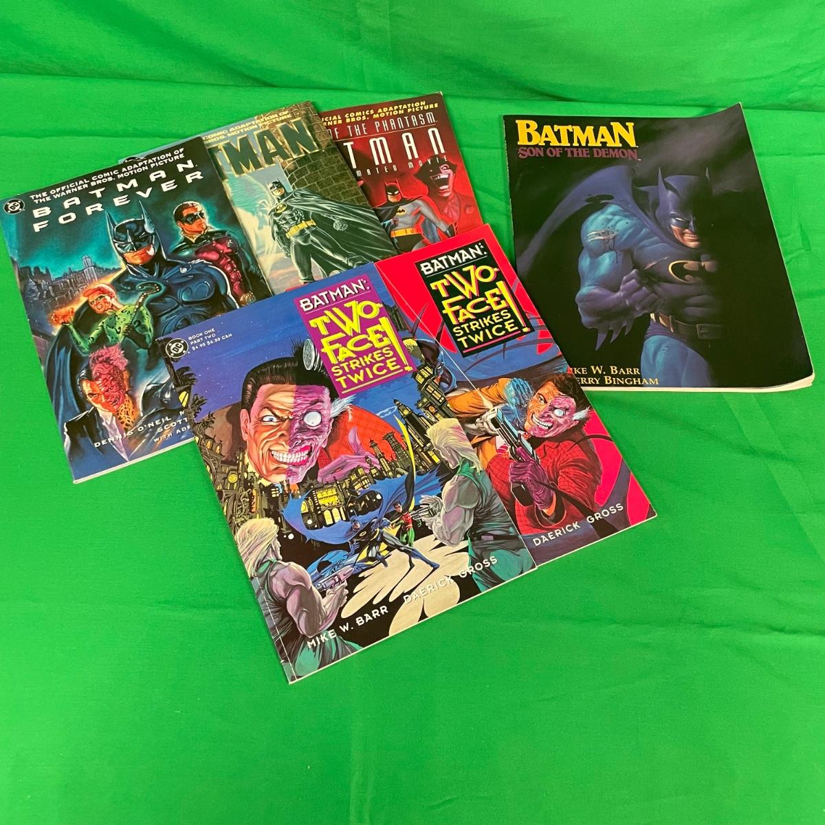 Three official comic adaptations for Batman, Batman Forever and Batman The Animated Movie. Lot also includes graphic novels Batman Son of the Demon and books one and two of Two Face Strikes Twice. See images. Items are sold as-is. No returns or refunds. Please bid accordingly.