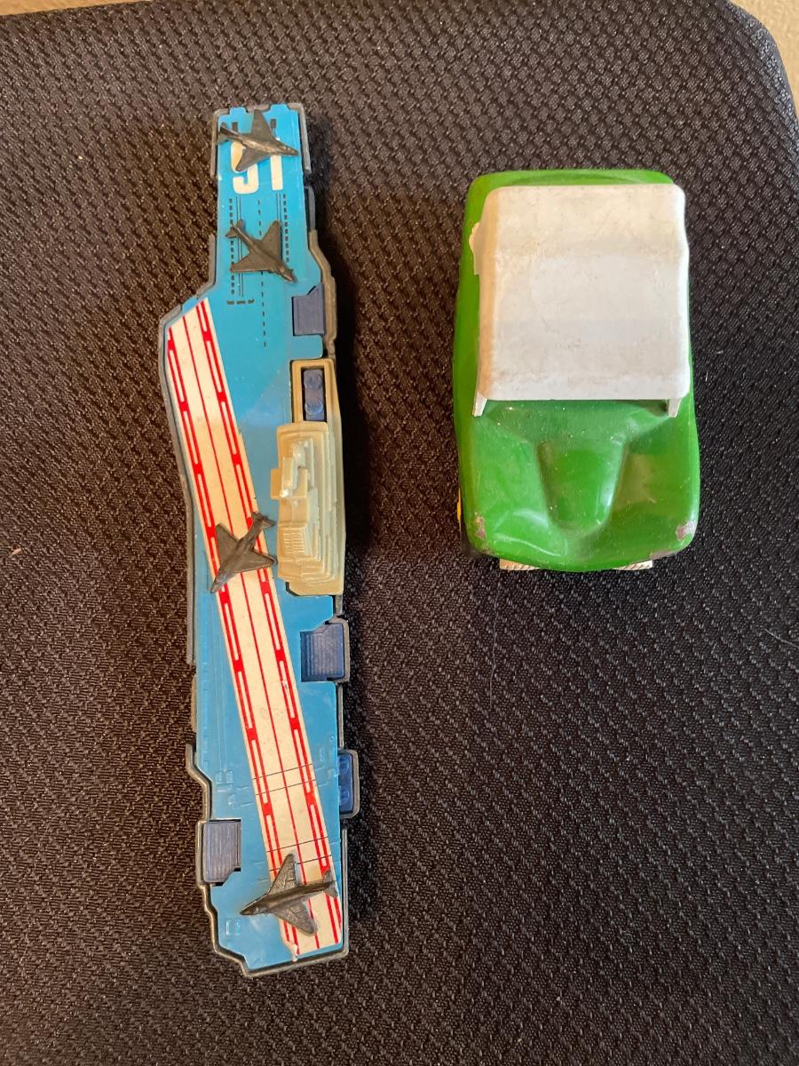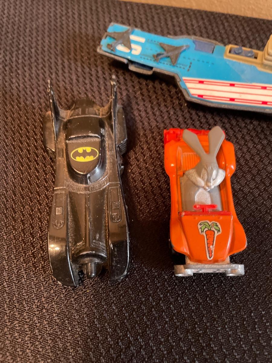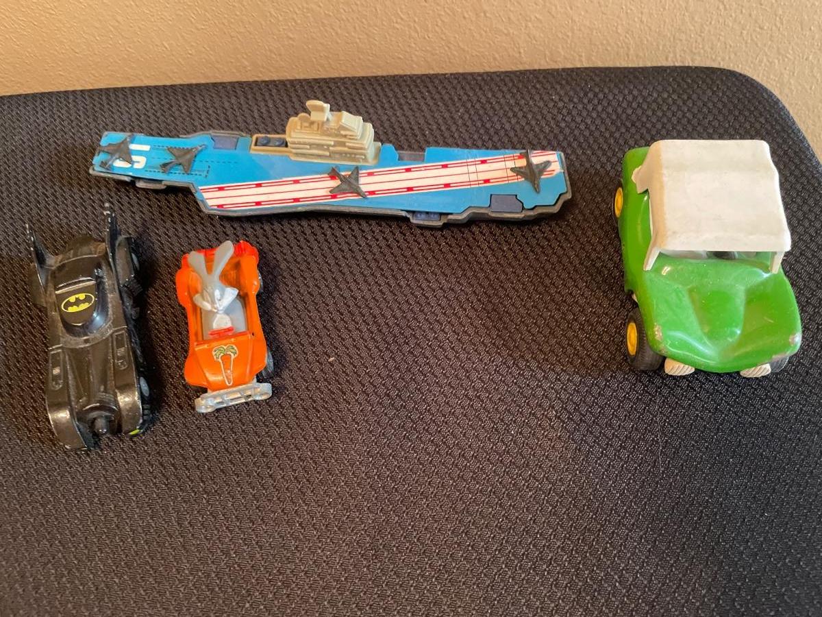 Batmobile, bugs, bunny, Tonka, green car and navy ship
