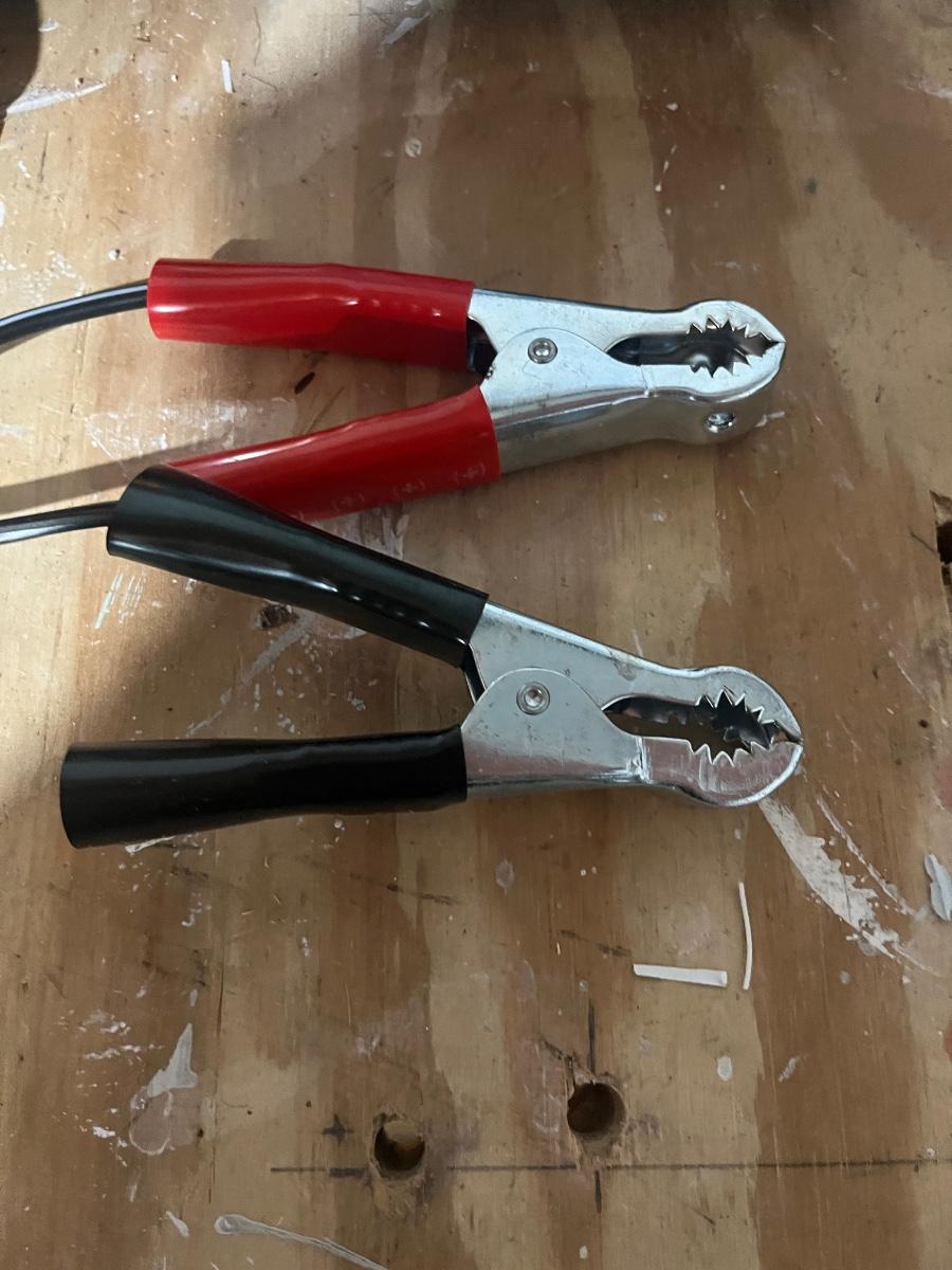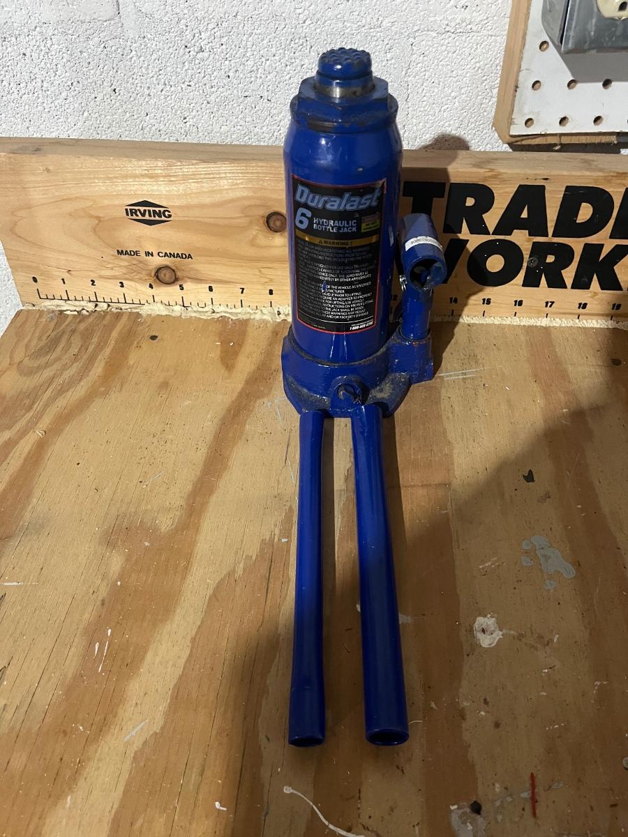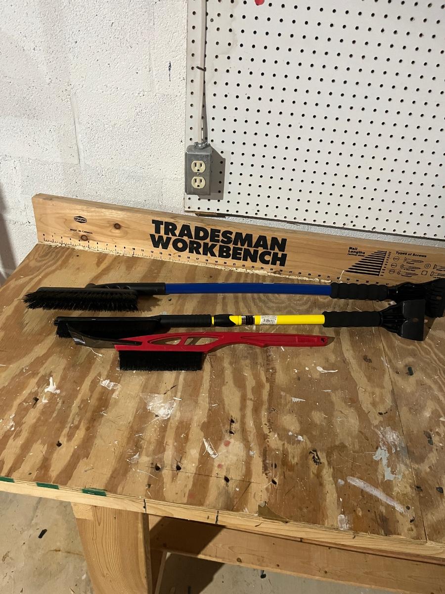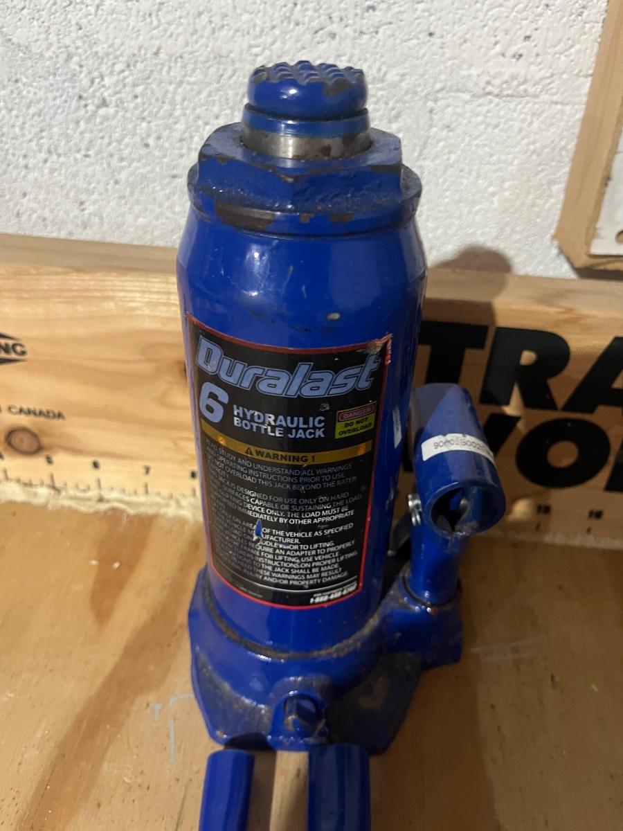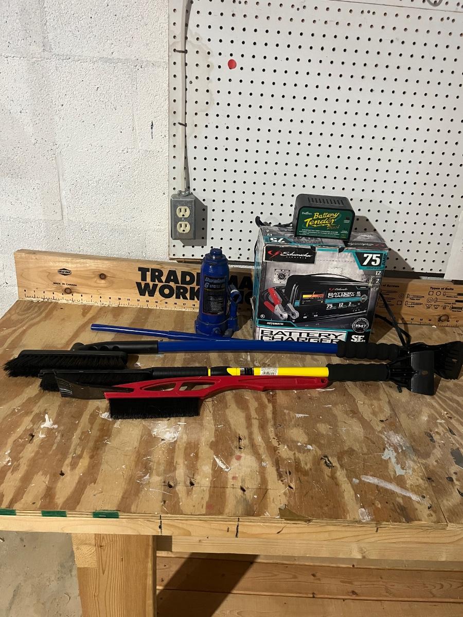 Lot includes a battery charger, battery tender, six ton bottle jack and three ice scrapers. Both battery chargers powered on when plugged in.