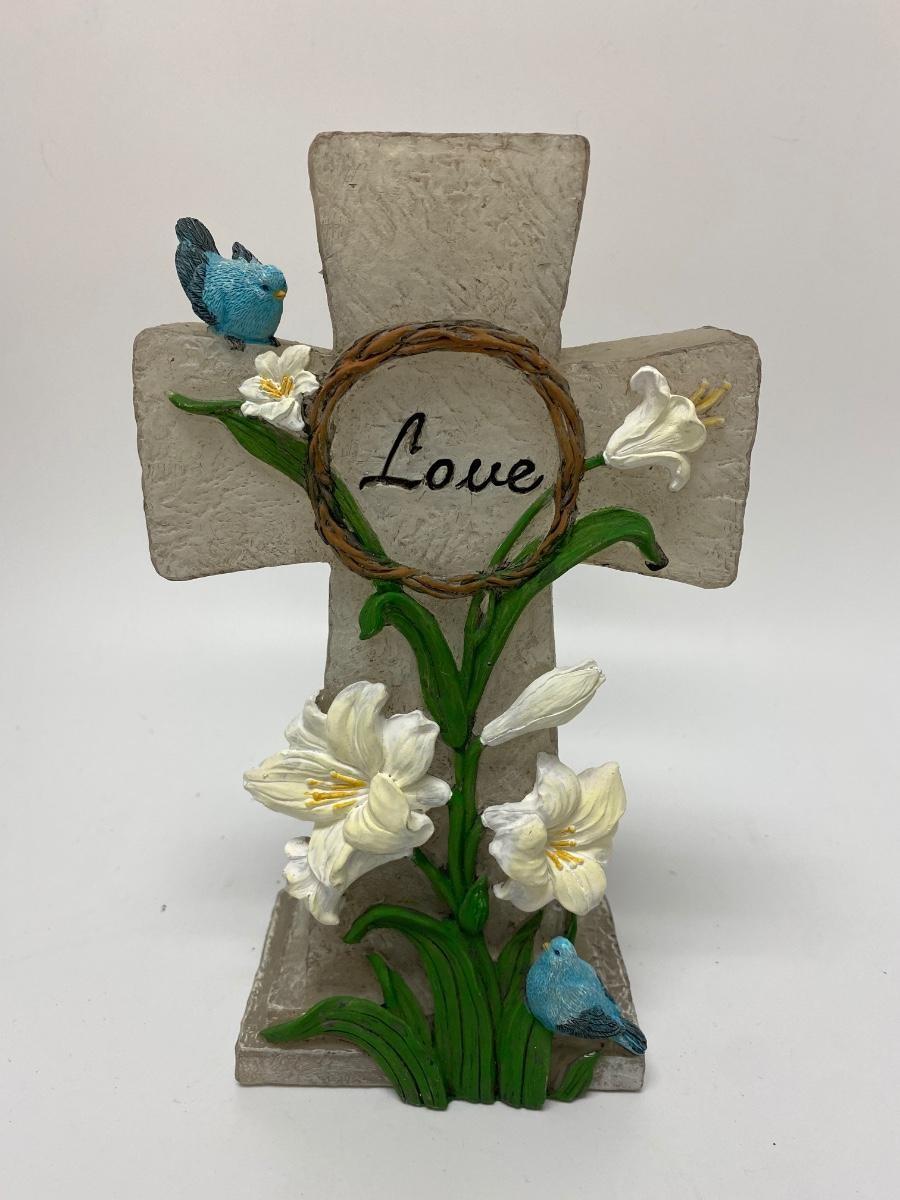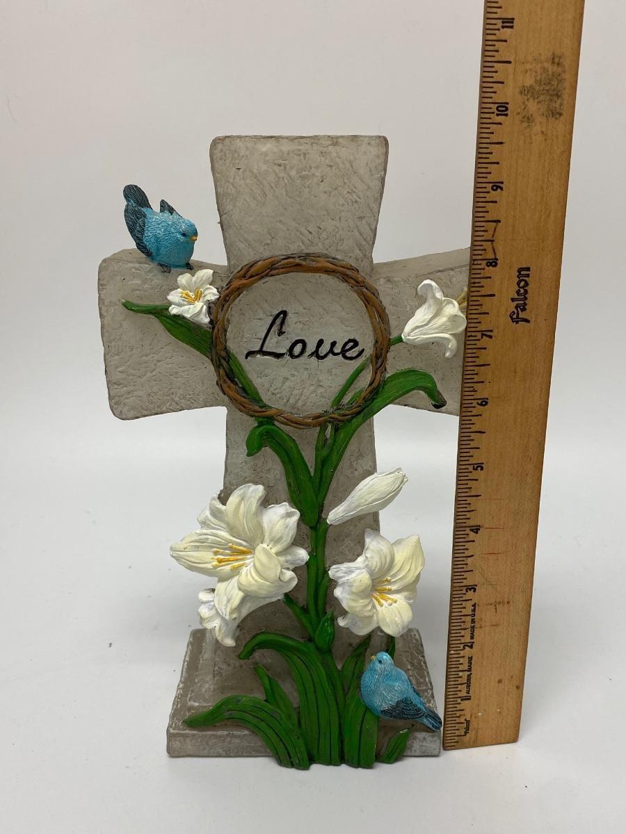 Battery operated light up Easter theme cross. Love across the front with lily flowers. Works. In good condition. Great in the yard or home. About 10" tall.