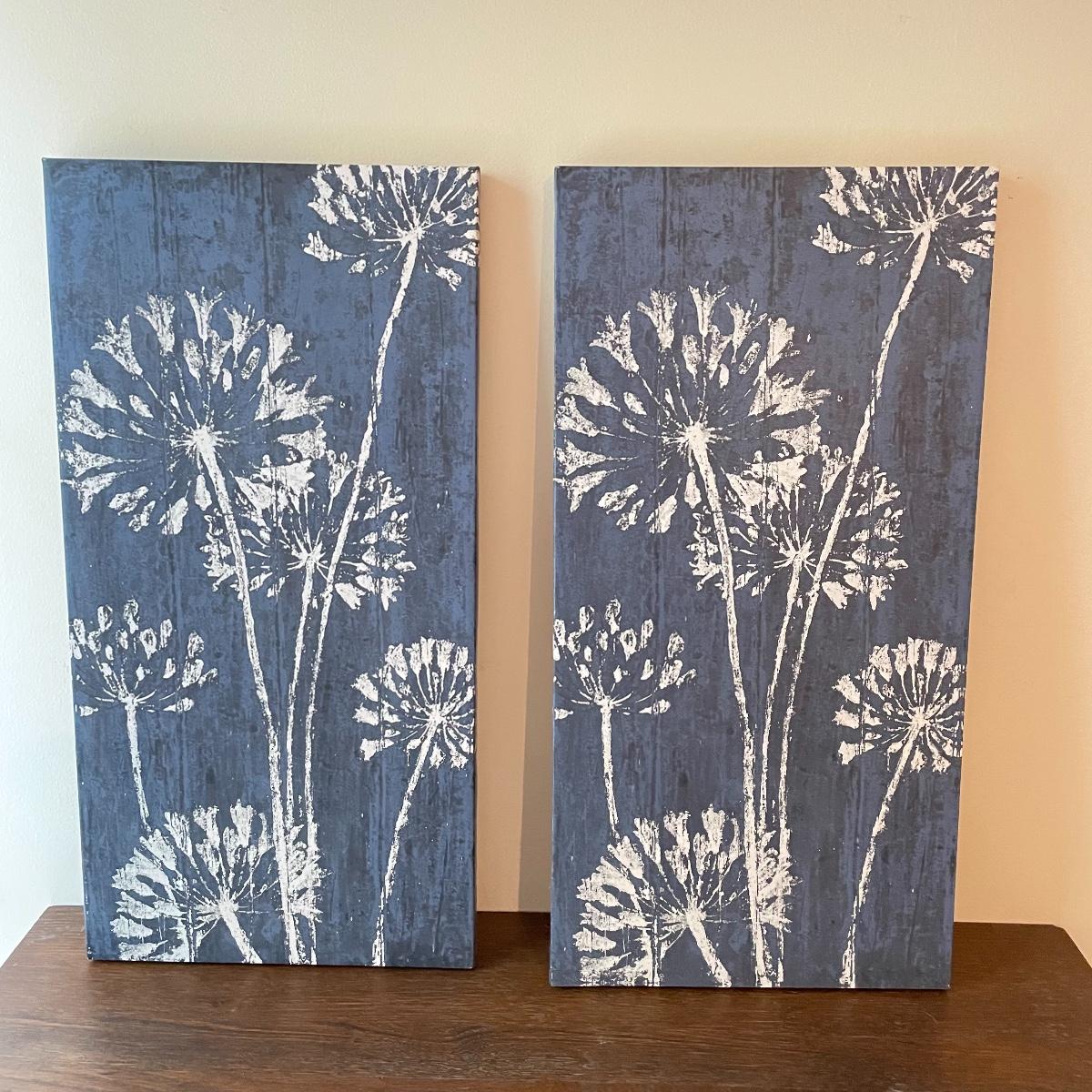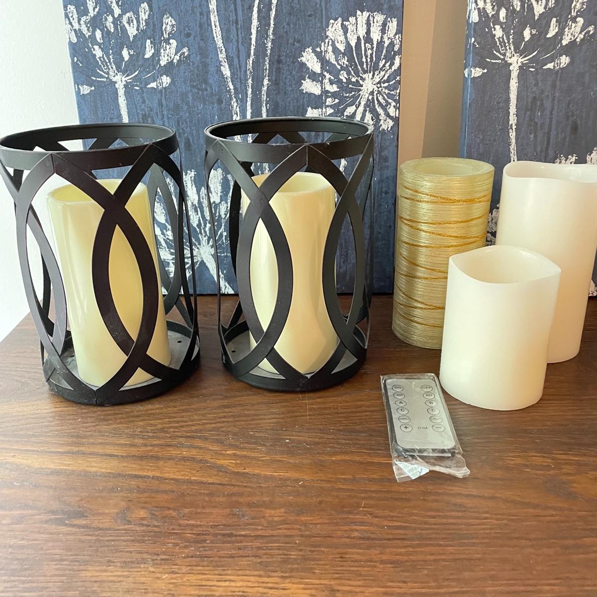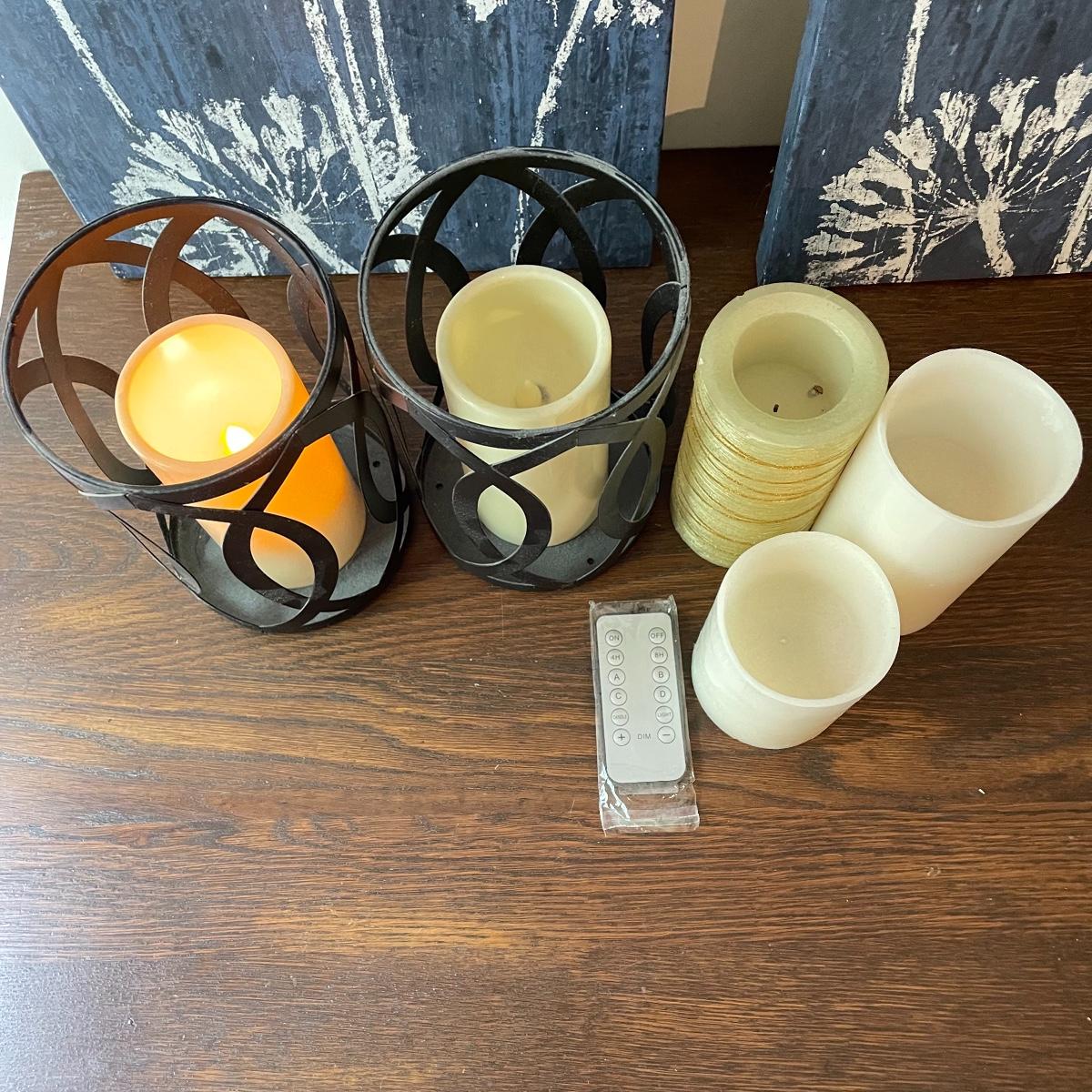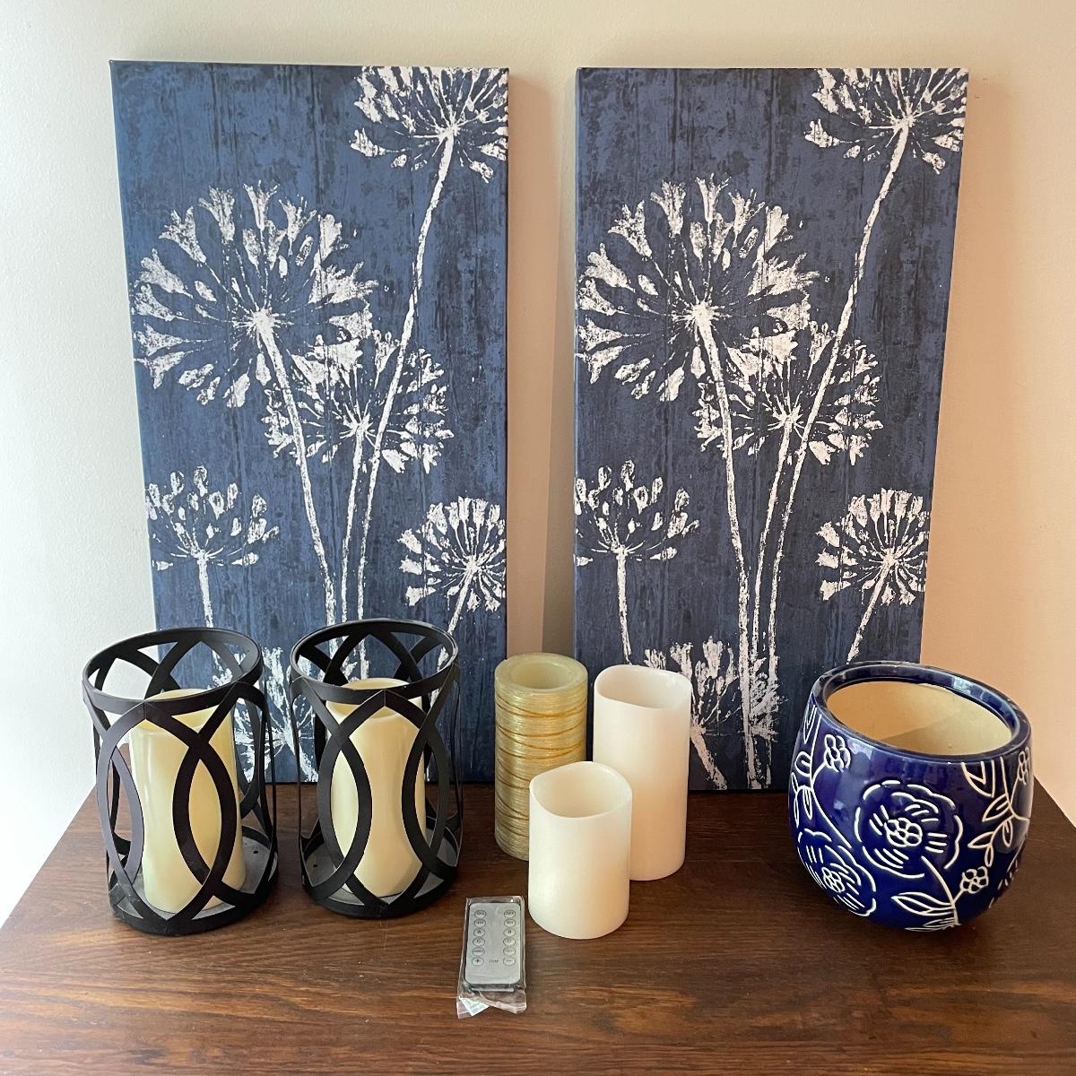 Lot features deep blue ceramic planter with white floral glaze measuring 6.5”d x 6.5”. Two 24” x 12” canvas floral prints stretched over wood frames. Candles attached to metal frames are 7.5” tall. Only one candle works, the others plus remote probably need new batteries. Local pick up only.