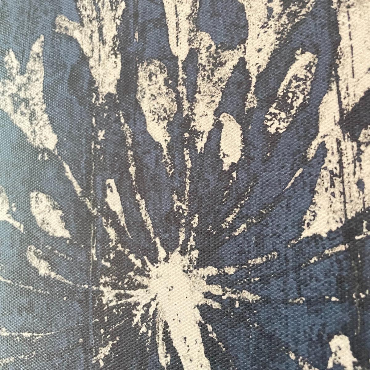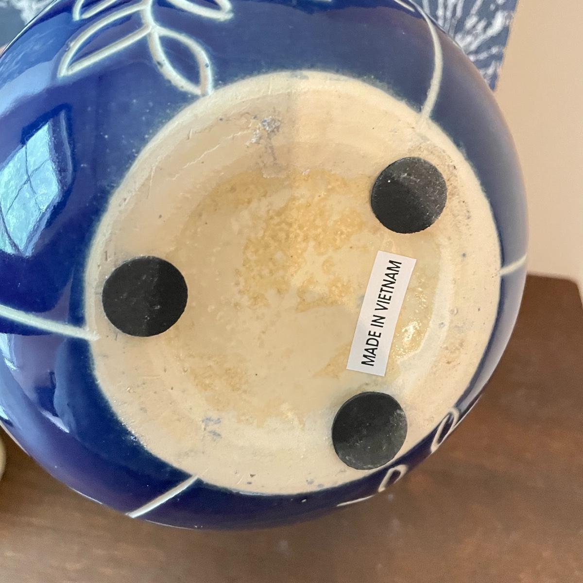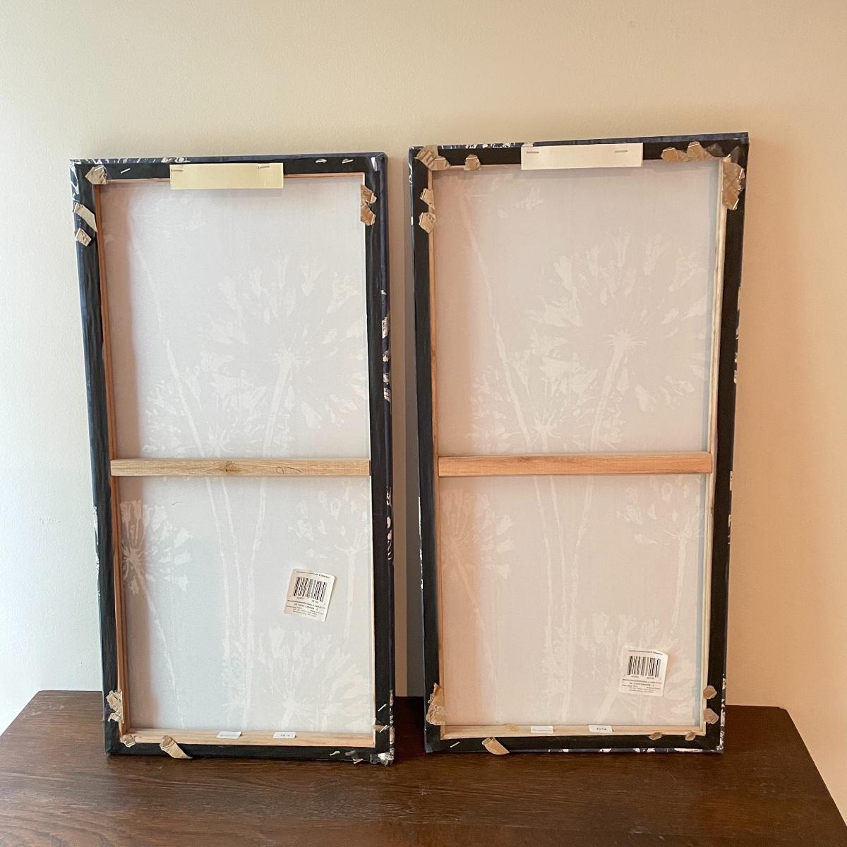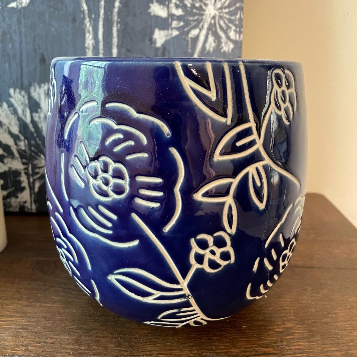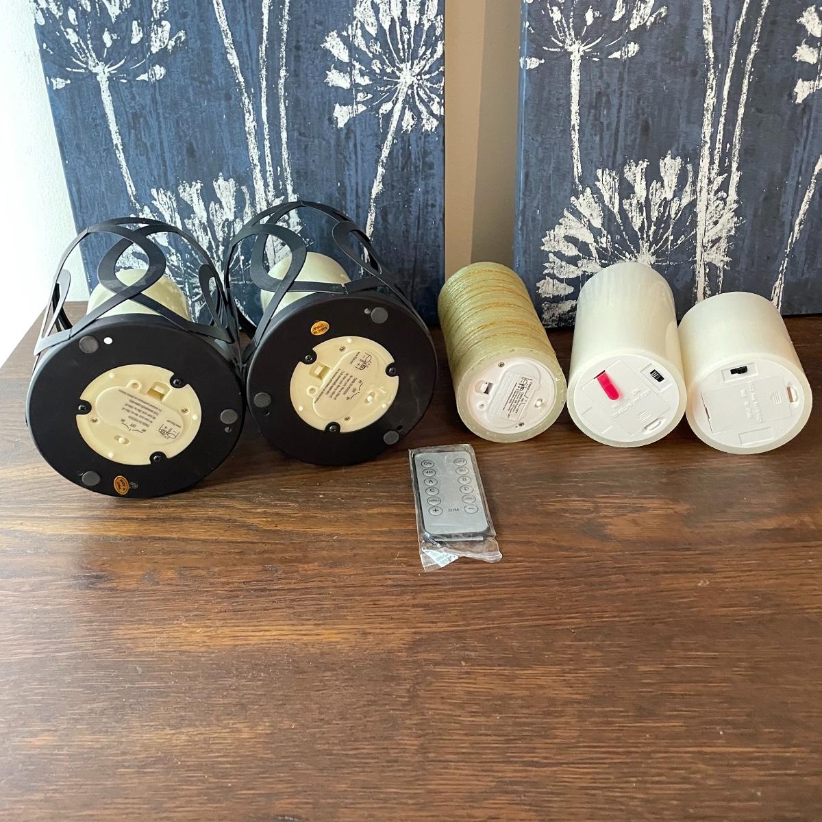 Lot features deep blue ceramic planter with white floral glaze measuring 6.5”d x 6.5”. Two 24” x 12” canvas floral prints stretched over wood frames. Candles attached to metal frames are 7.5” tall. Only one candle works, the others plus remote probably need new batteries. Local pick up only.
