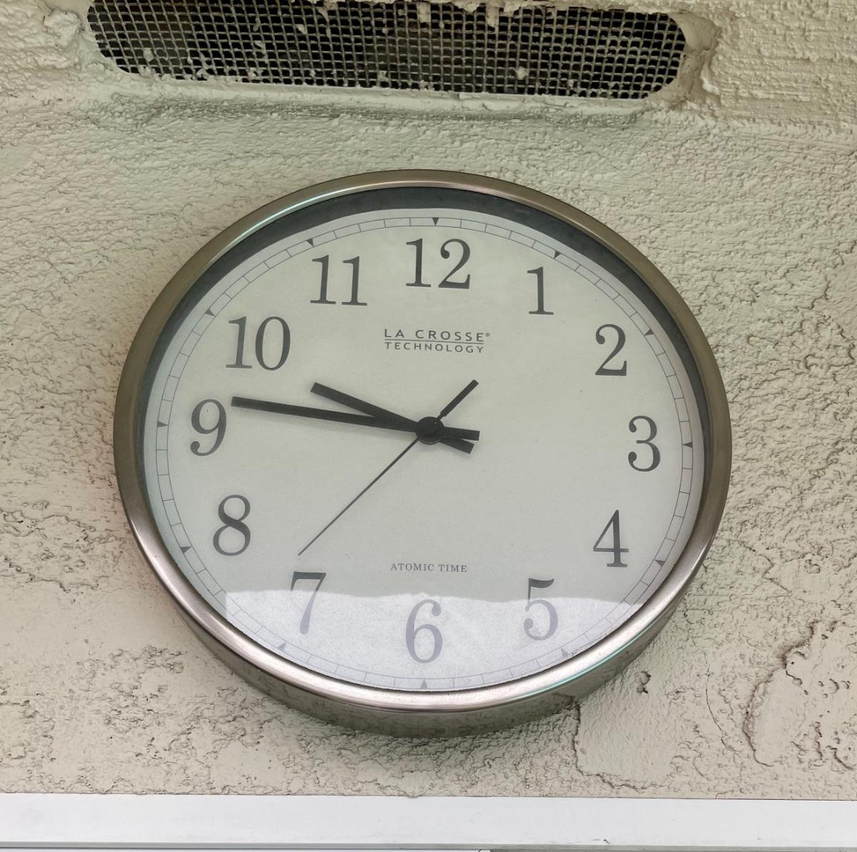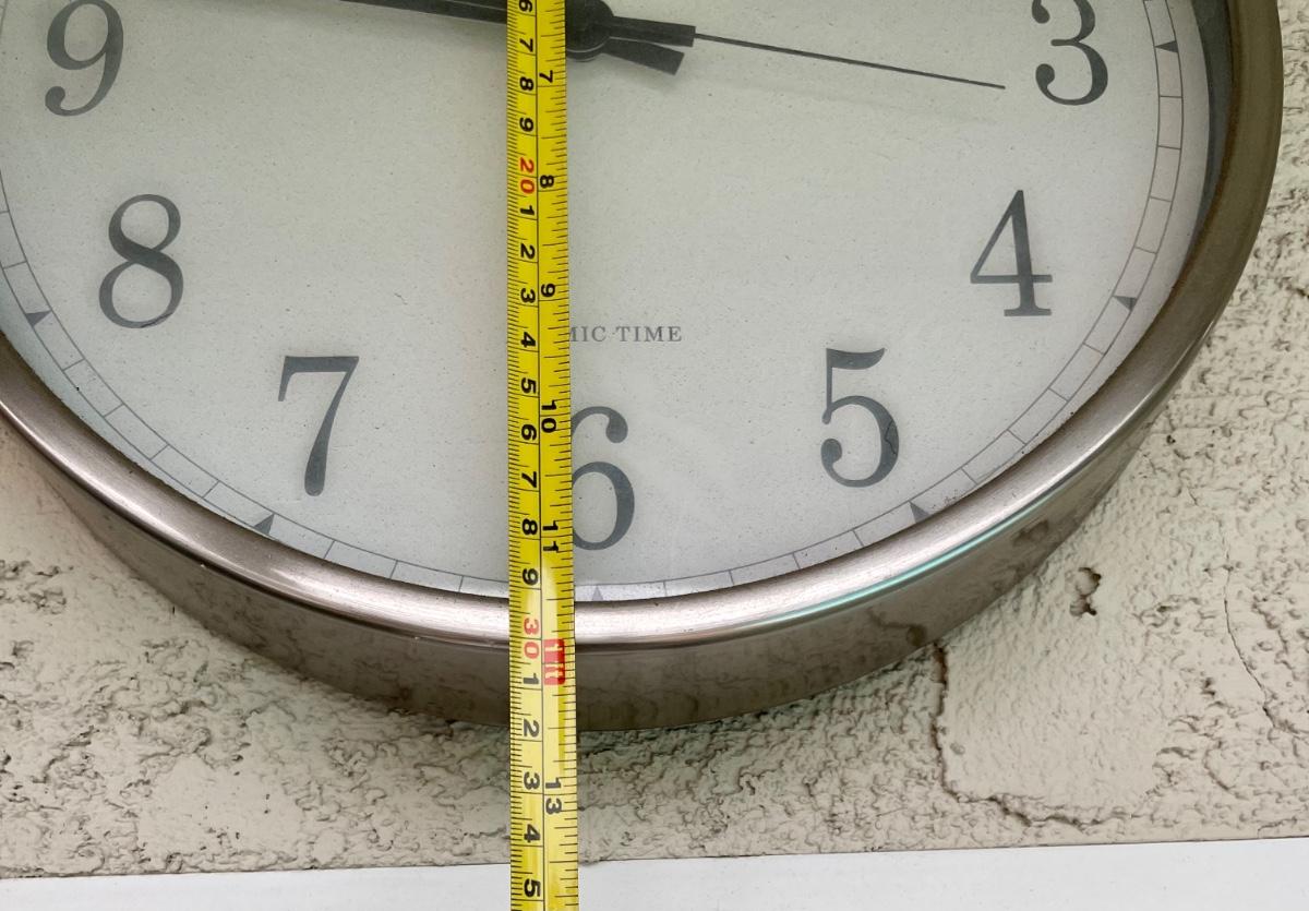 Battery Powered Indoor Outdoor Clock. Traditional round dial with numbers and a sweep second hand. Measures approx 12” across.