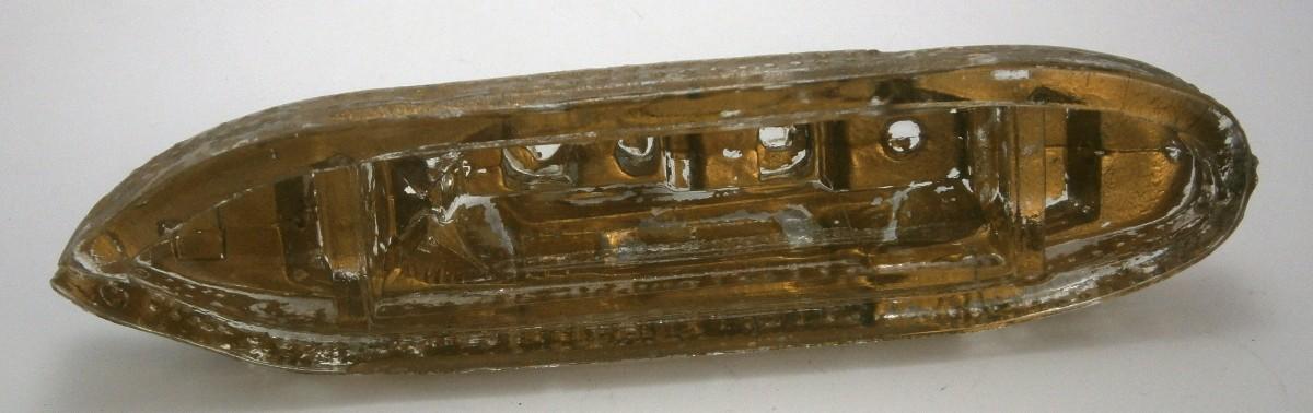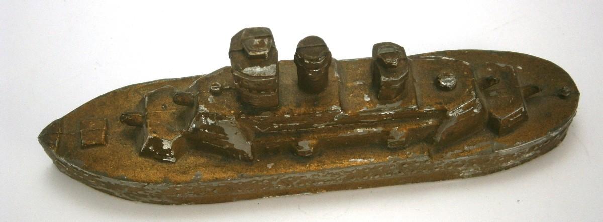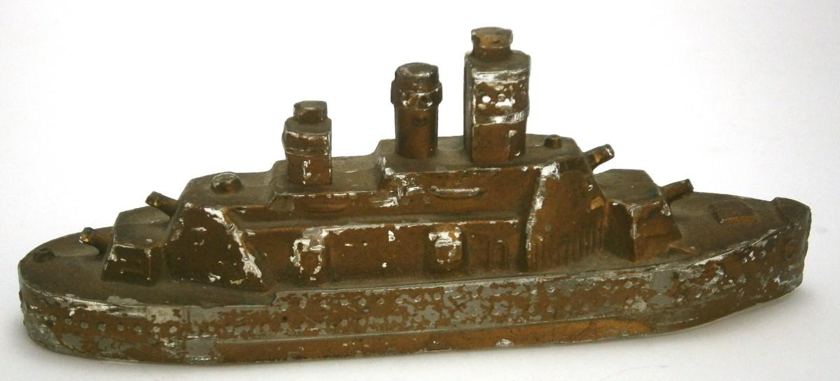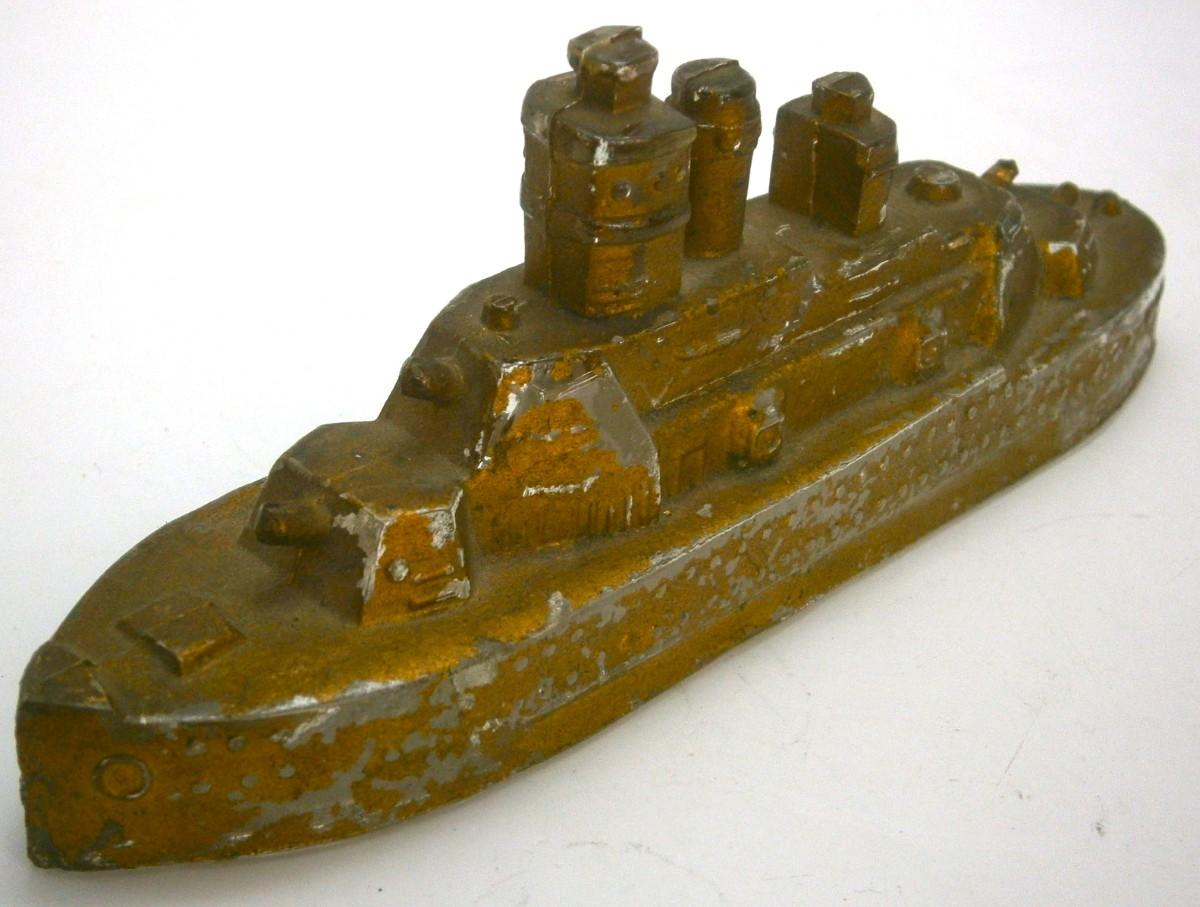 Battleship Candy Container from the 1930's-40's, 5 1/2 in. long, painted pressed glass, original gold paint, very rarely see with this much paint, missing tin closure (bottom).