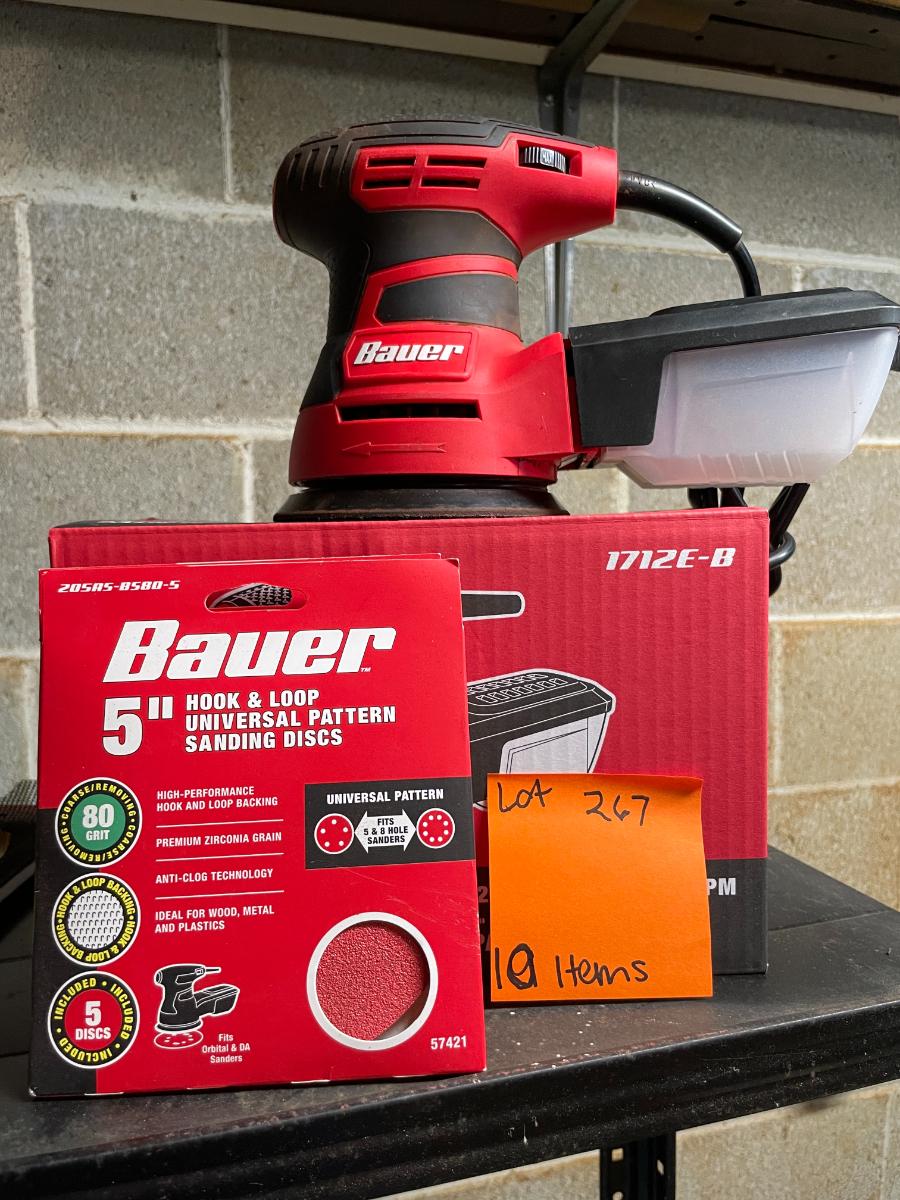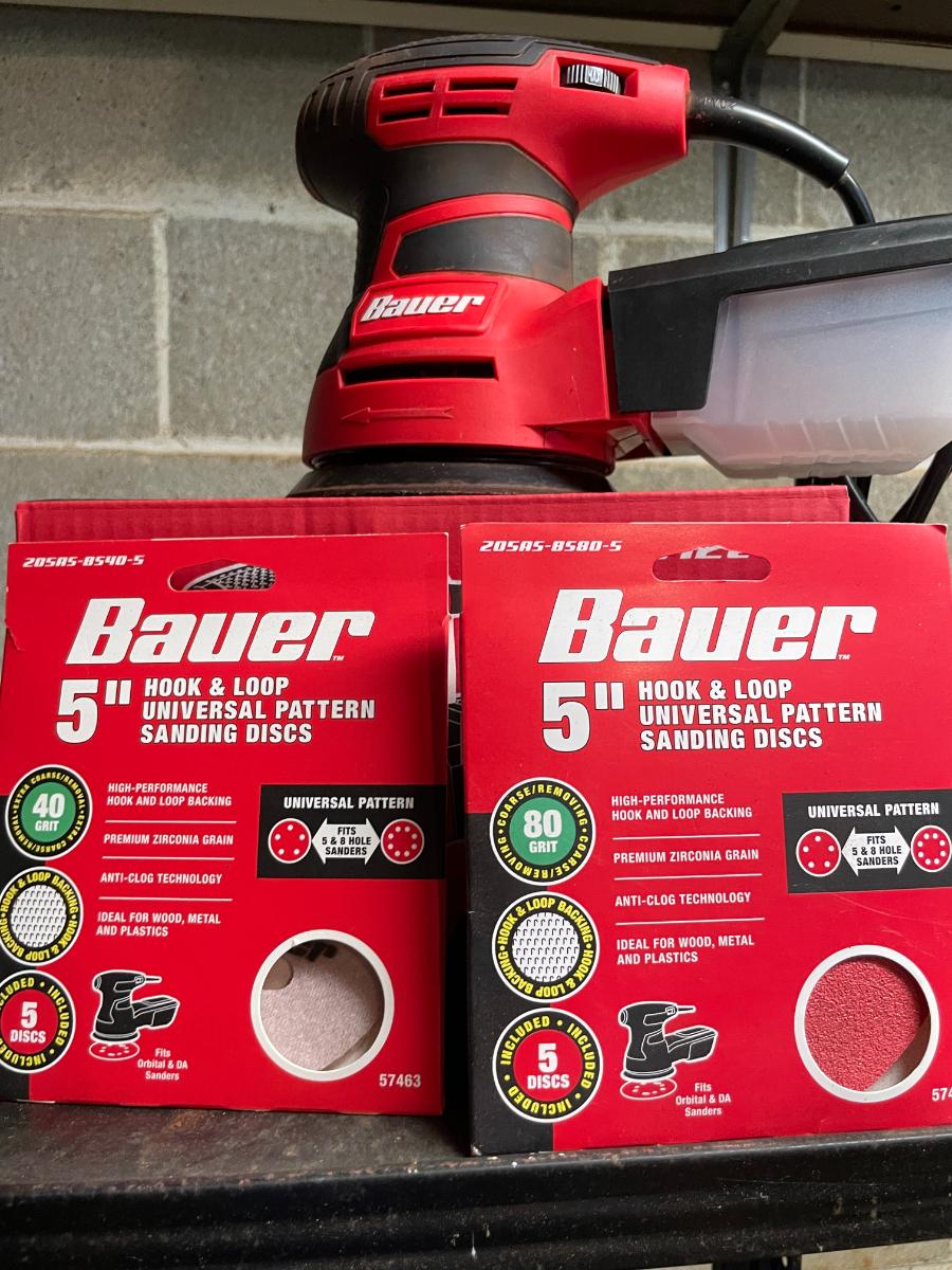 Bauer 5" Circular Palm Sander & Accessories includes sand discs & hand tool