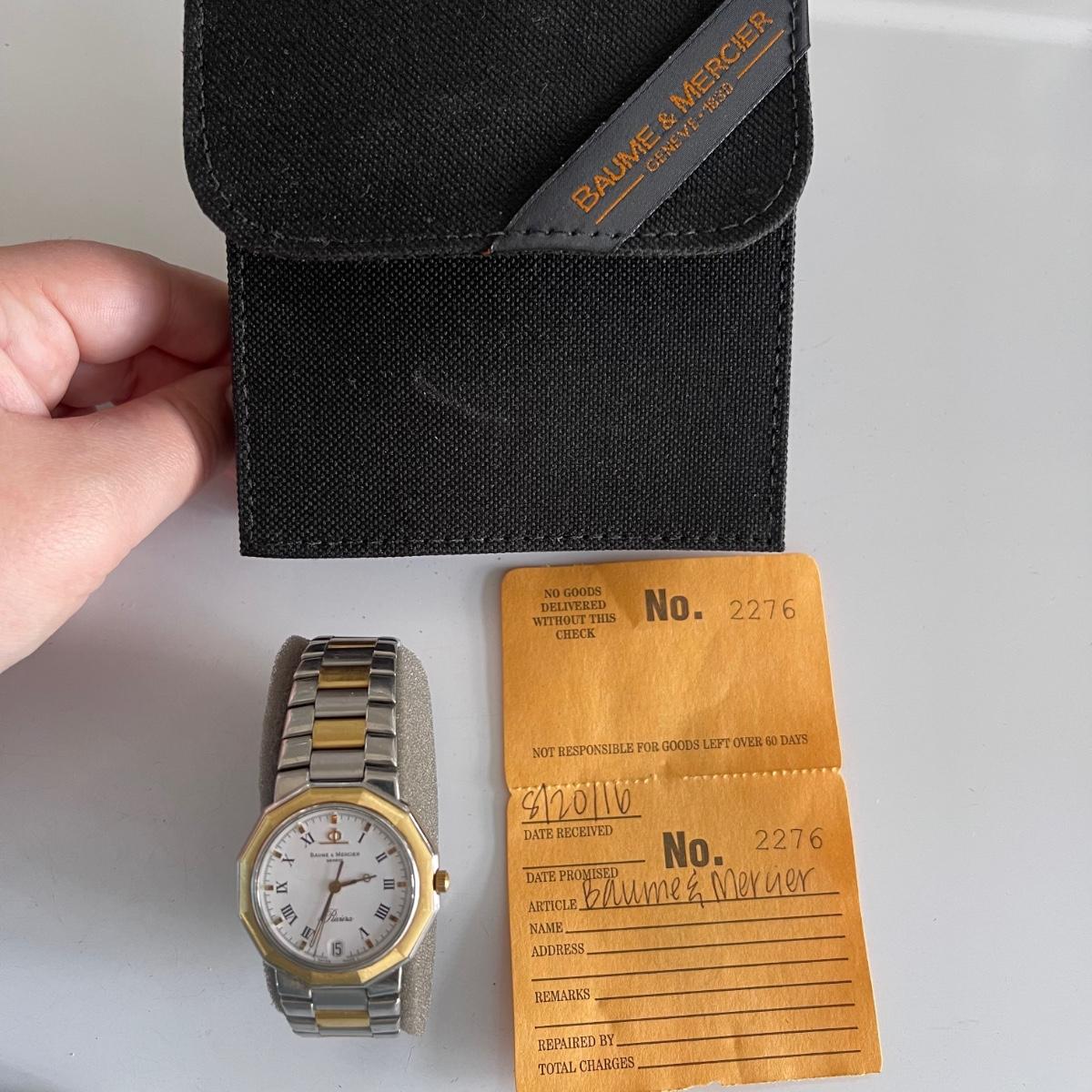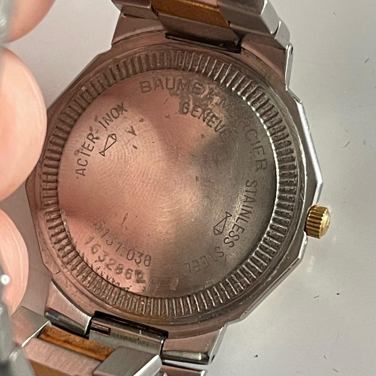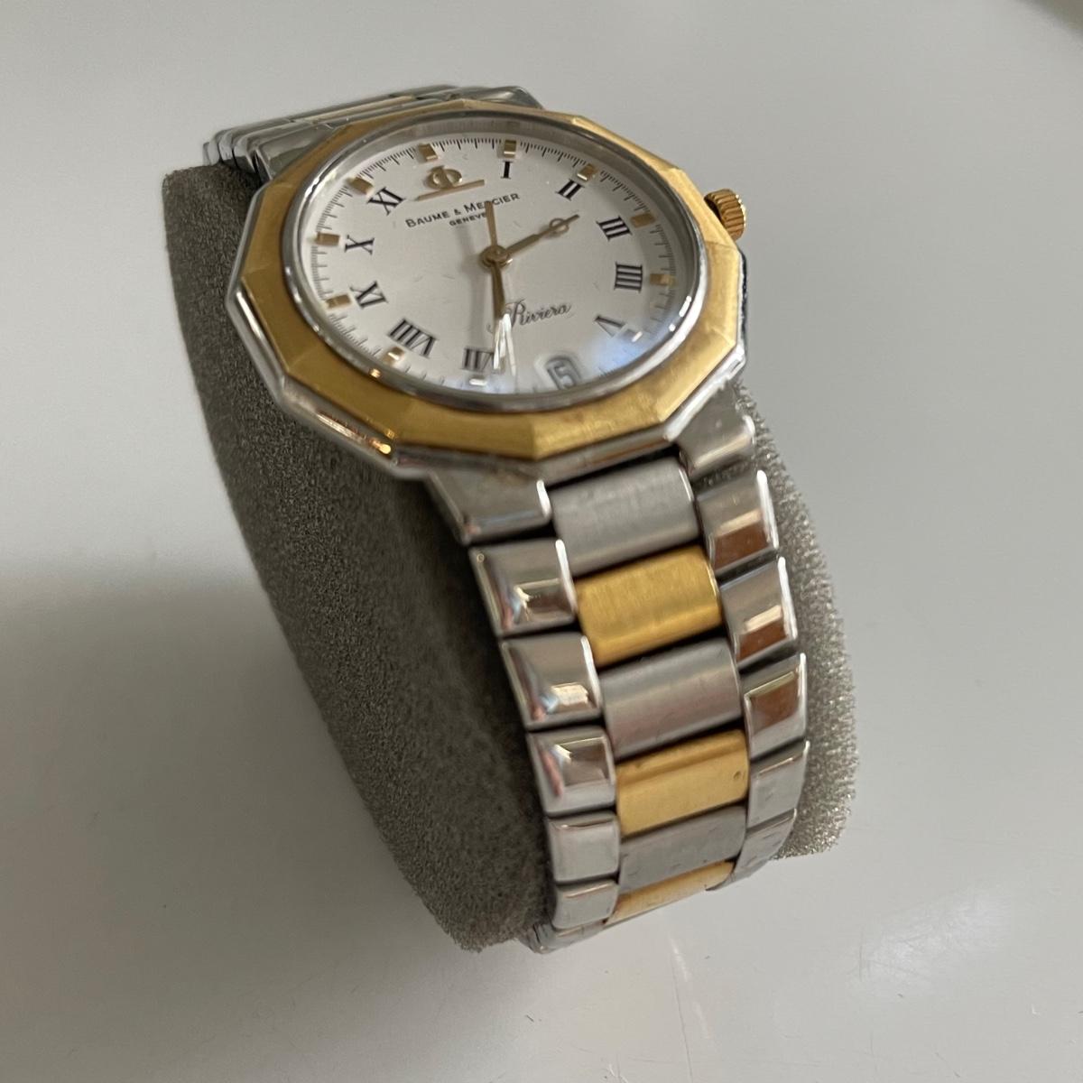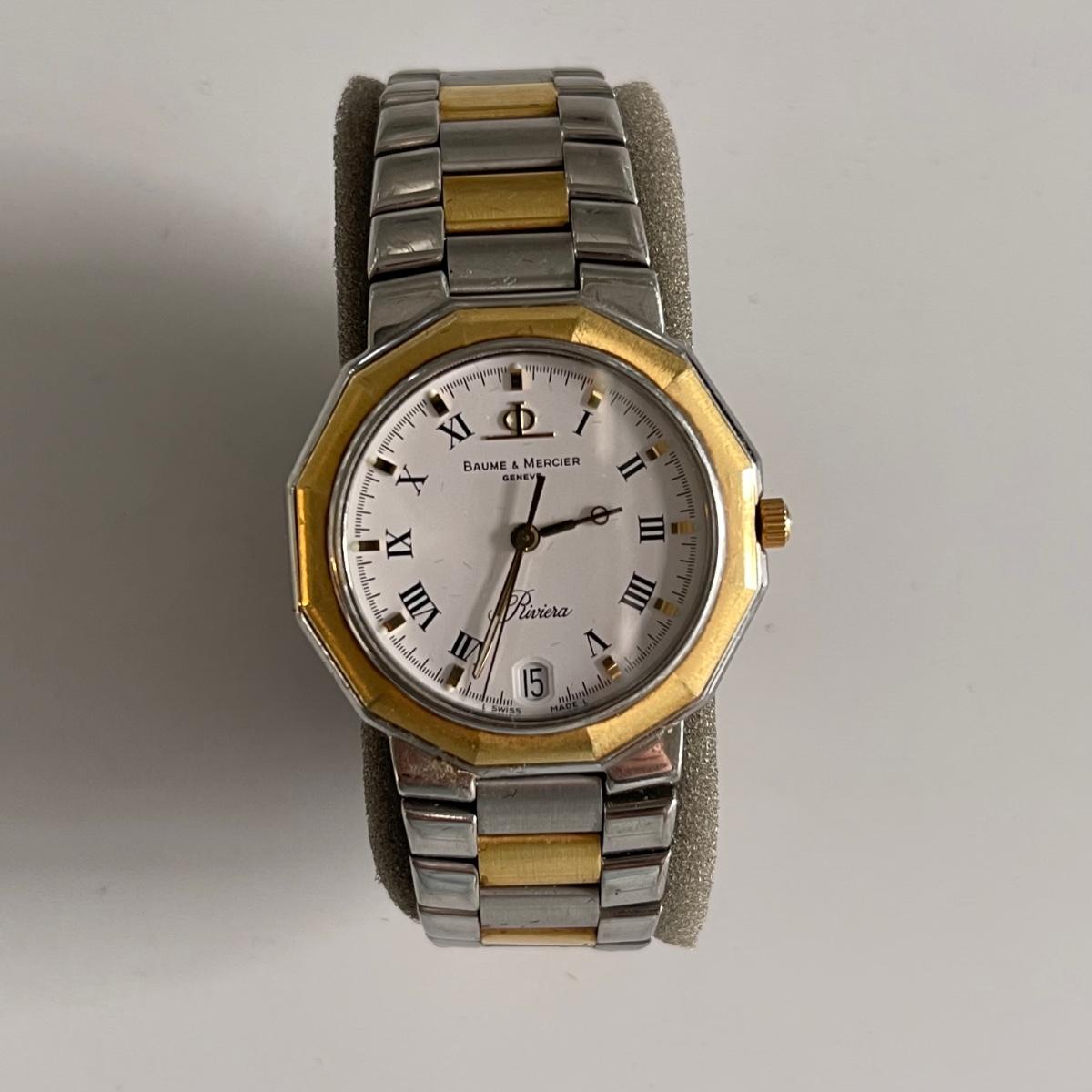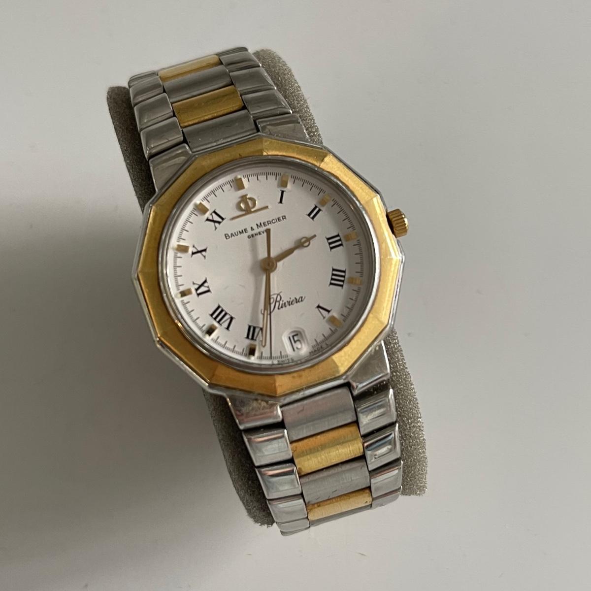 This women’s Baume & Mercier Riviera gold and silver colored watch comes with a case and a receipt. There are engravings on the back that say “Acier Inox,” “Stainless Steel,” “Baume & Mercier Geneve,” “5131.038,” and “16328609.” It is not currently ticking.