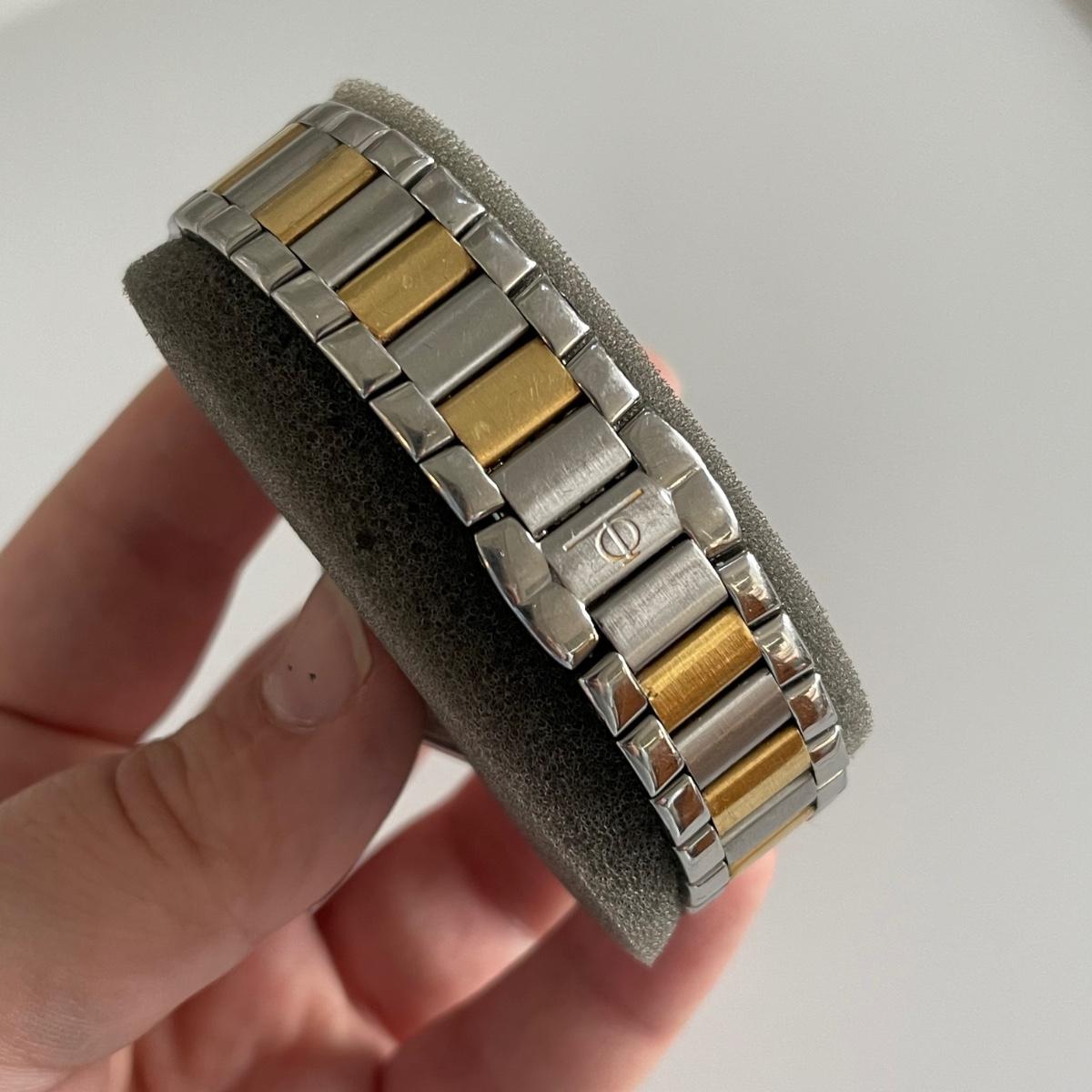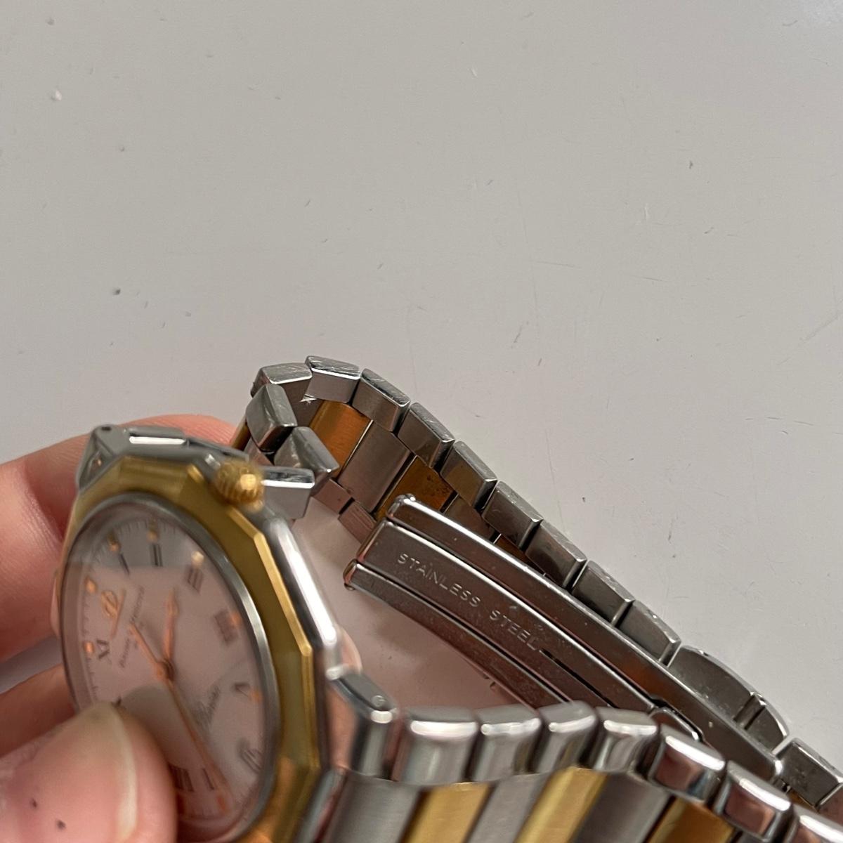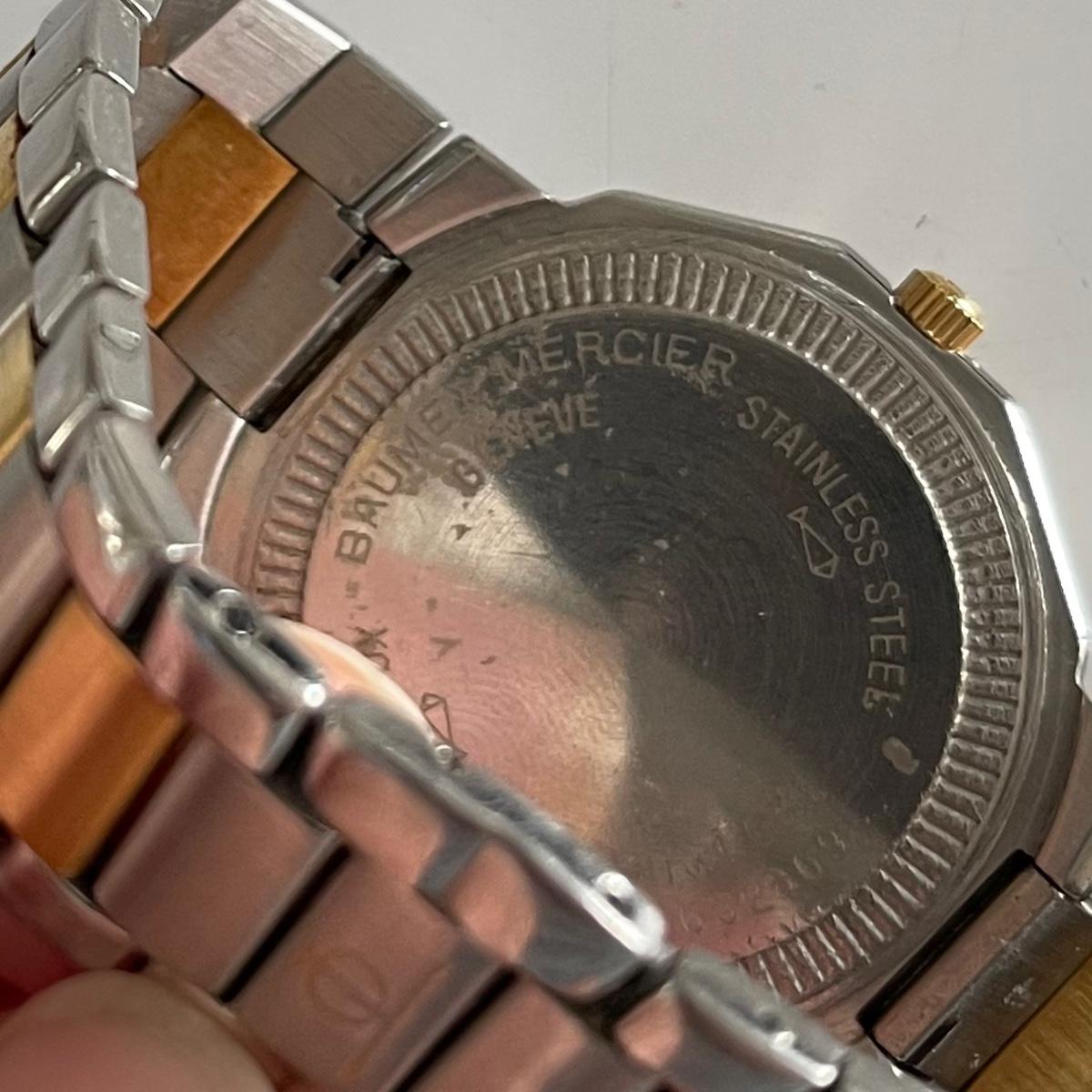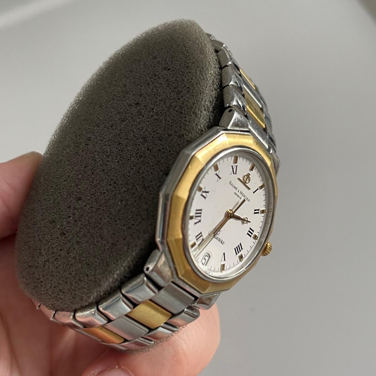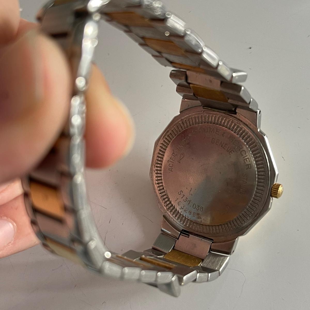 This women’s Baume & Mercier Riviera gold and silver colored watch comes with a case and a receipt. There are engravings on the back that say “Acier Inox,” “Stainless Steel,” “Baume & Mercier Geneve,” “5131.038,” and “16328609.” It is not currently ticking.