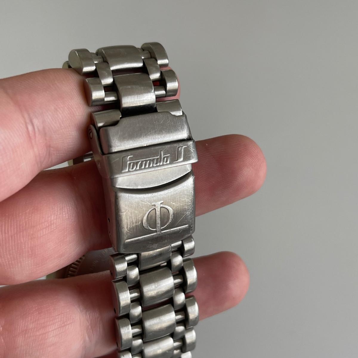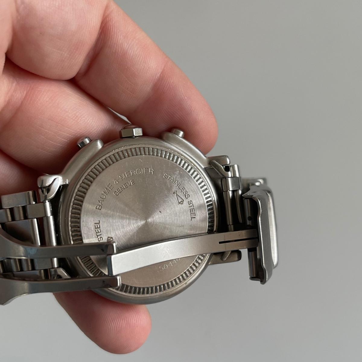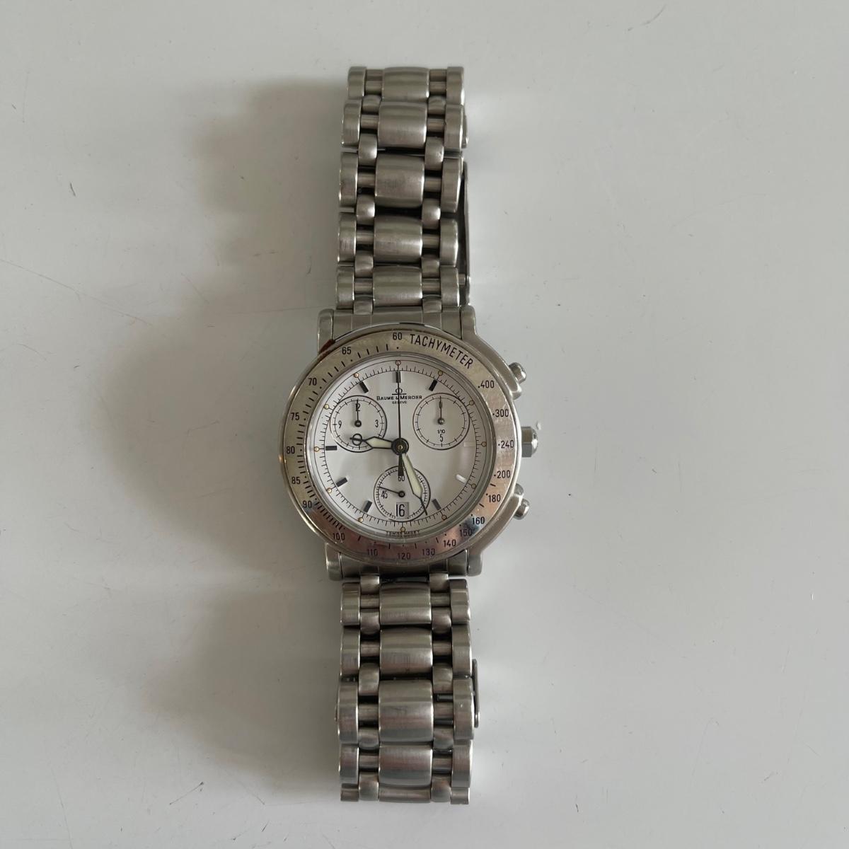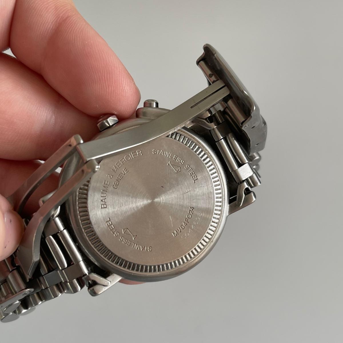 Stainless steel Baume & Mercier Tachymeter men’s watch. It is currently not ticking. Engraved on the back of the watch is “Baume & Mercier Geneve”, “Stainless Steel”, “MV04FO24”, and “5044698.”