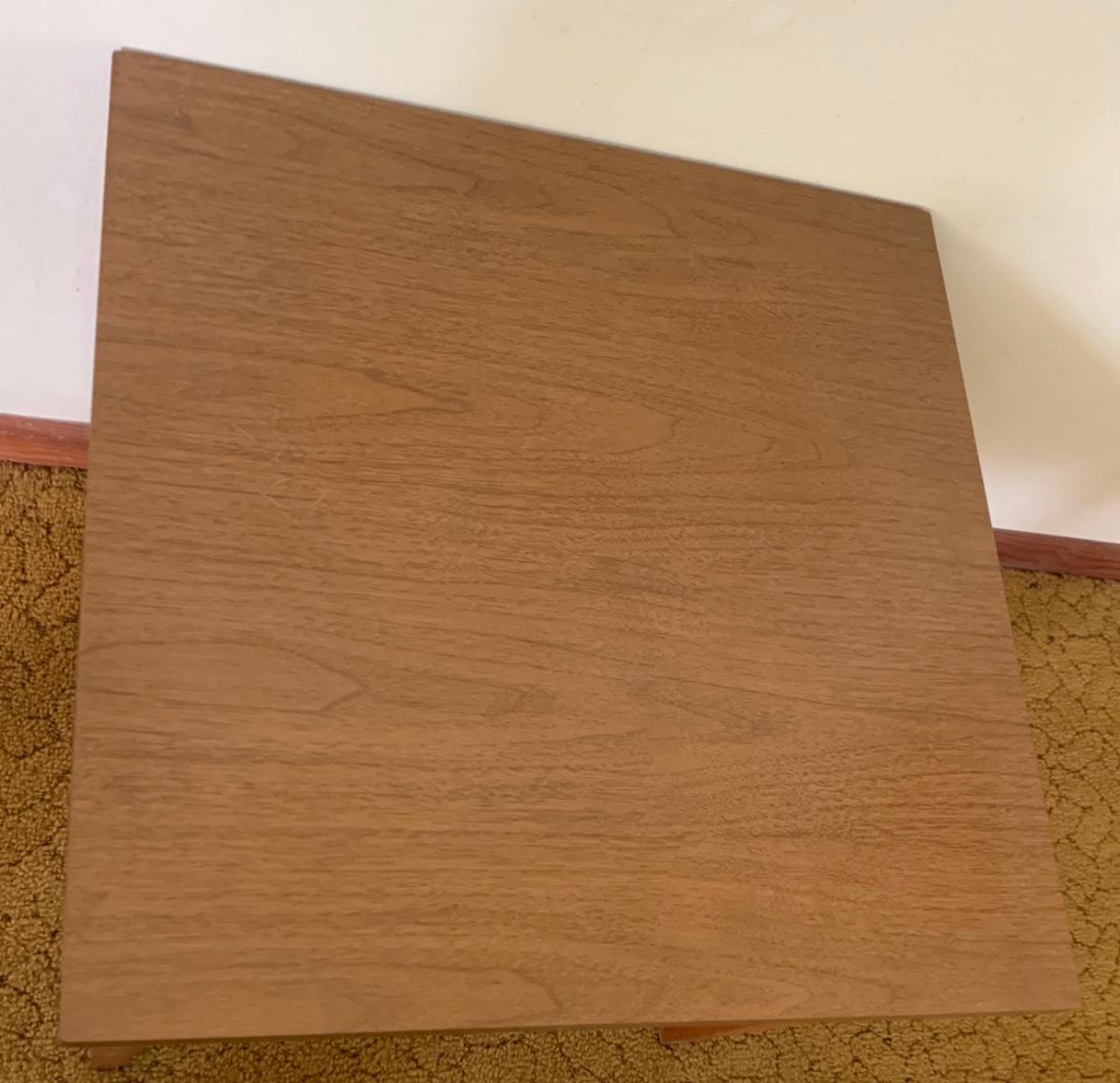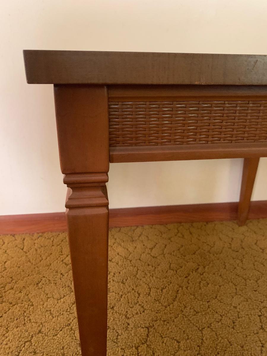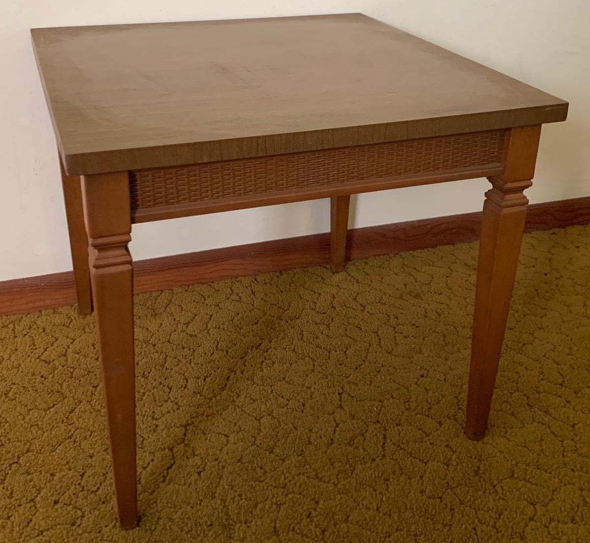 Baumritter "cane side" detail side table. Matches 3 cushion sofa, lounge chair, step down table, and coffee table. Masonite top.